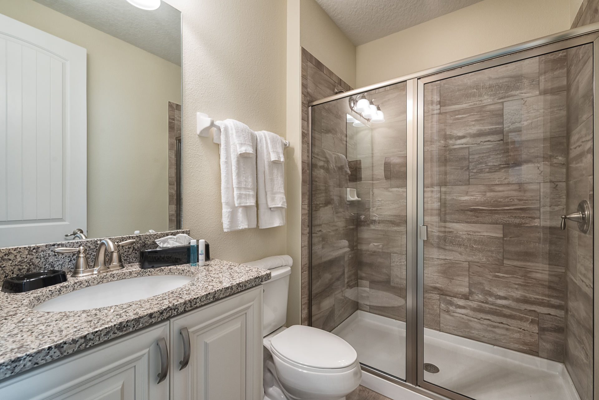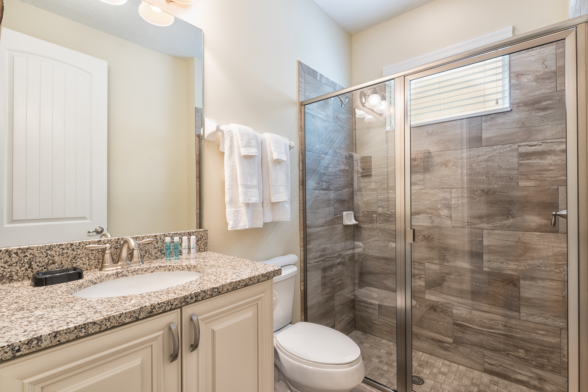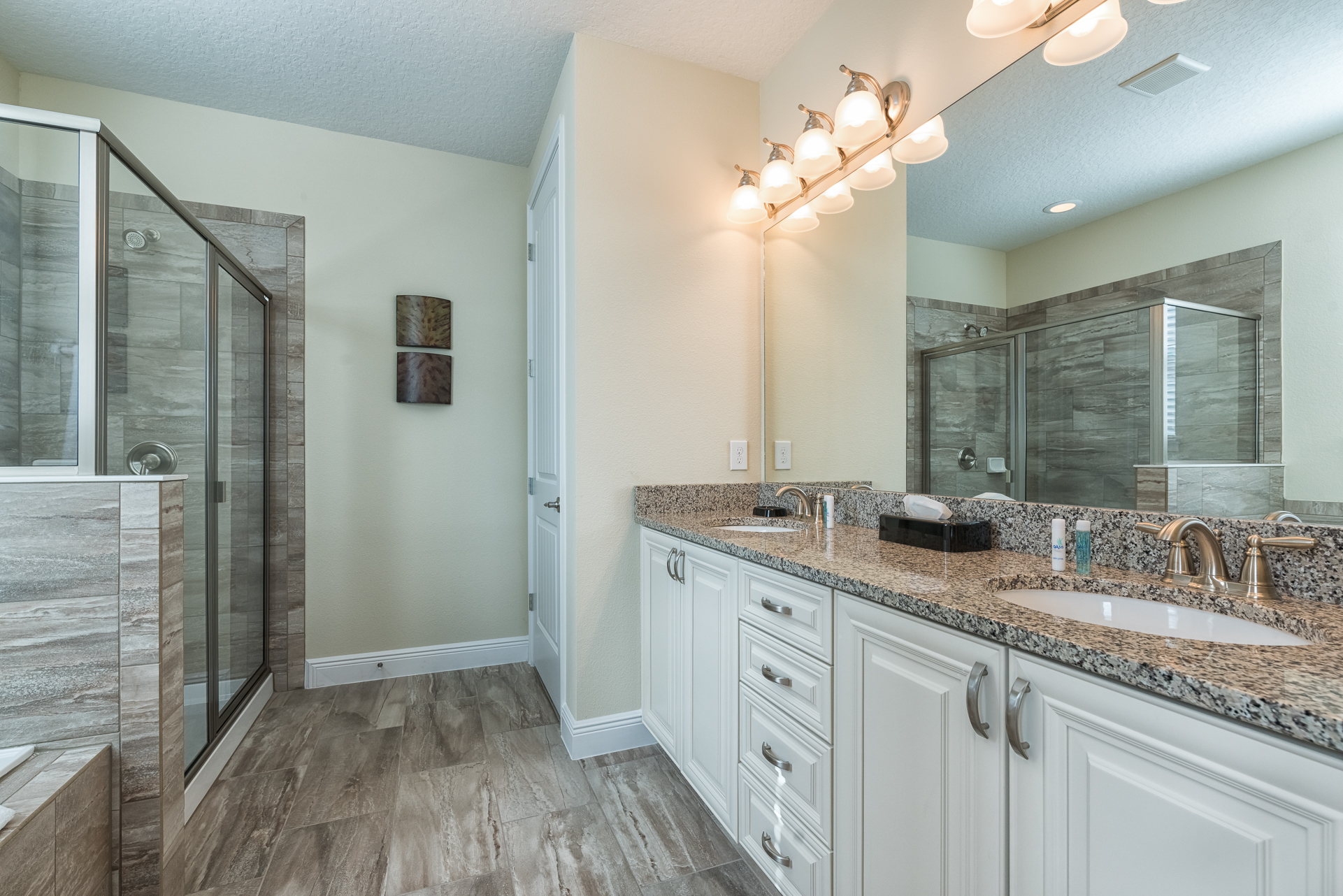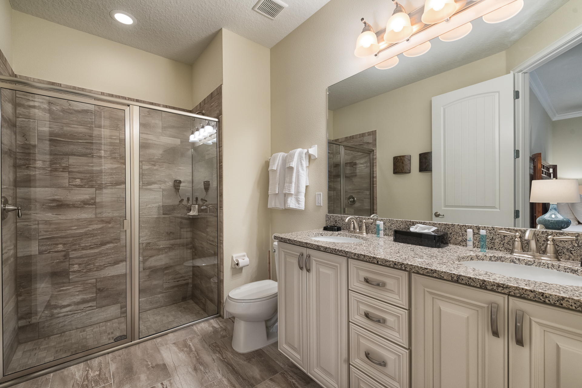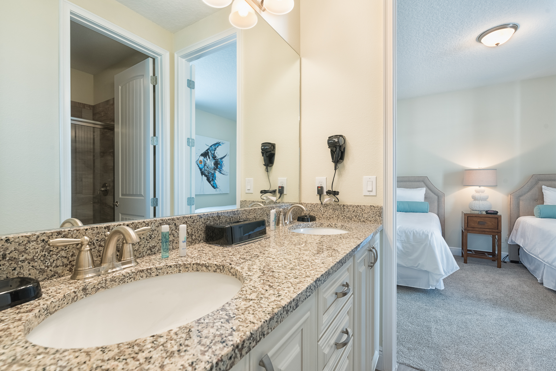 King sized bedroom with en suite (Jack/Jill style with a shower, twin vanities) connecting to a bedroom with 2x Twin sized beds