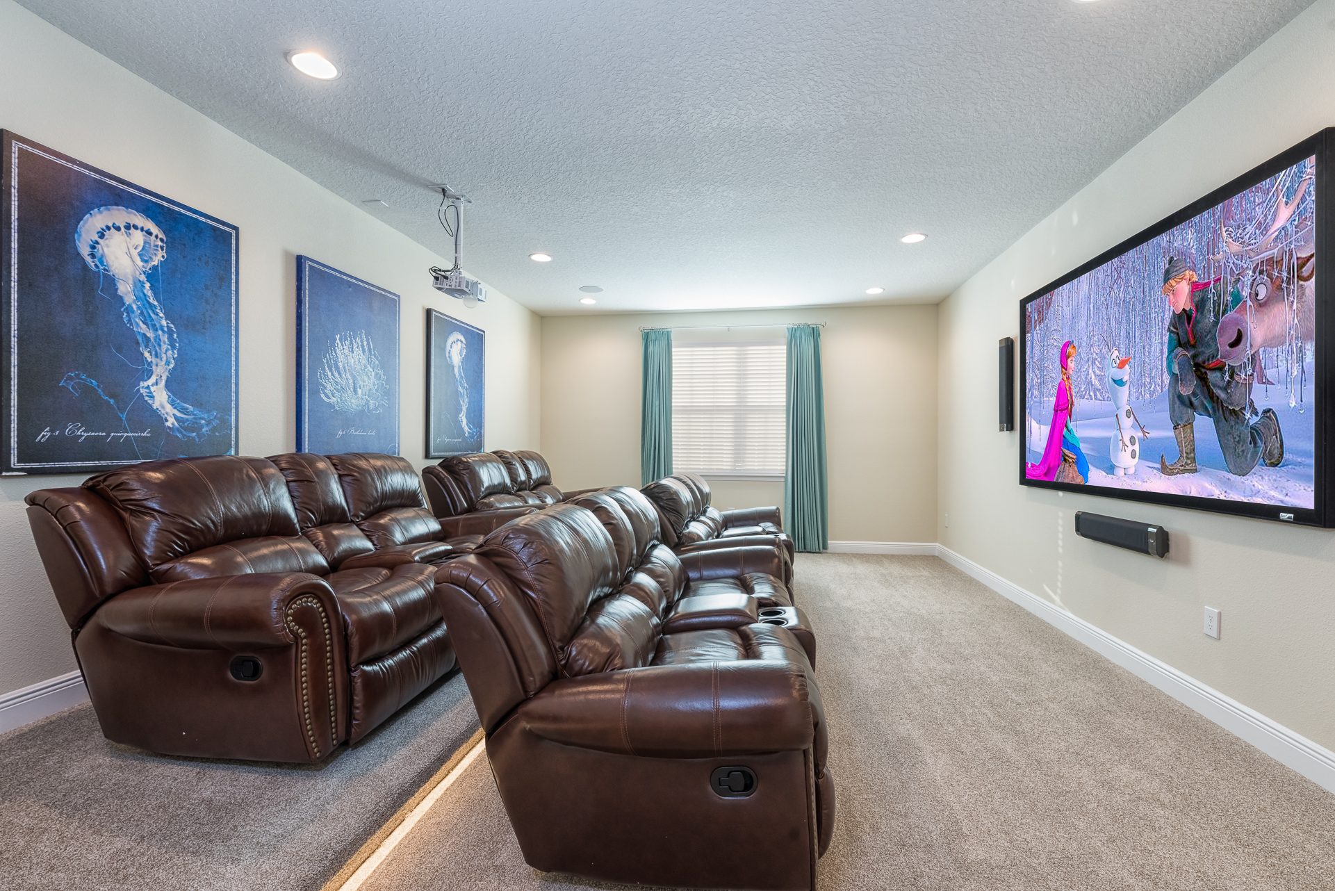 Home theater has 8x leather recliners and a large projection screen