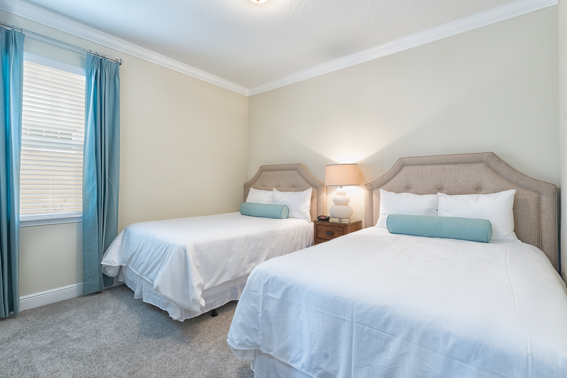 A bedroom with 2x Queen sized beds and an en suite (shower, tub, twin vanities)