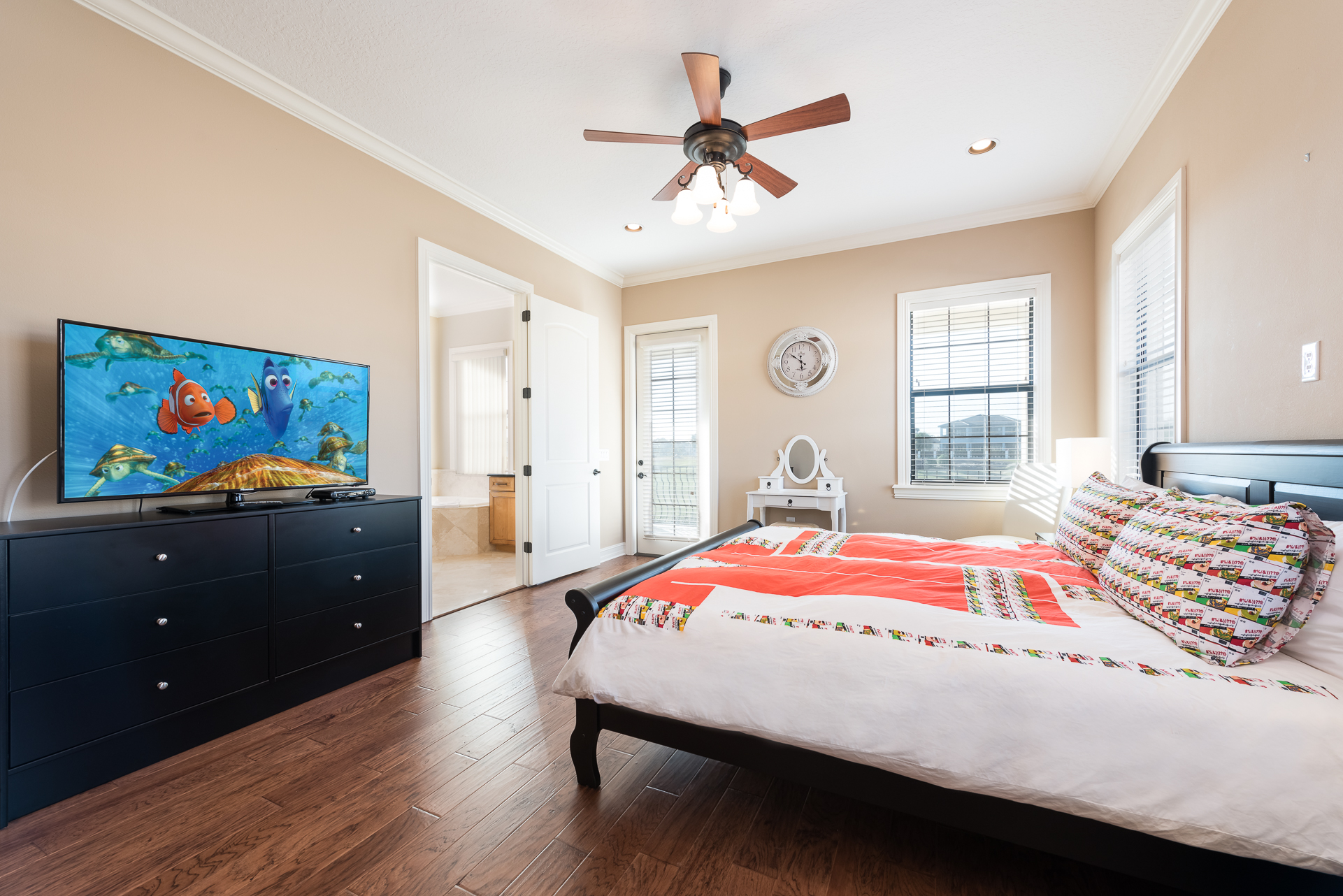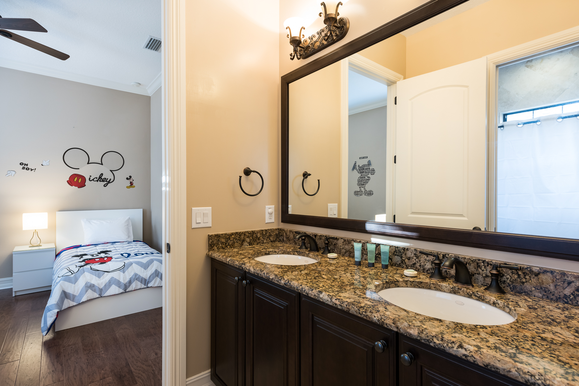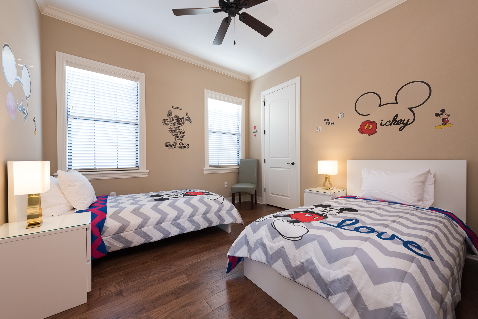 Queen sized bedroom with en suite (Jack/Jill style-shower/bath combo, twin vanities) connecting to a 'Mickey Mouse' themed bedroom with 2x Twin sized beds