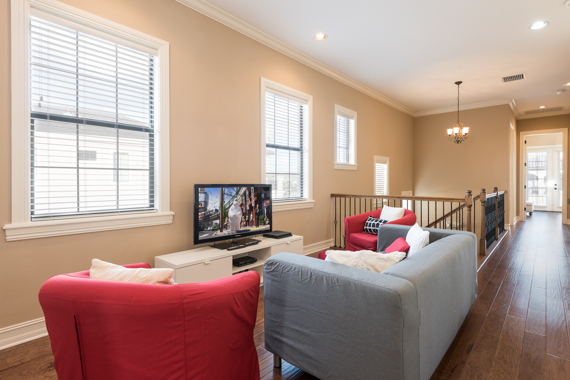 Upper floor loft area has a comfortable sofa, large flat screen TV with a PS4 video game console, and 2x accent chairs