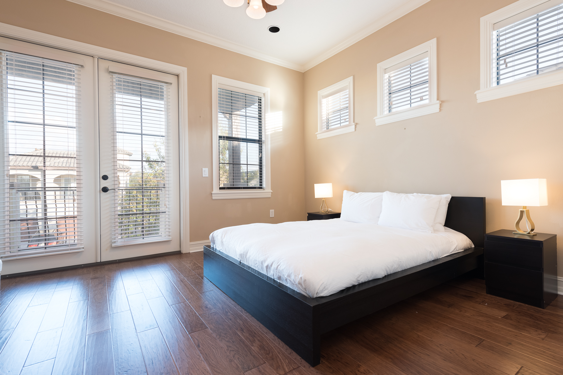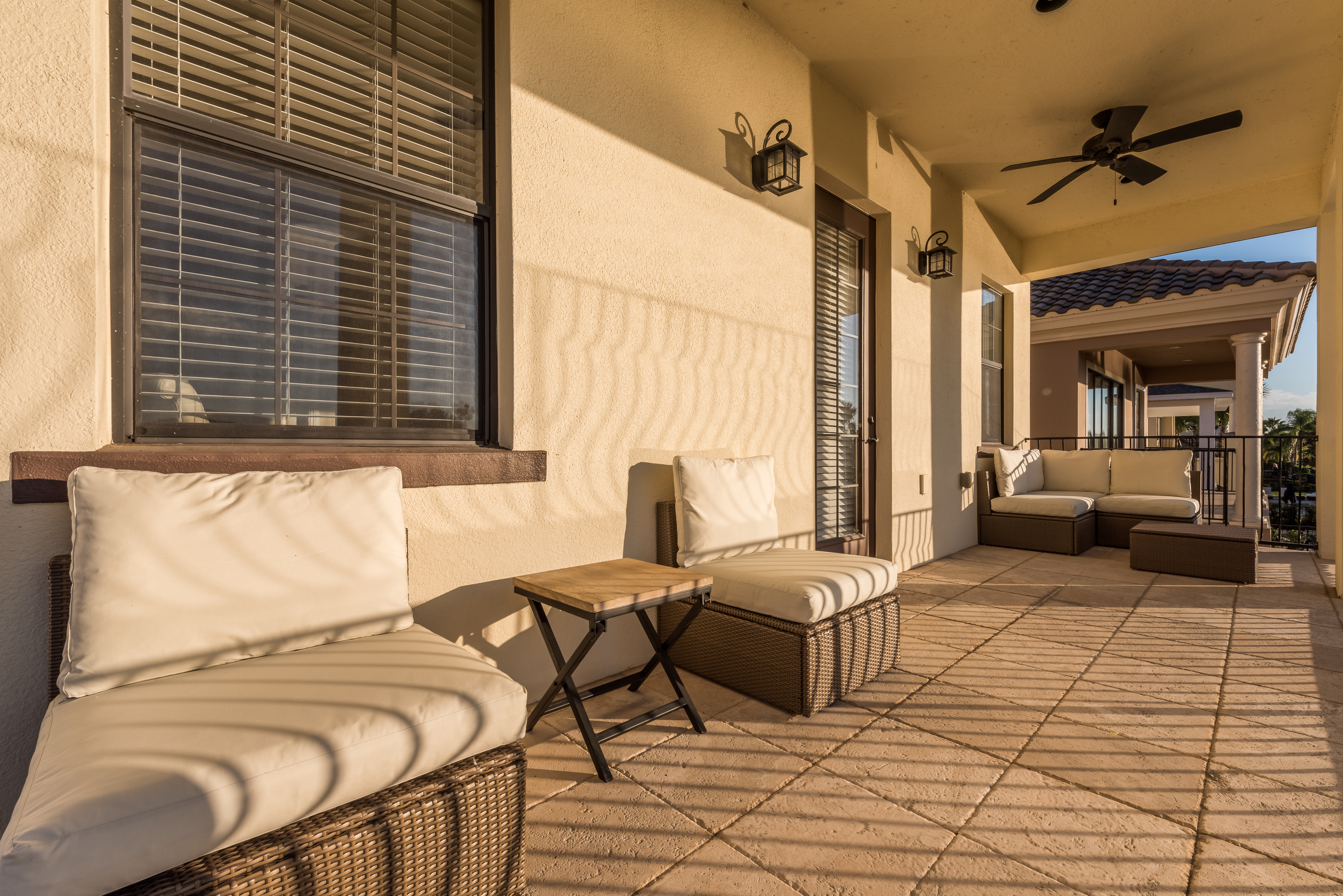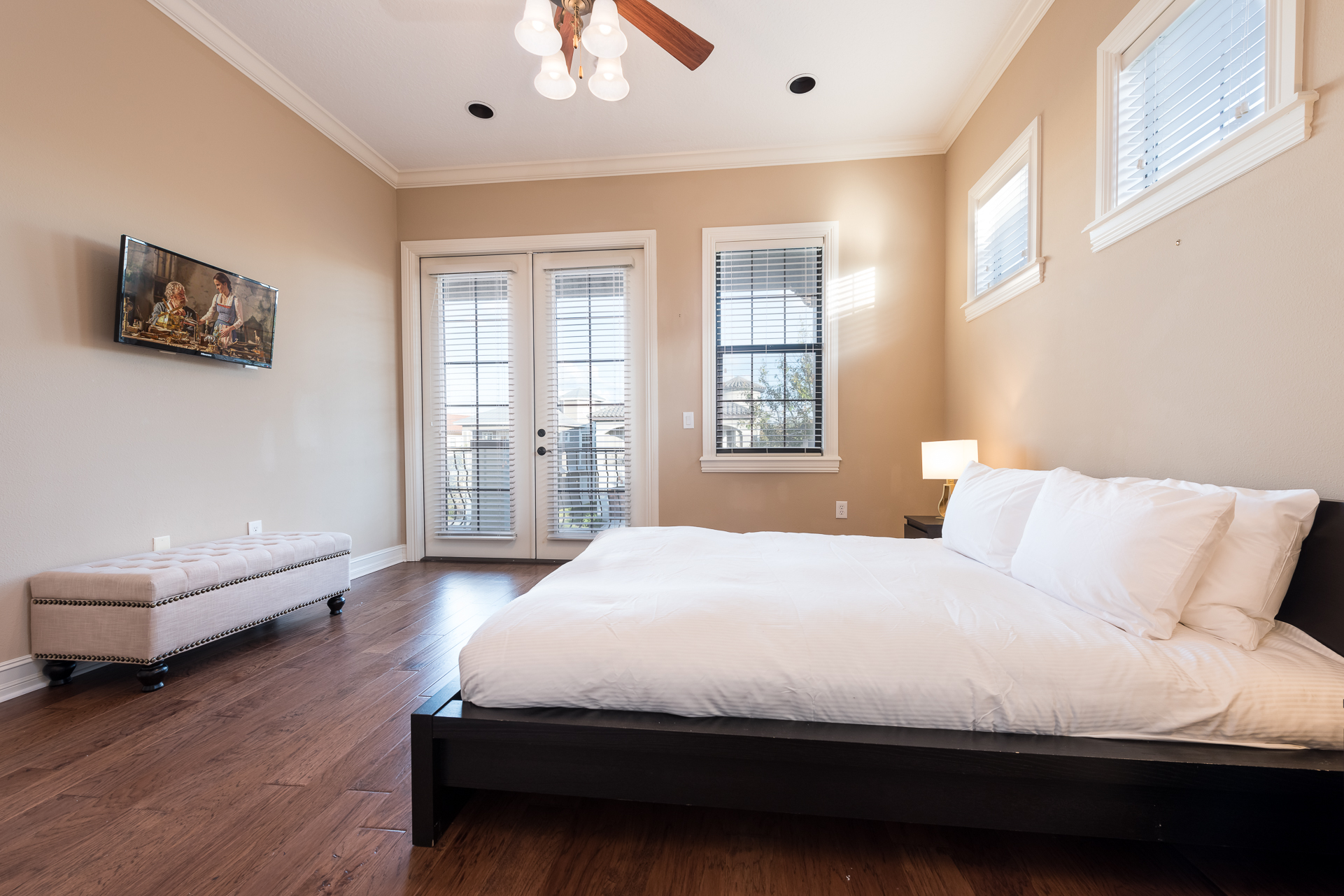King sized Master with en suite (shower, tub, two separate vanities), an accent chair, and a private balcony over the pool deck (2x patio chairs, outdoor sectional)