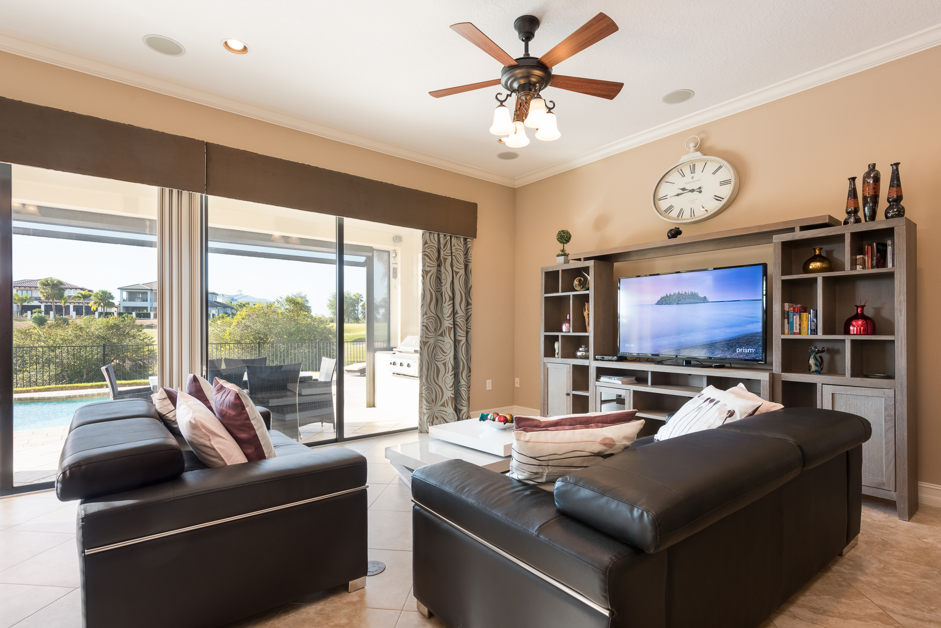 Spacious comfortable seating area with 2x sofas overlooking the private pool deck through sliding glass doors
