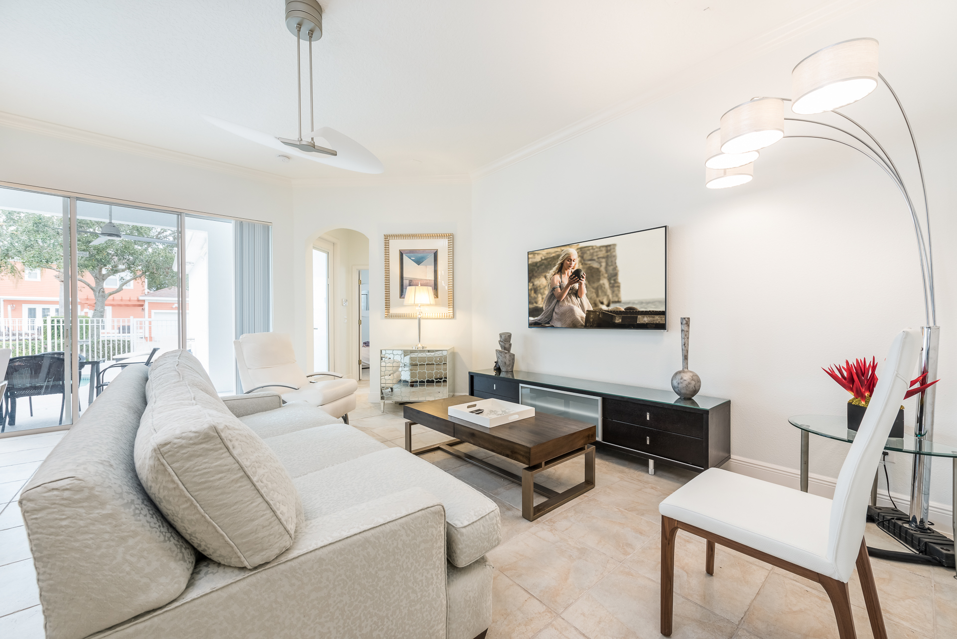 Spacious comfortable seating area with a sofa and 2x accent chairs overlooking the private pool deck through sliding glass doors
