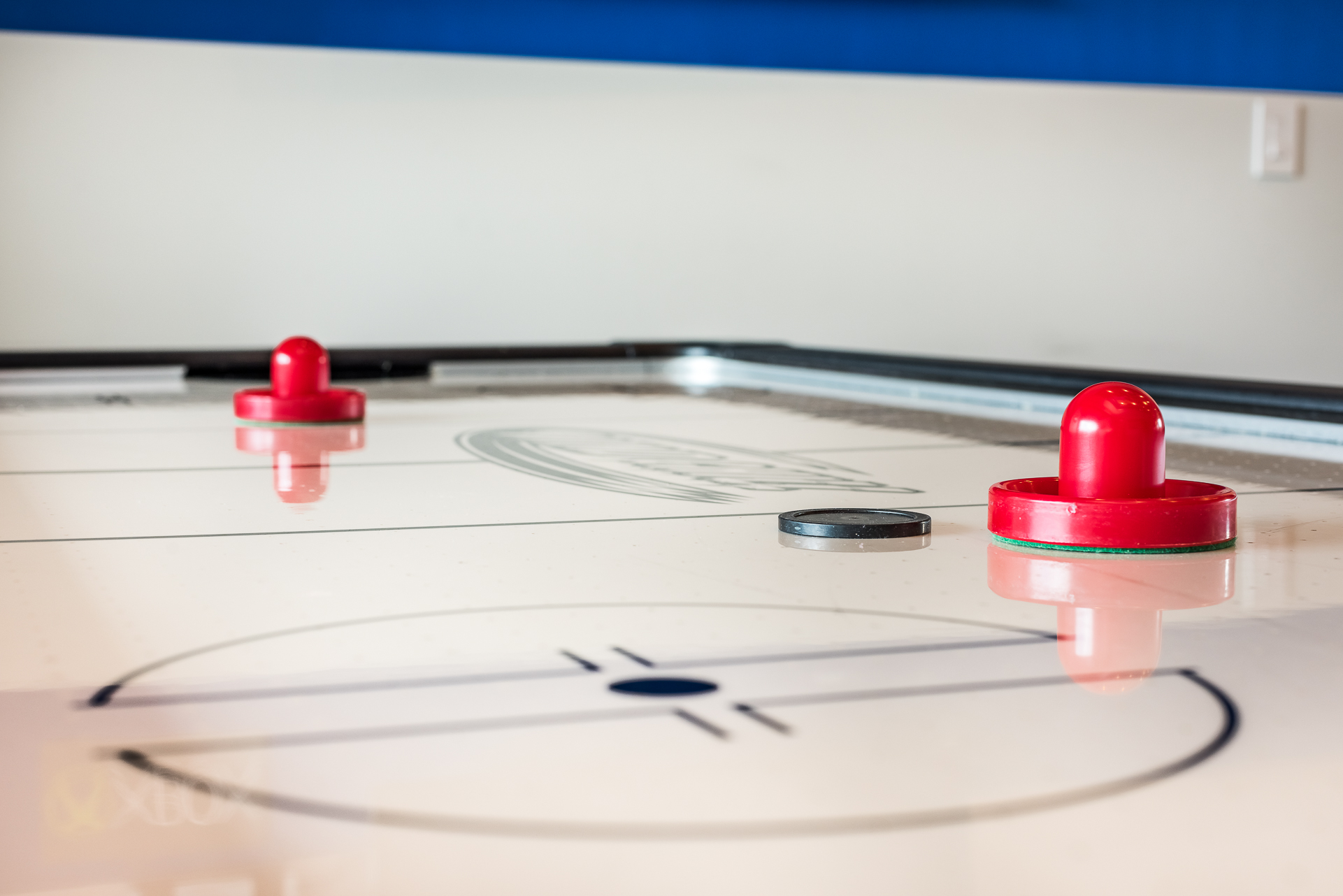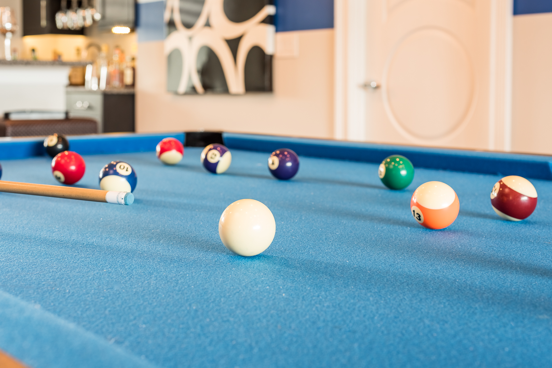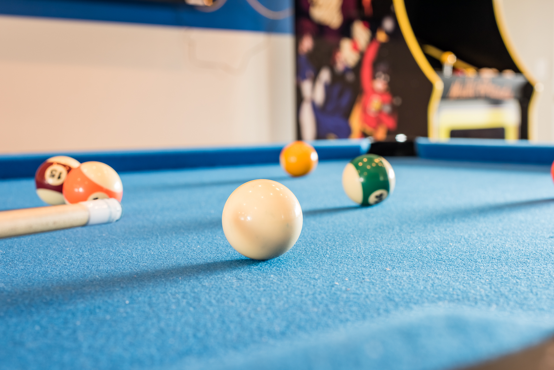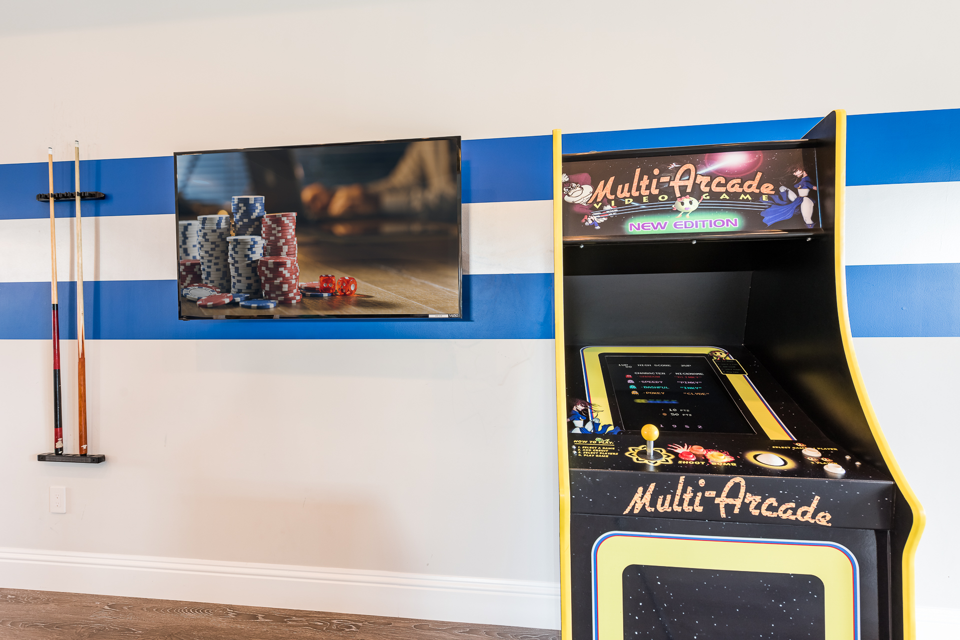 Games room with a pool and air hockey table, three flat screen TV's, PS4 and X-Box One video game consoles, and a multi arcade video game