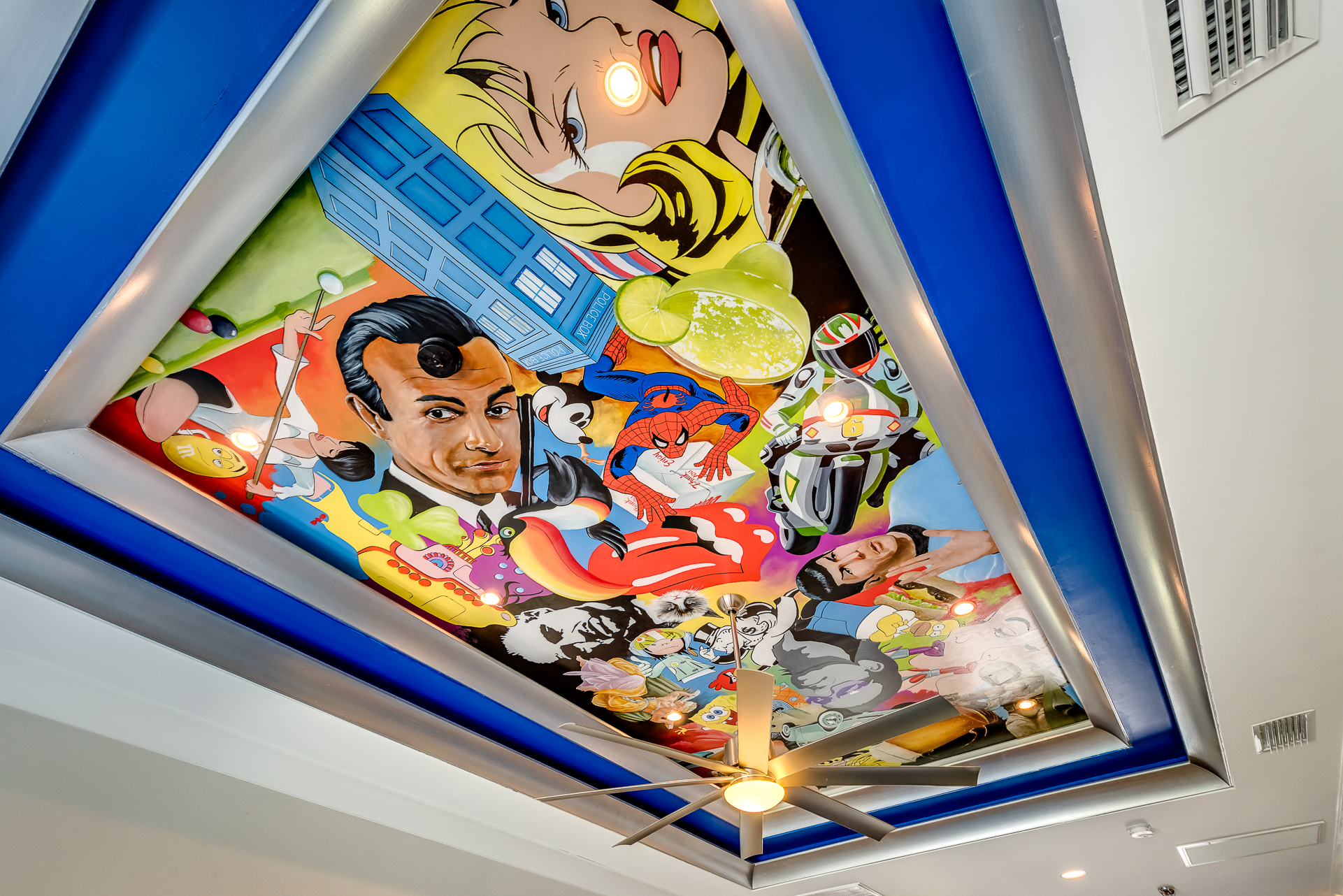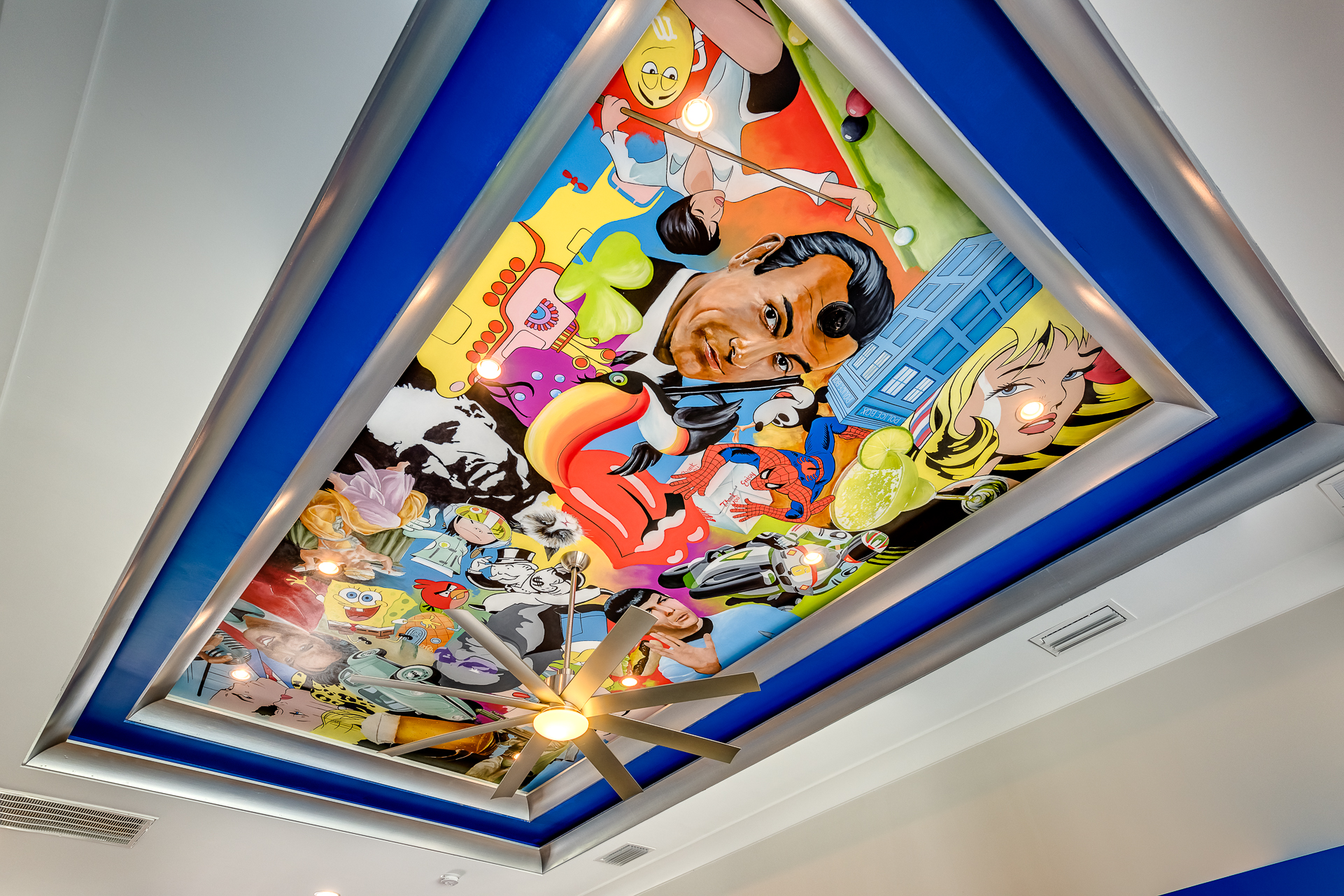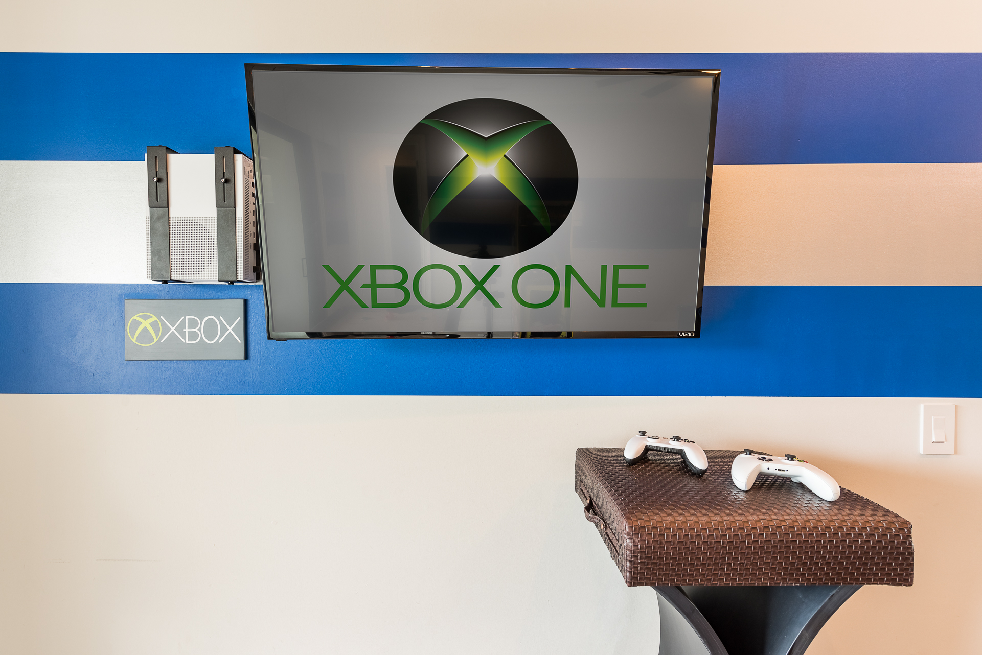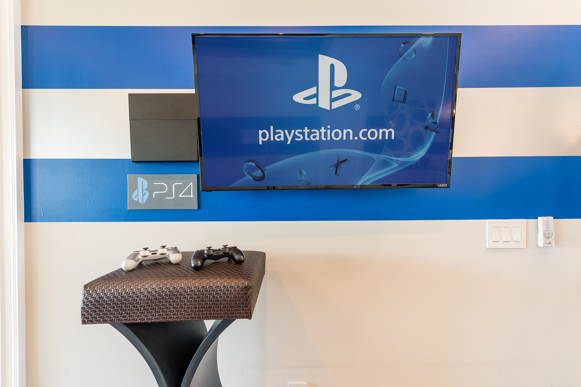 Games room with a pool and air hockey table, three flat screen TV's, PS4 and X-Box One video game consoles, and a multi arcade video game