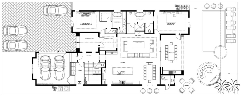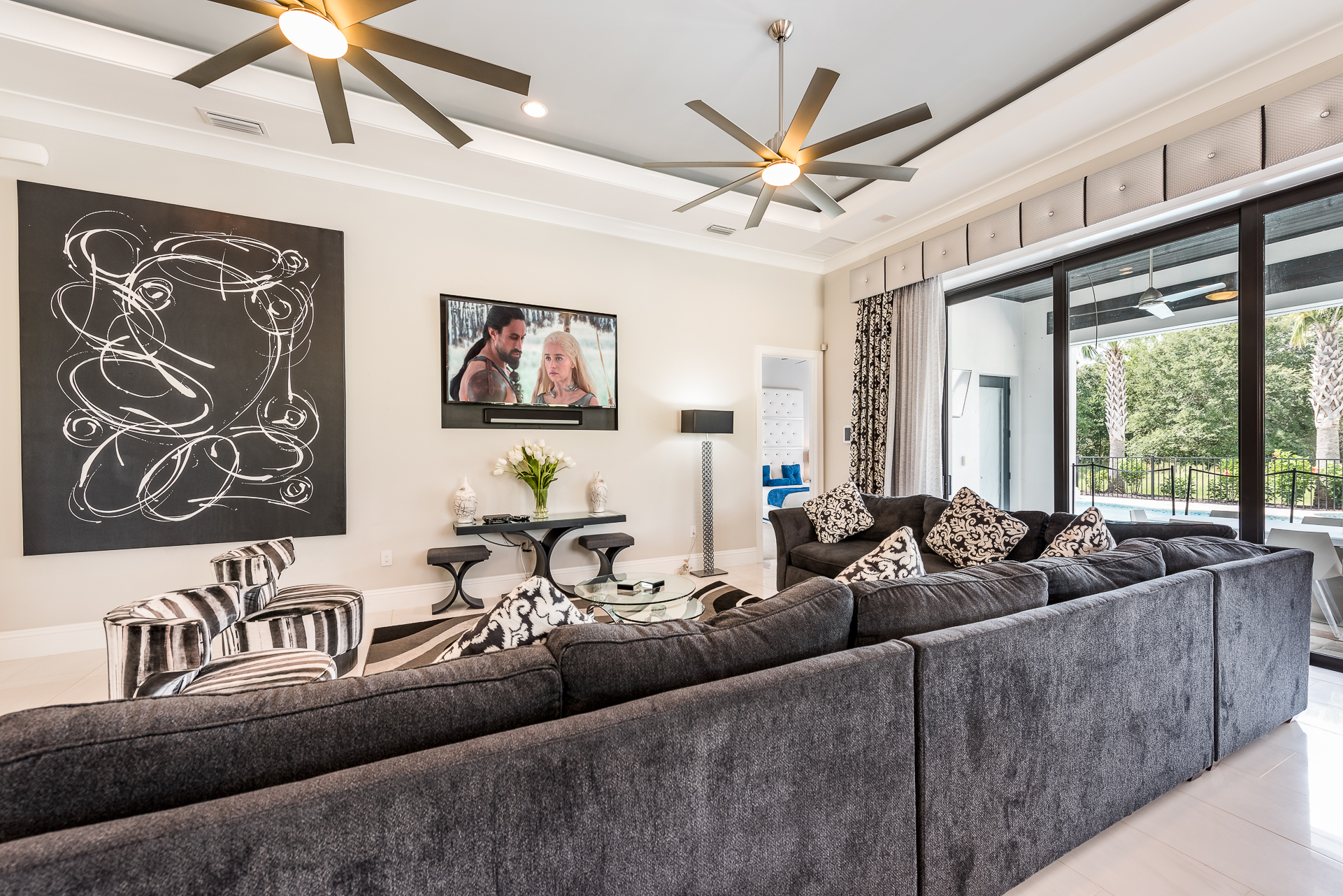 Spacious comfortable seating area with a large sectional and two accent chairs overlooking the private pool deck through sliding glass doors