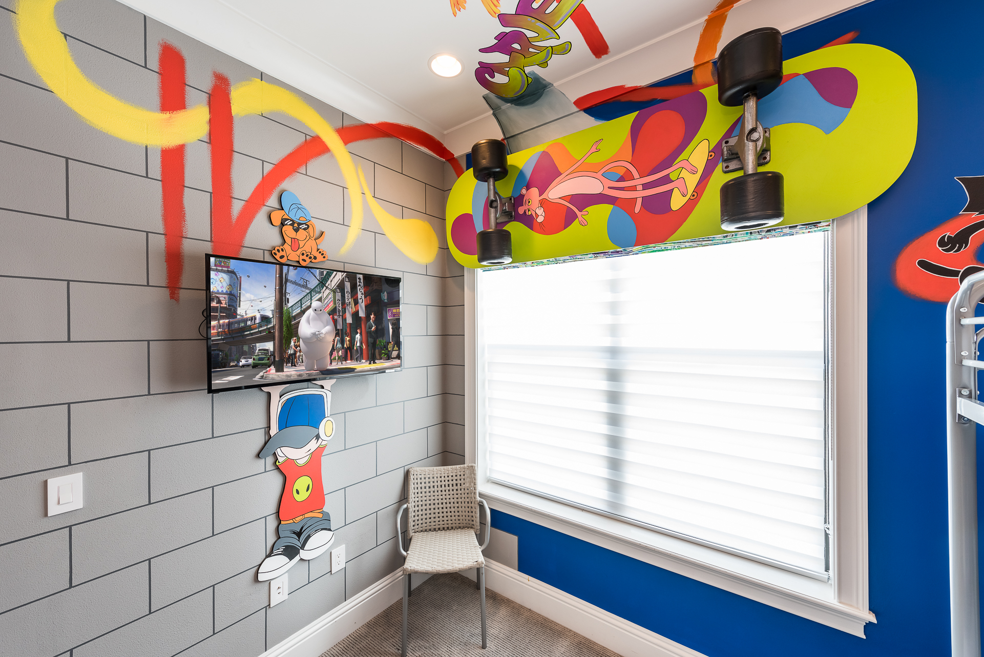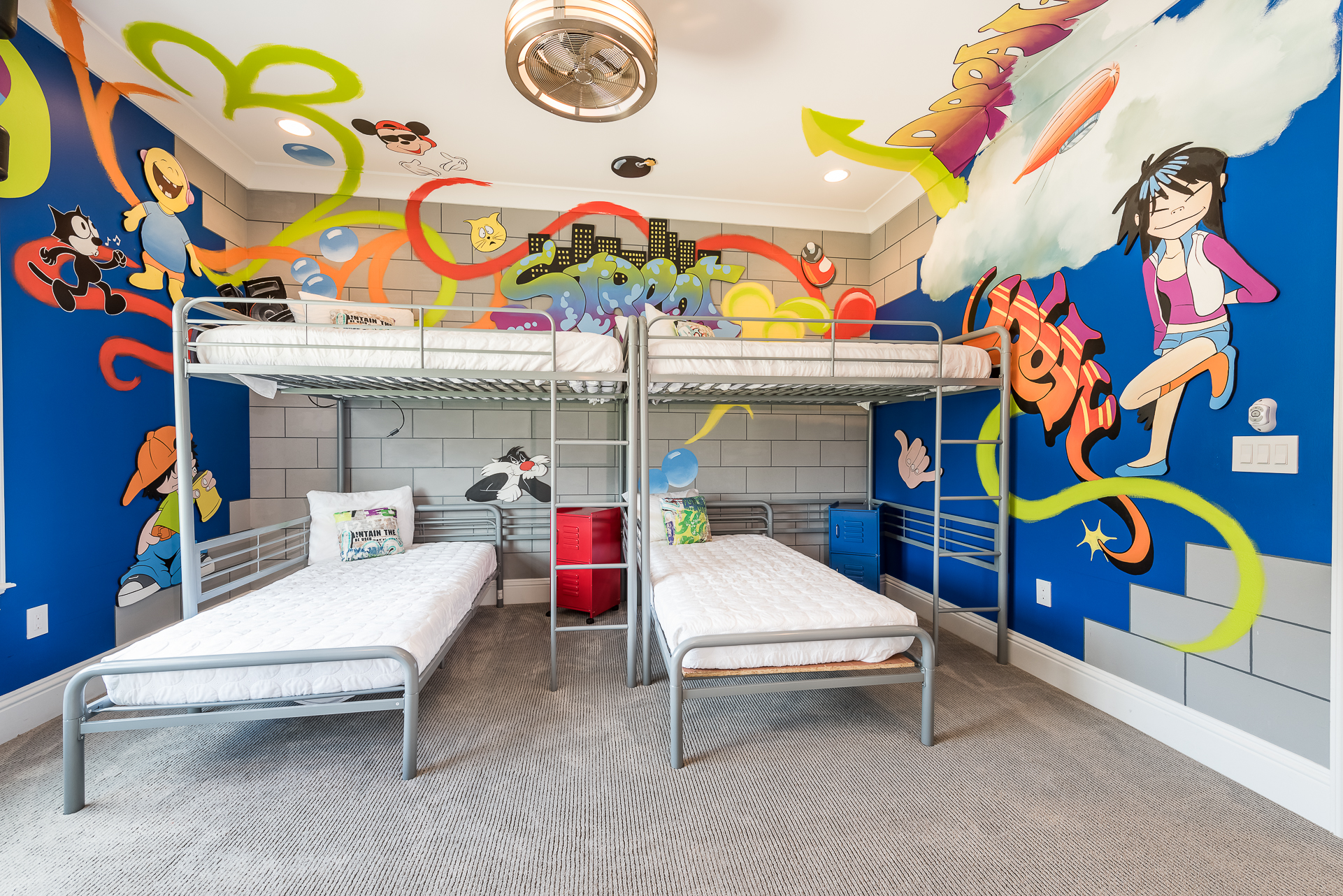 Sleeping up to 14 guests, this home provides bedrooms across both floors, privacy, and spacious living quarters with a modern flare. A skateboarding themed bedroom has two sets of bunk beds perfect for the younger ones!