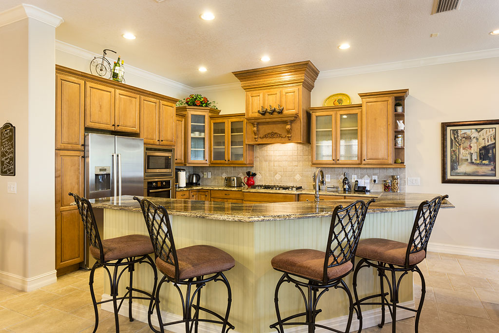 The spacious open layout, provides a beautiful ground floor family area, complete with a fully equipped kitchen, with granite counter tops, 4 seat island breakfast bar, dishwasher, refrigerator, freezer, microwave and oven.
