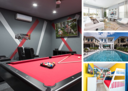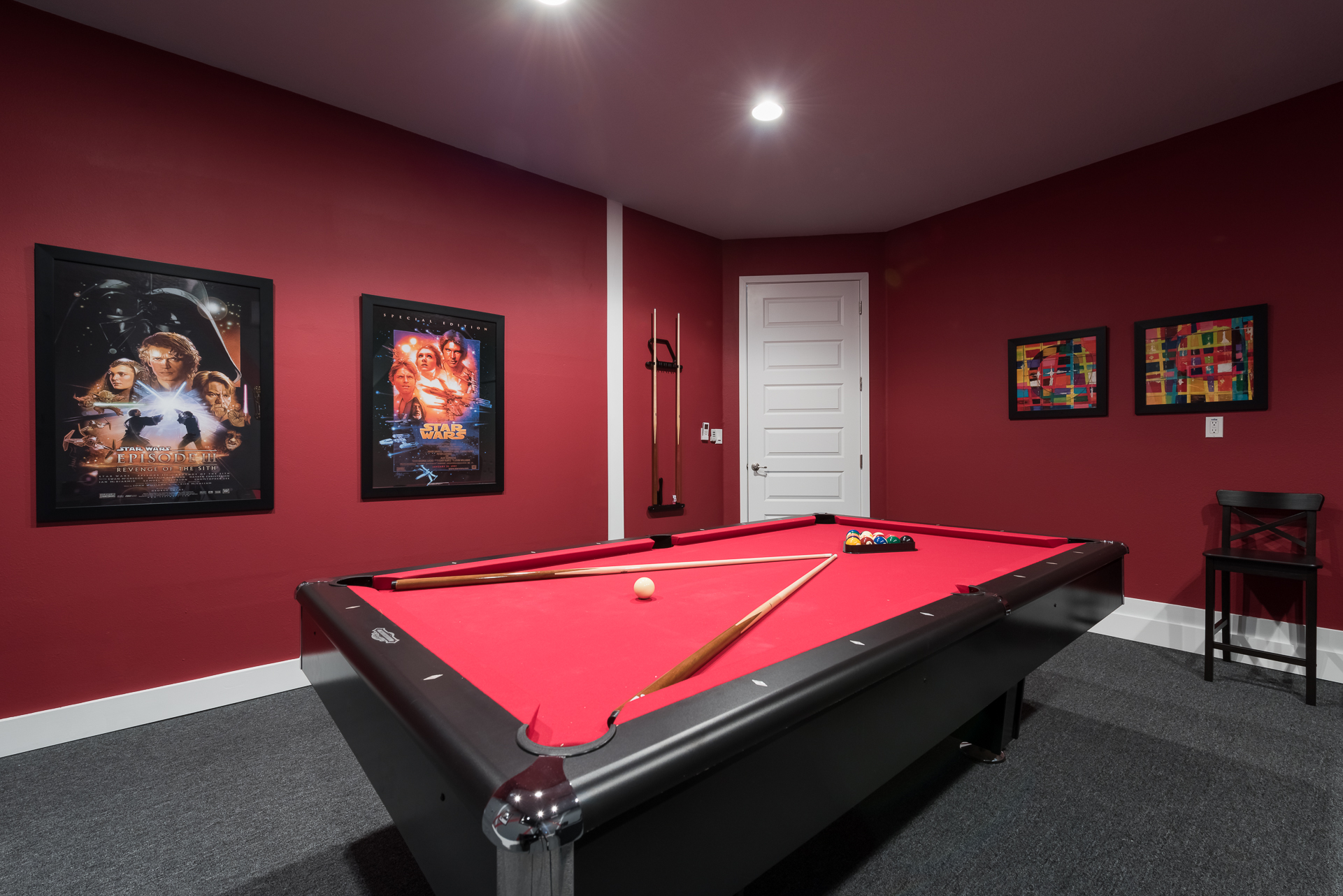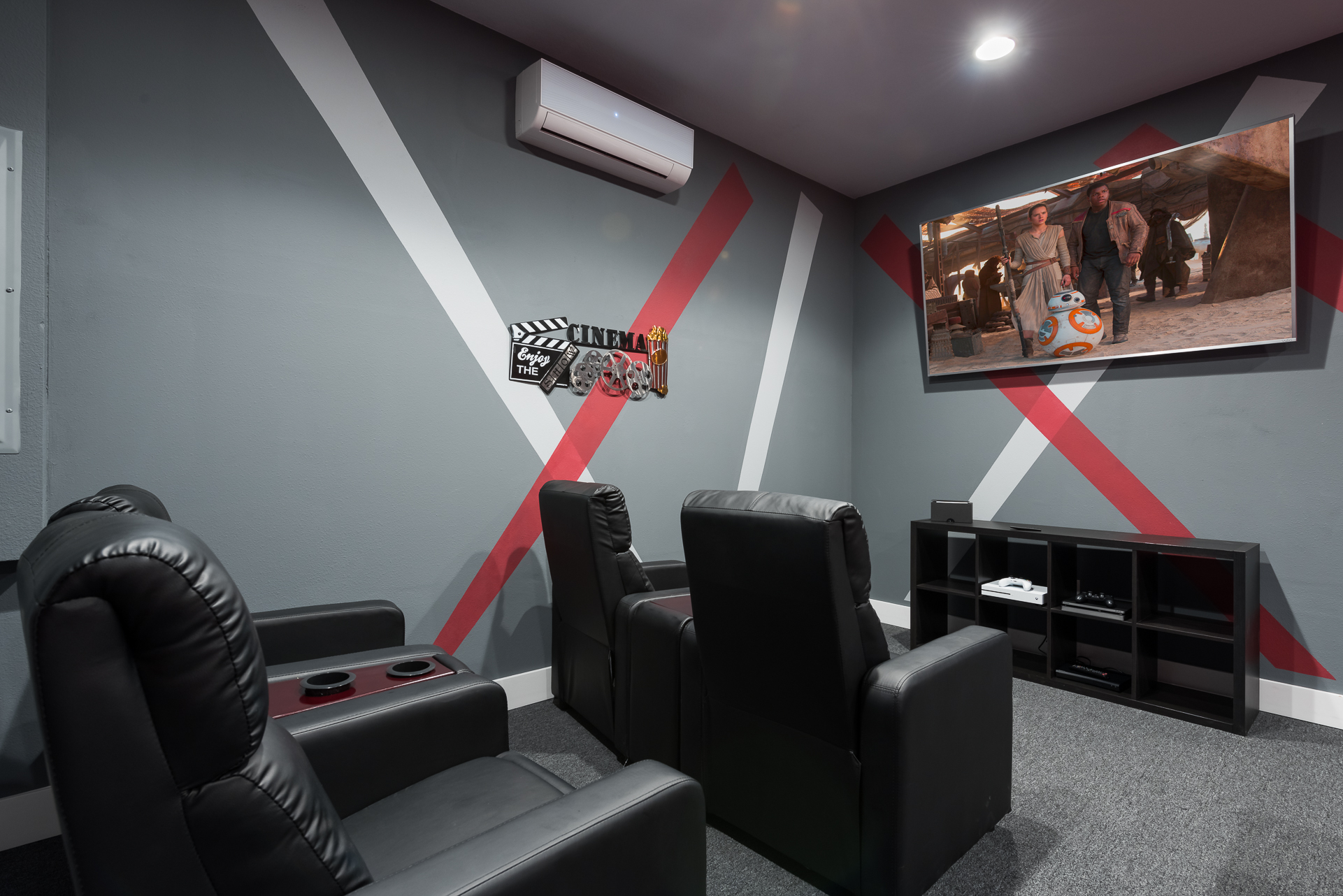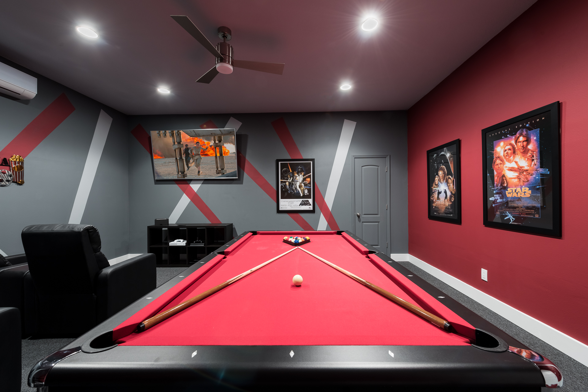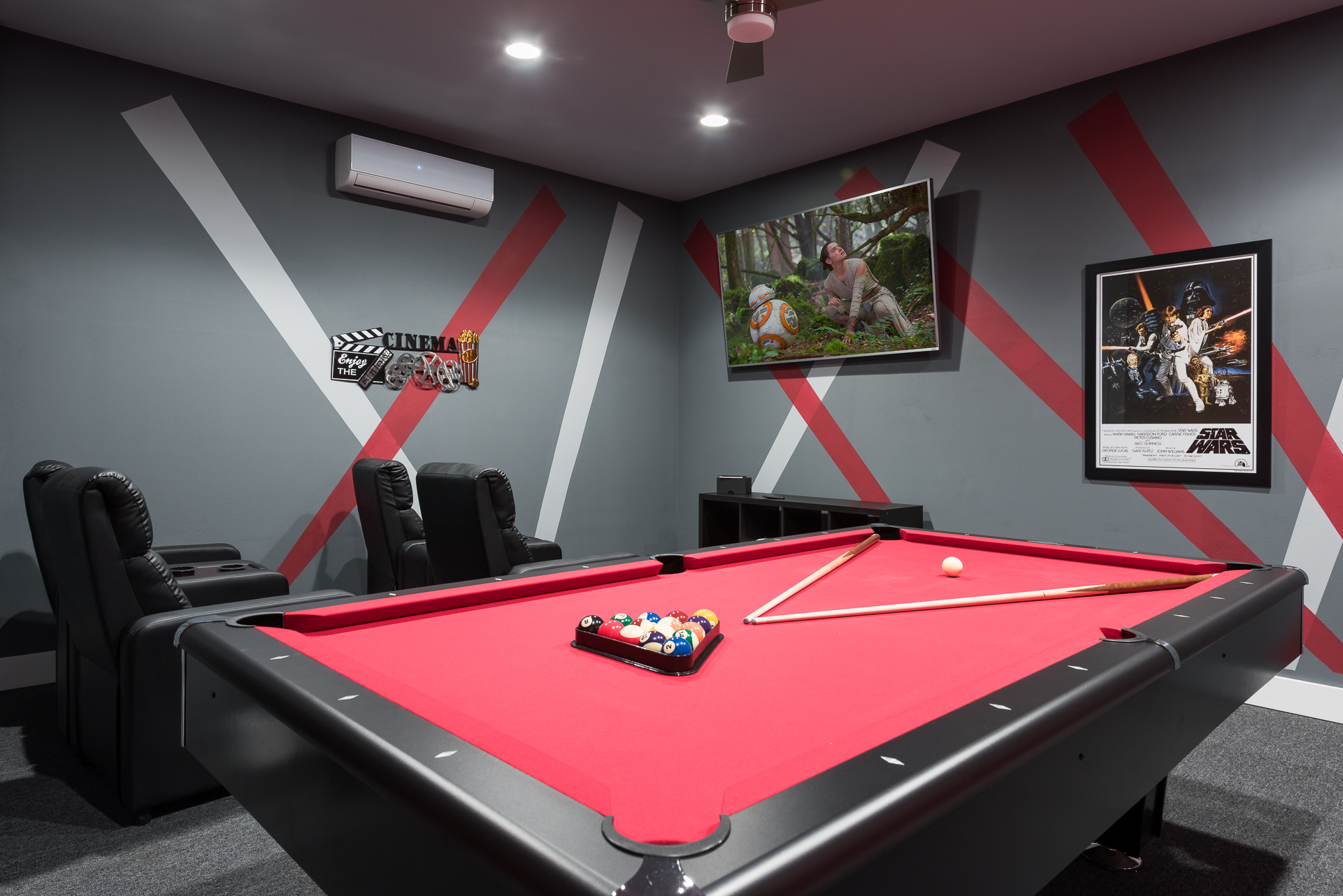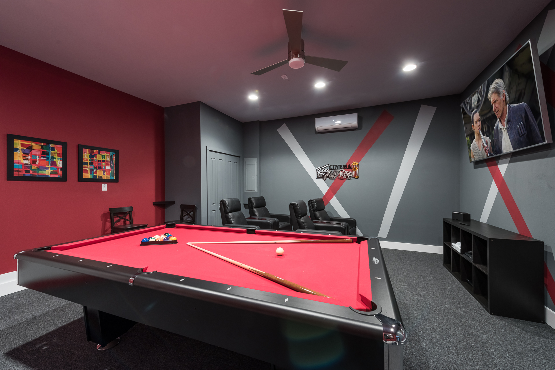 Games room has a large flat screen TV with an X-Box One and PS4 video game console, pool table, 4x movie theater seats, and a 2 seat high top table