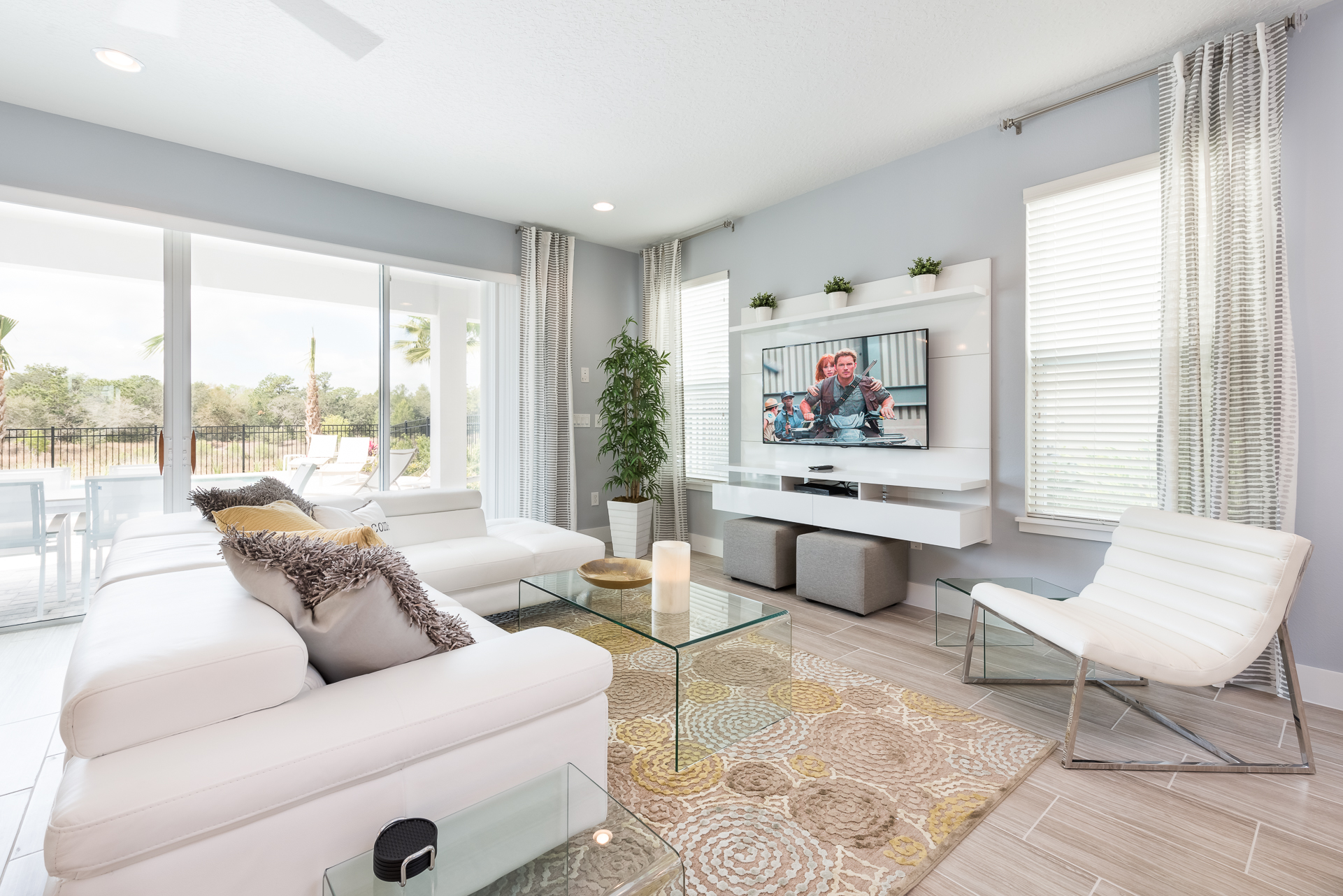 Spacious comfortable seating area with a leather sectional and an accent chair overlooking the private pool deck through sliding glass doors