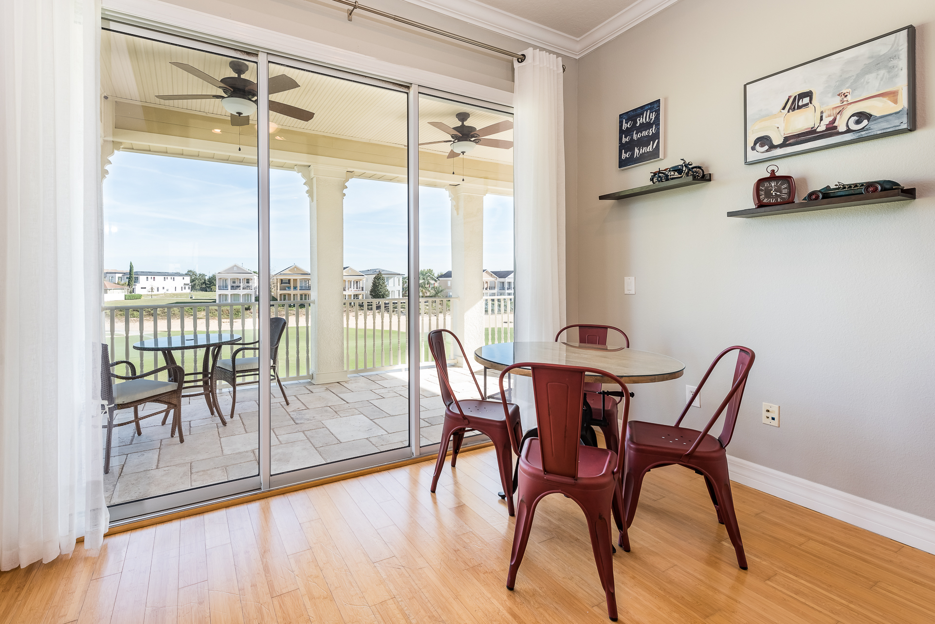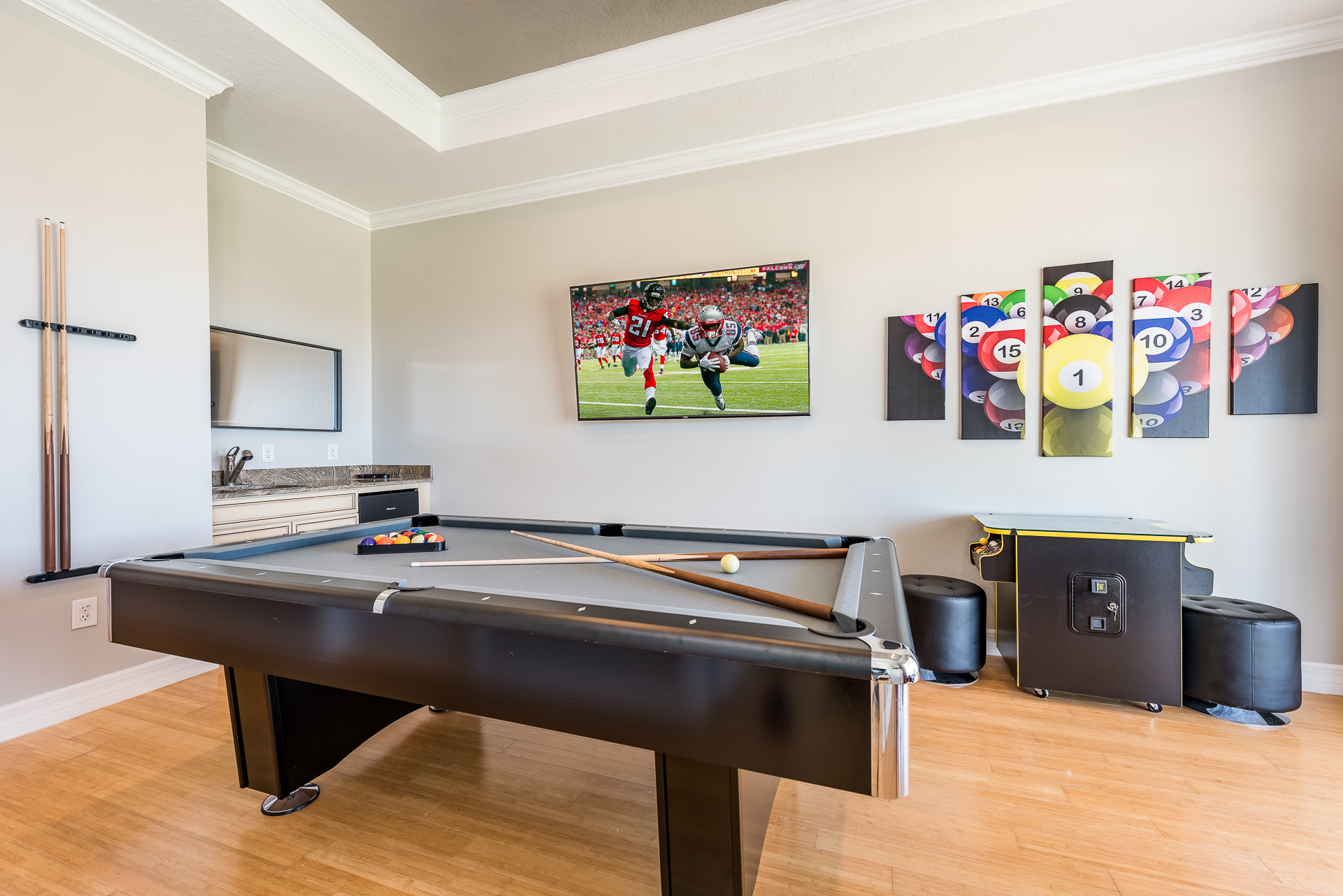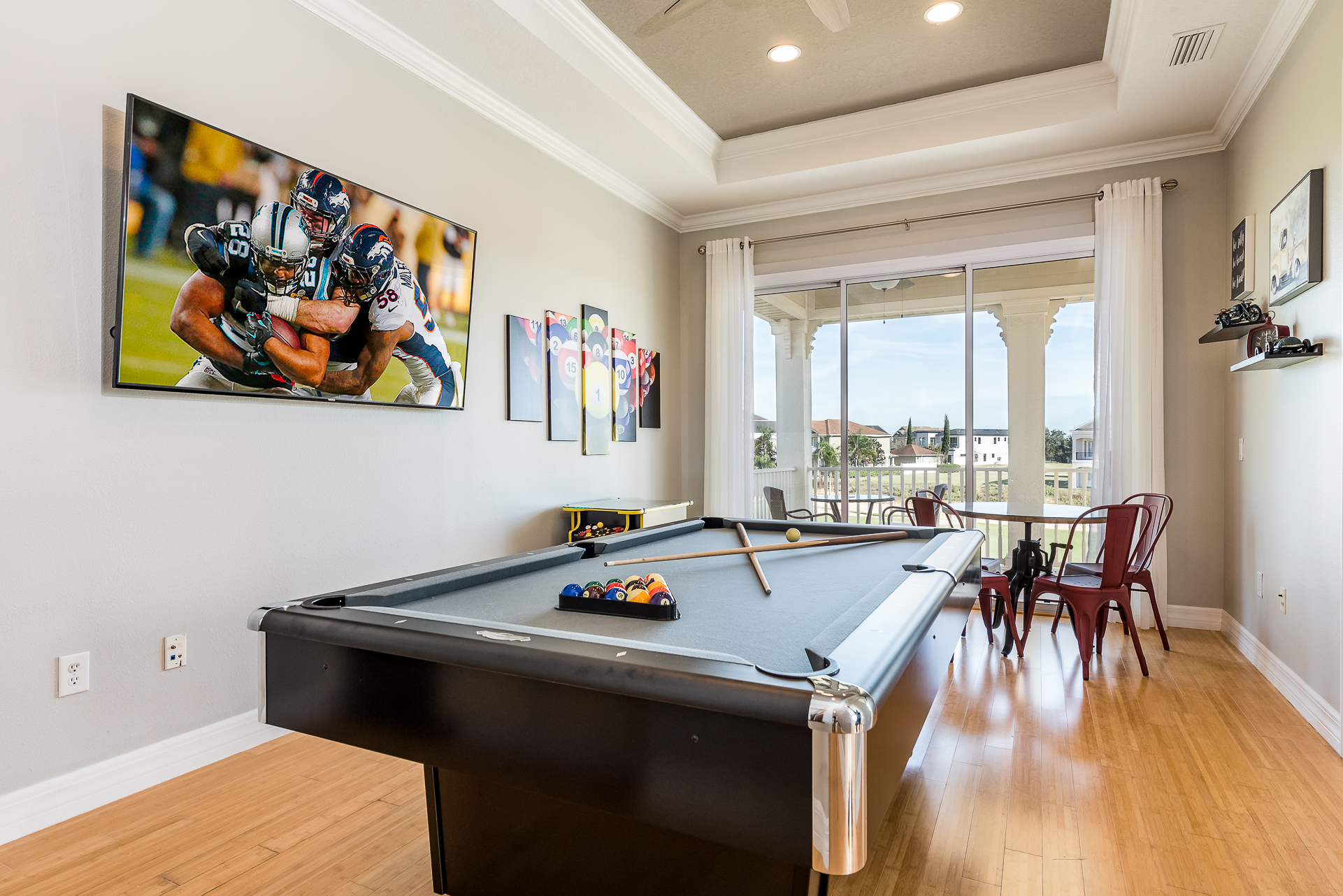 Upper floor loft area has a large flat screen TV, pool table, wet bar, 4x seat table, multi-arcade video game, balcony access over the golf course