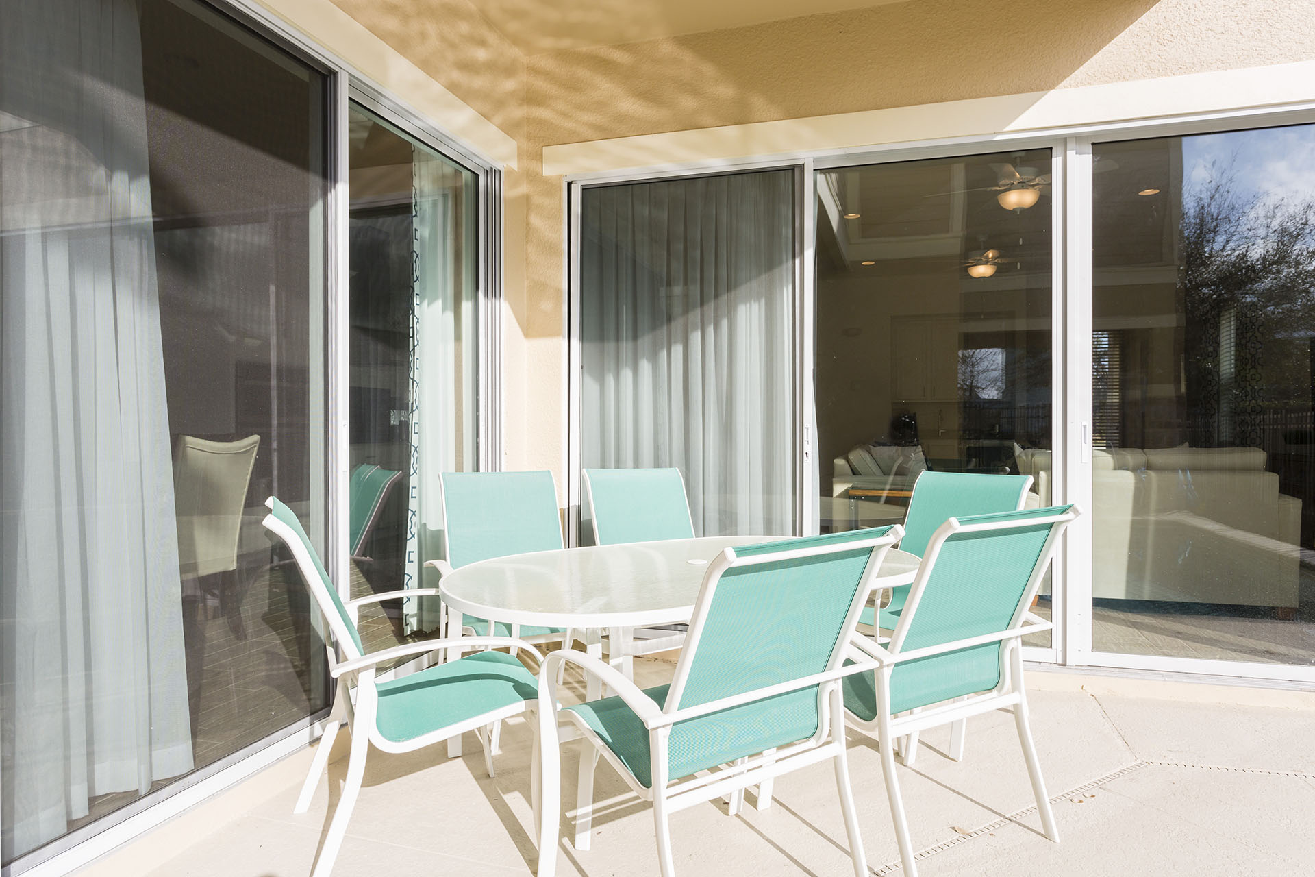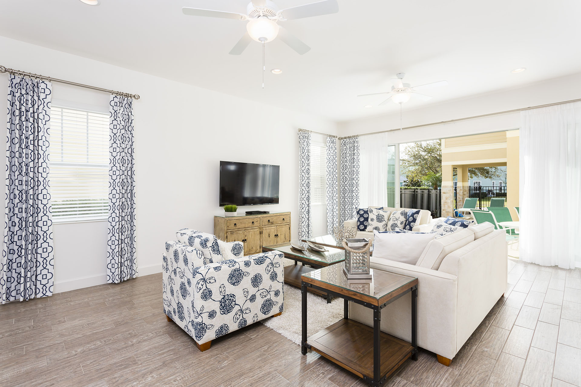 Spacious comfortable seating area with 2x sofas and an accent chair overlooking the private pool deck through sliding glass doors