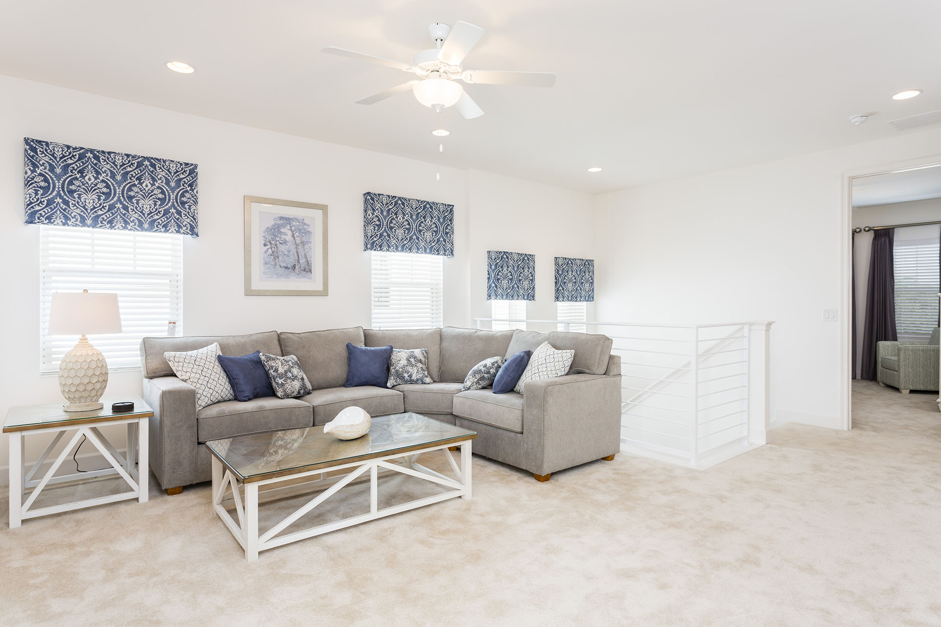 Upper floor loft area has a large flat screen TV and a comfortable sectional