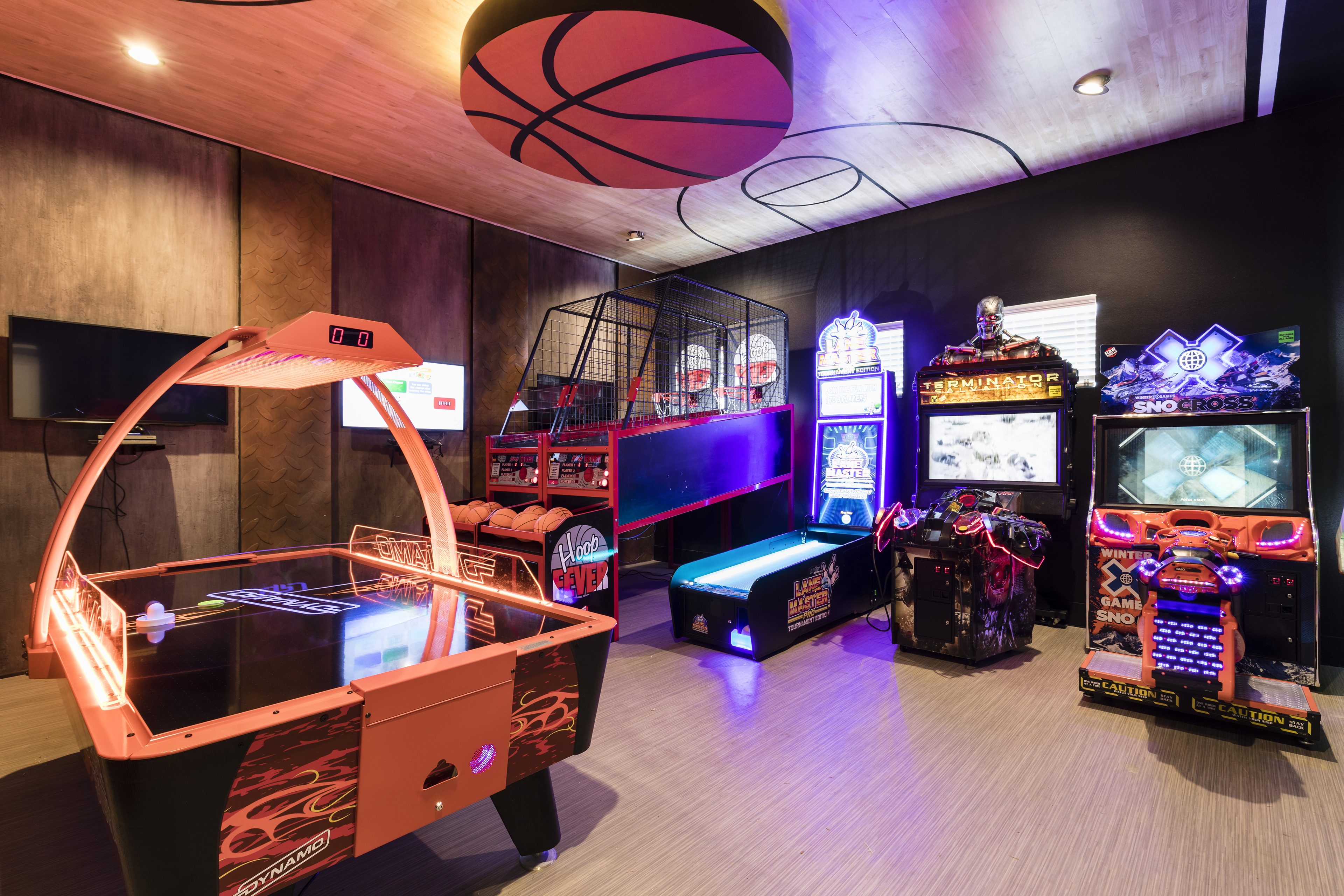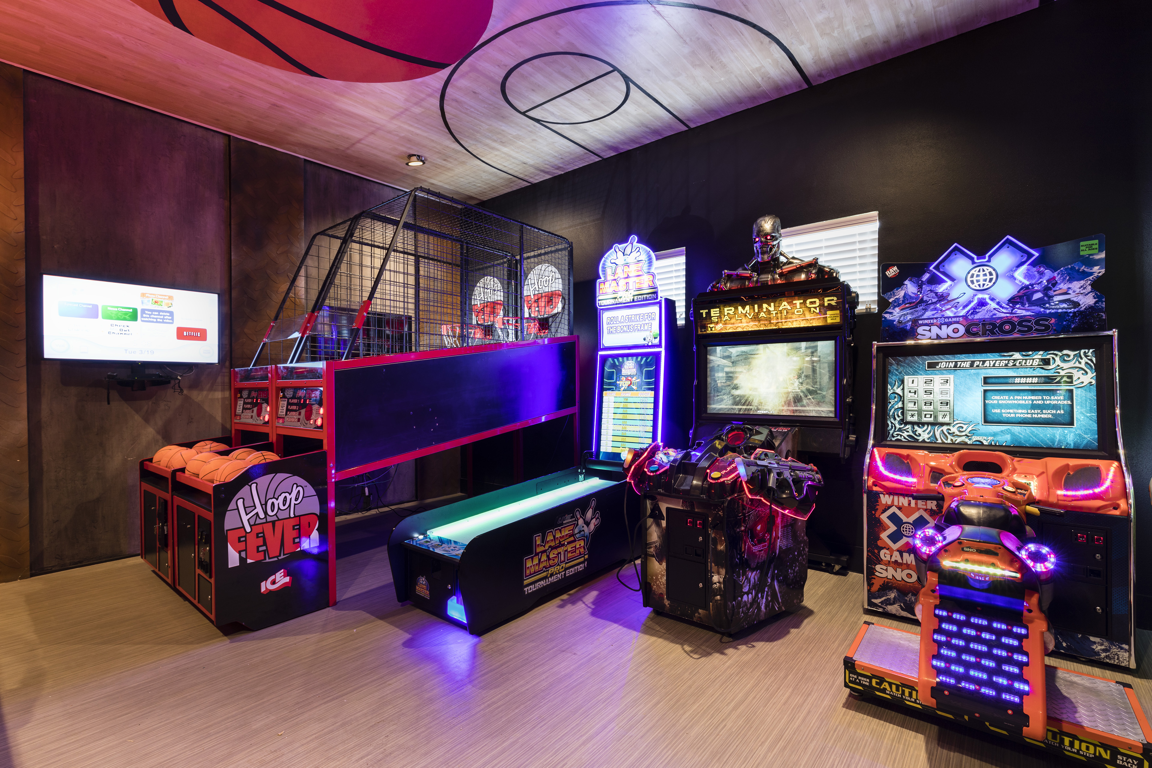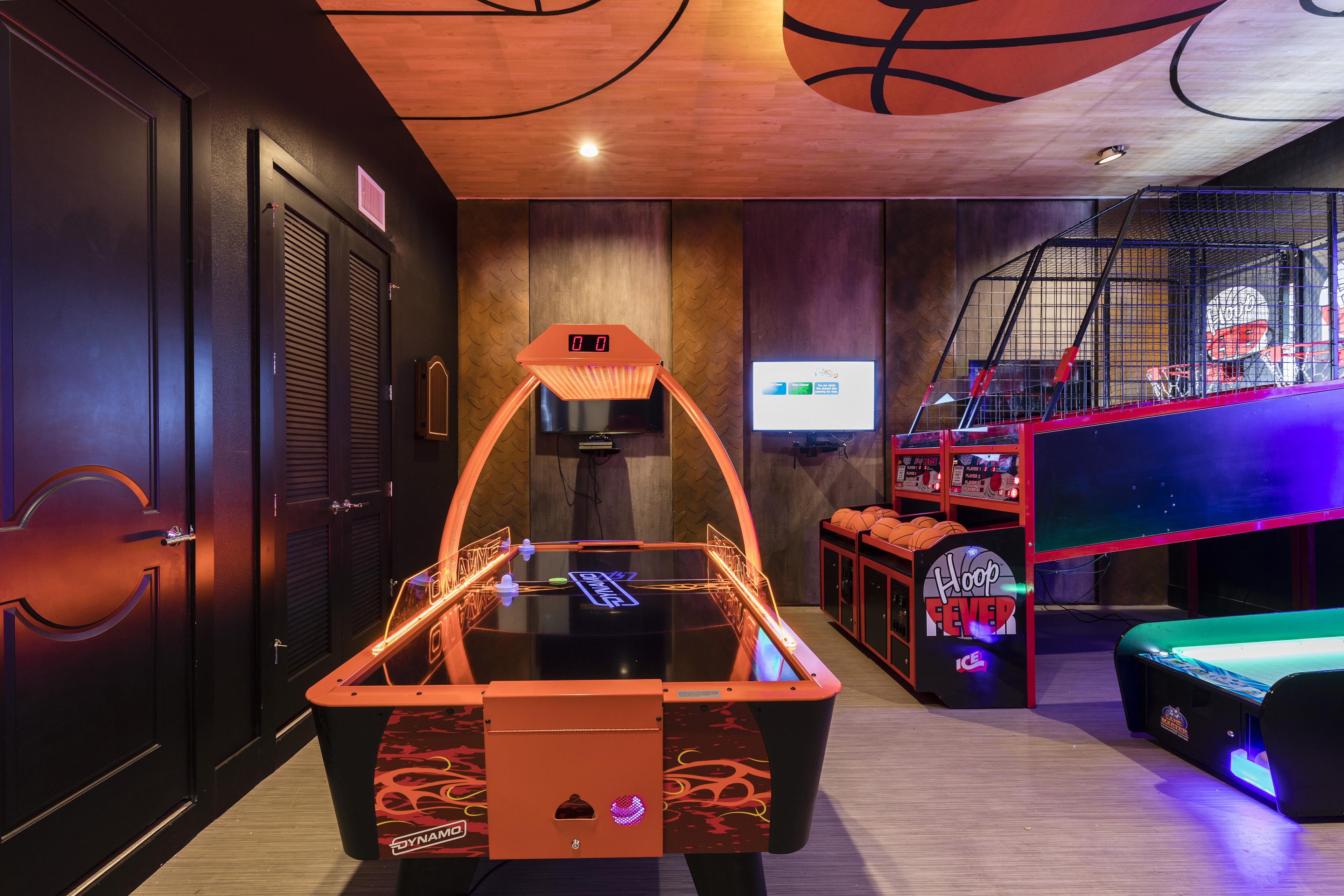 Sports themed games room has an air hockey table, 2x basketball shooting games, Lane Master virtual bowling game, Terminator shooting game, snocross racing game, 4x flat screen TVs with a Wii, PS4, and X-Box One video game console