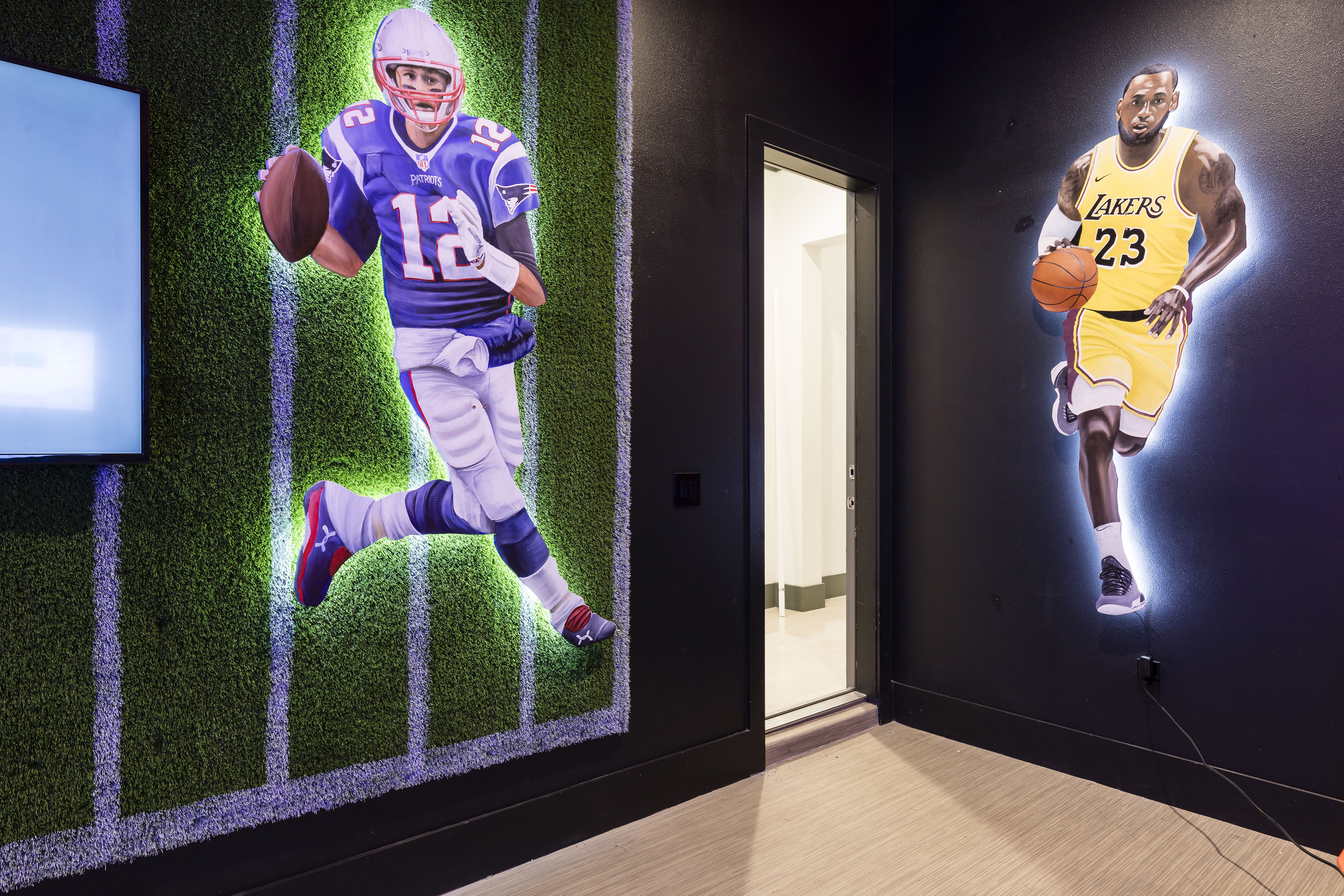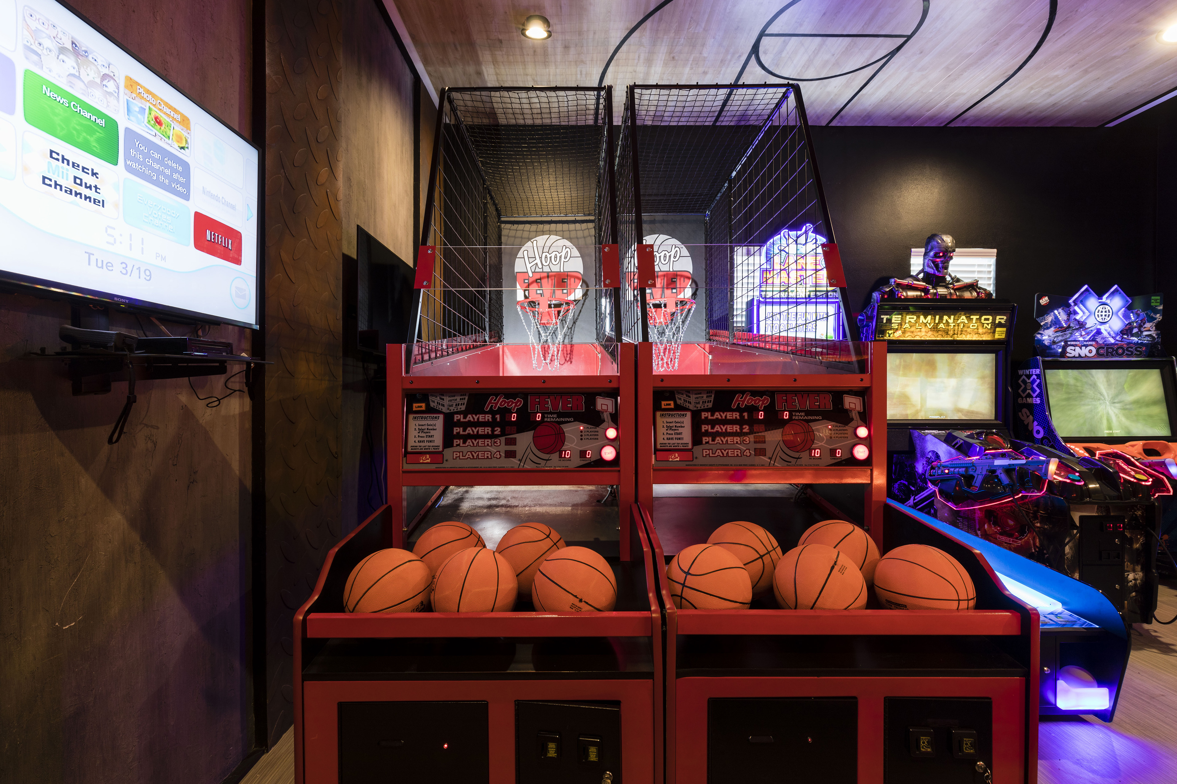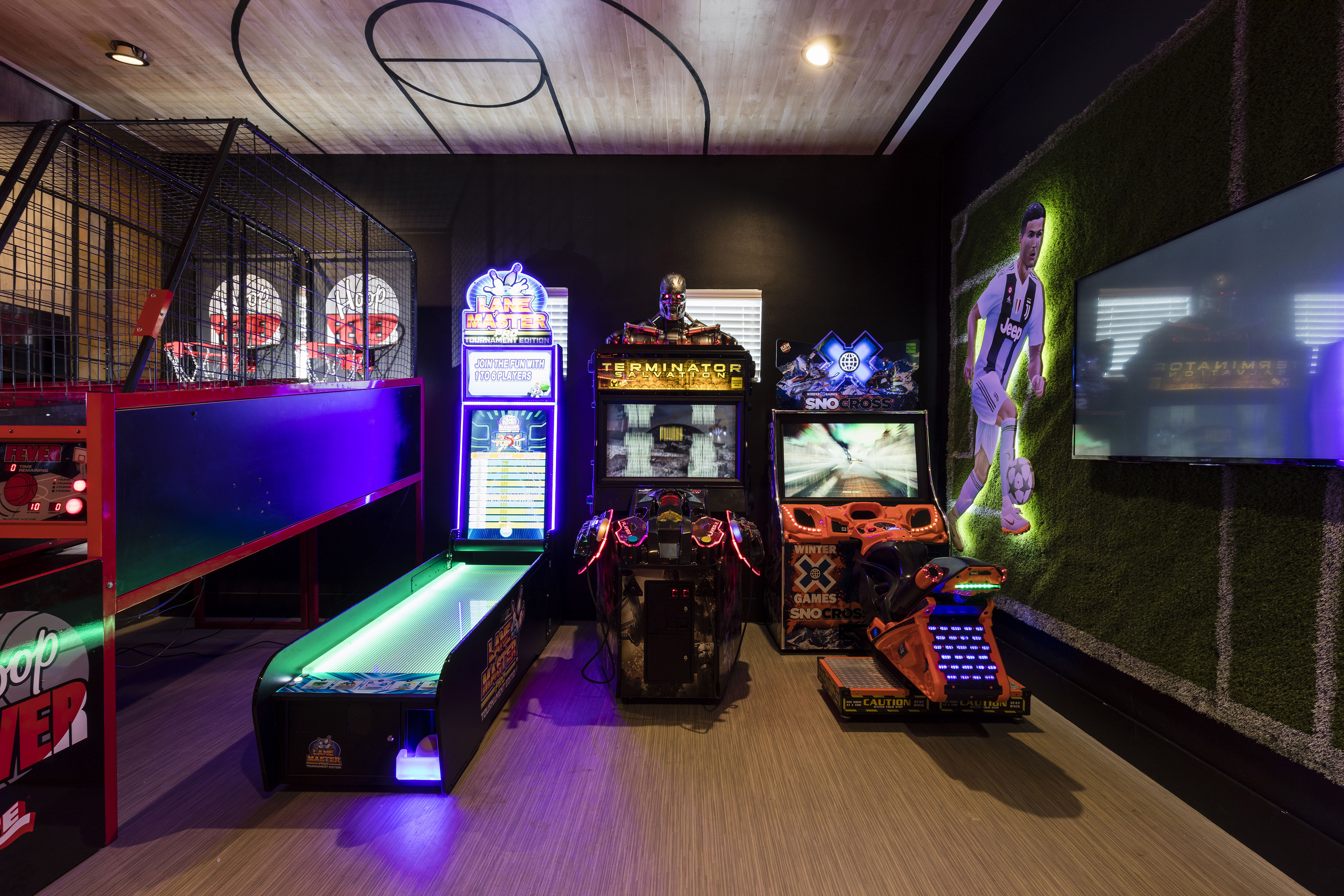 Sports themed games room has an air hockey table, 2x basketball shooting games, Lane Master virtual bowling game, Terminator shooting game, snocross racing game, 4x flat screen TVs with a Wii, PS4, and X-Box One video game console