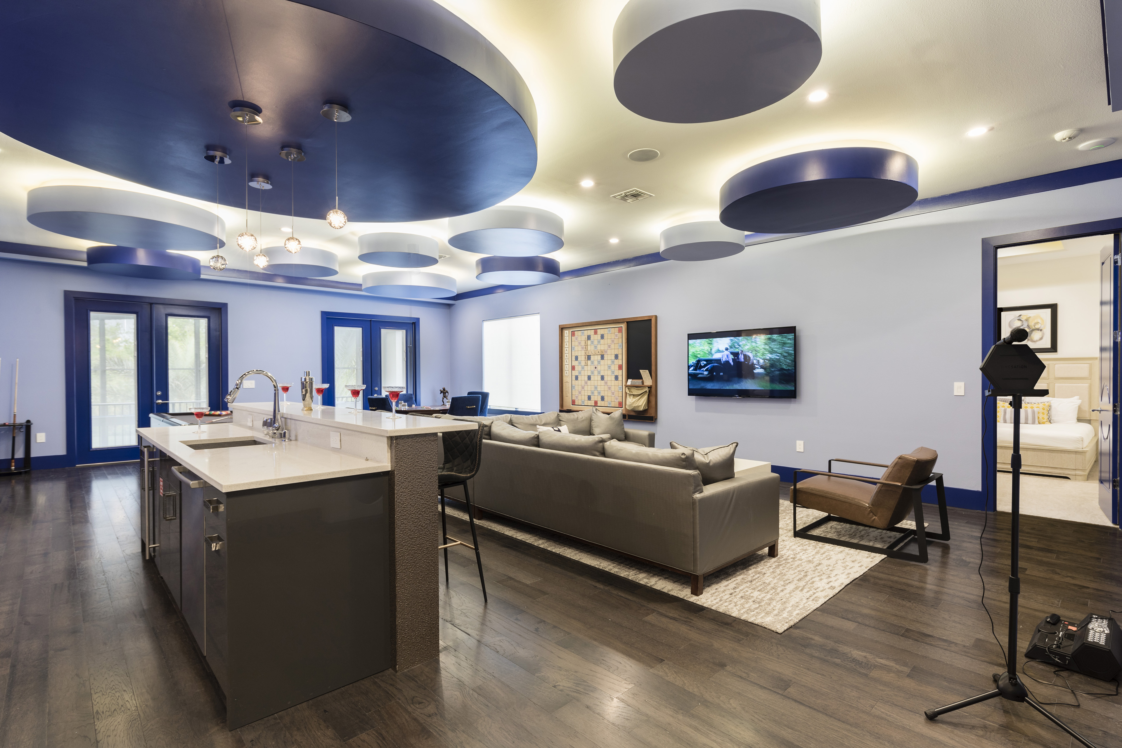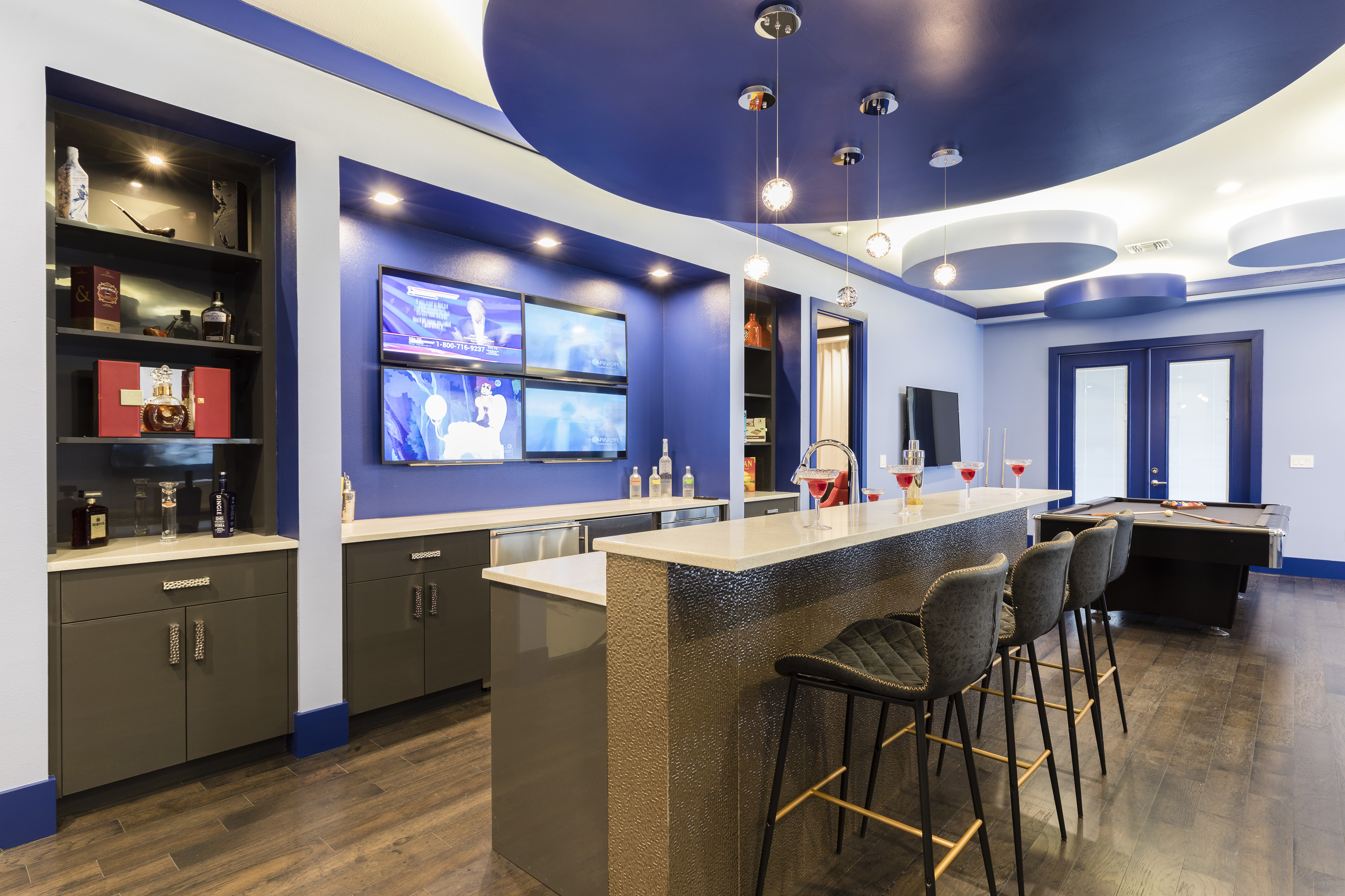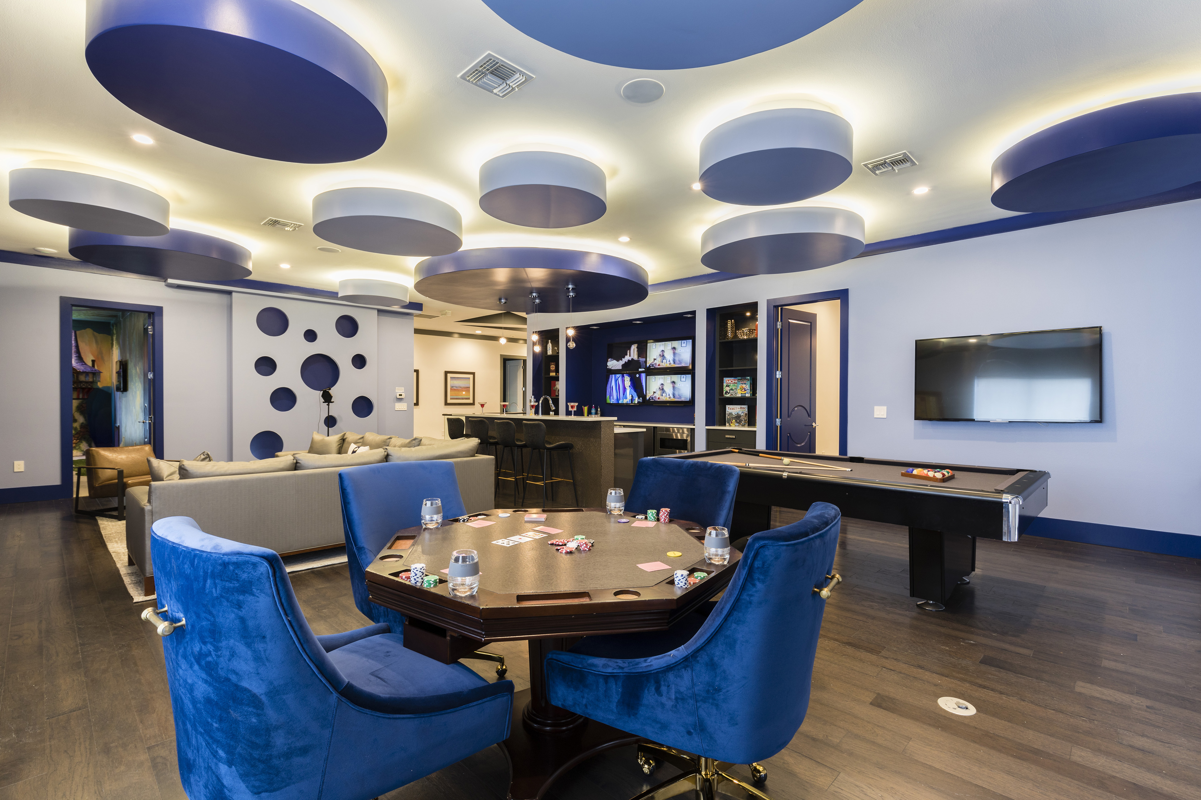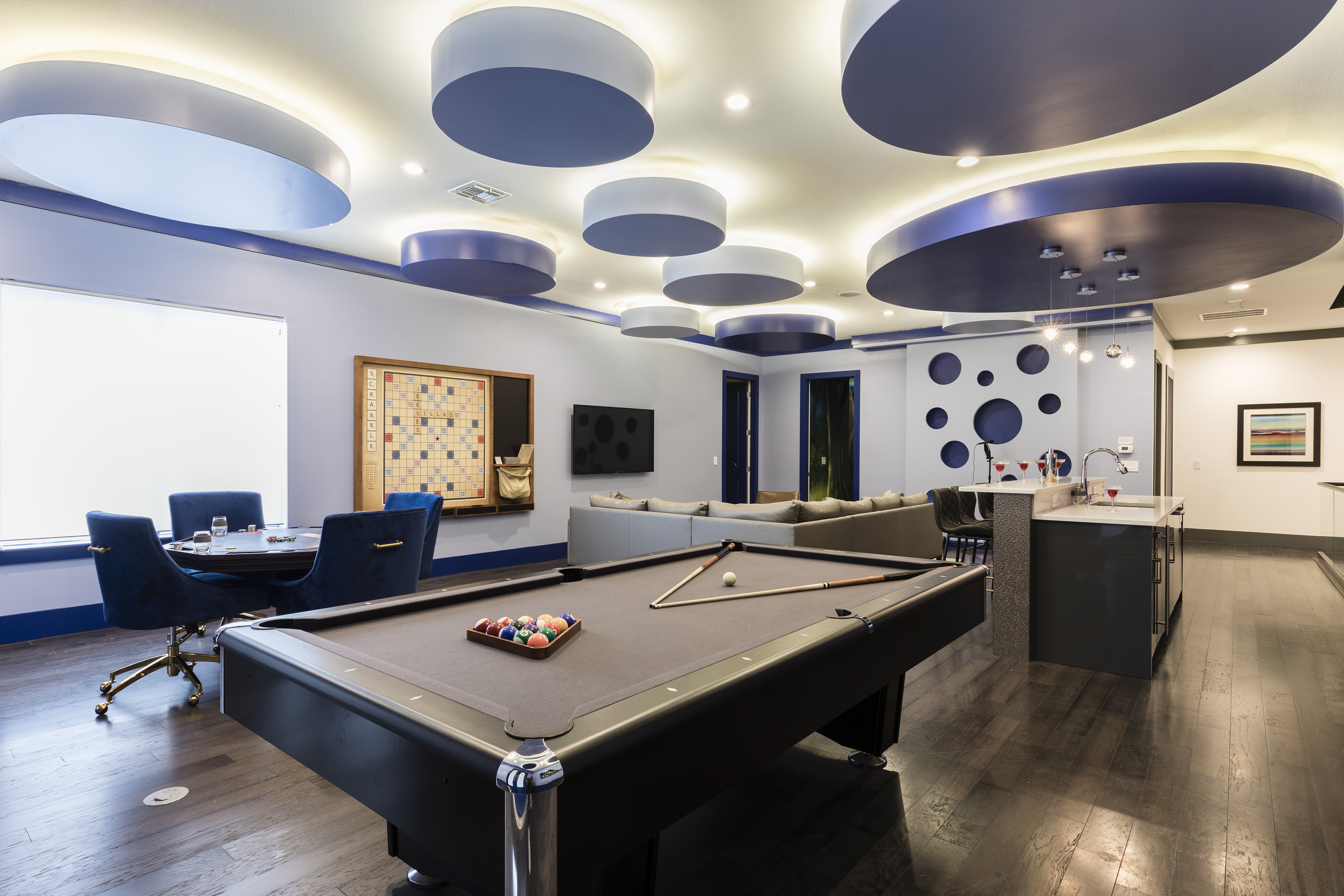 Upper floor loft area has a leather sectional and leather accent chair, 2x flat screen TVs, karaoke machine, giant scrabble and additional board games, pool table, 4 seat card table, wet bar with 4x stools and 4x flat screen TVs