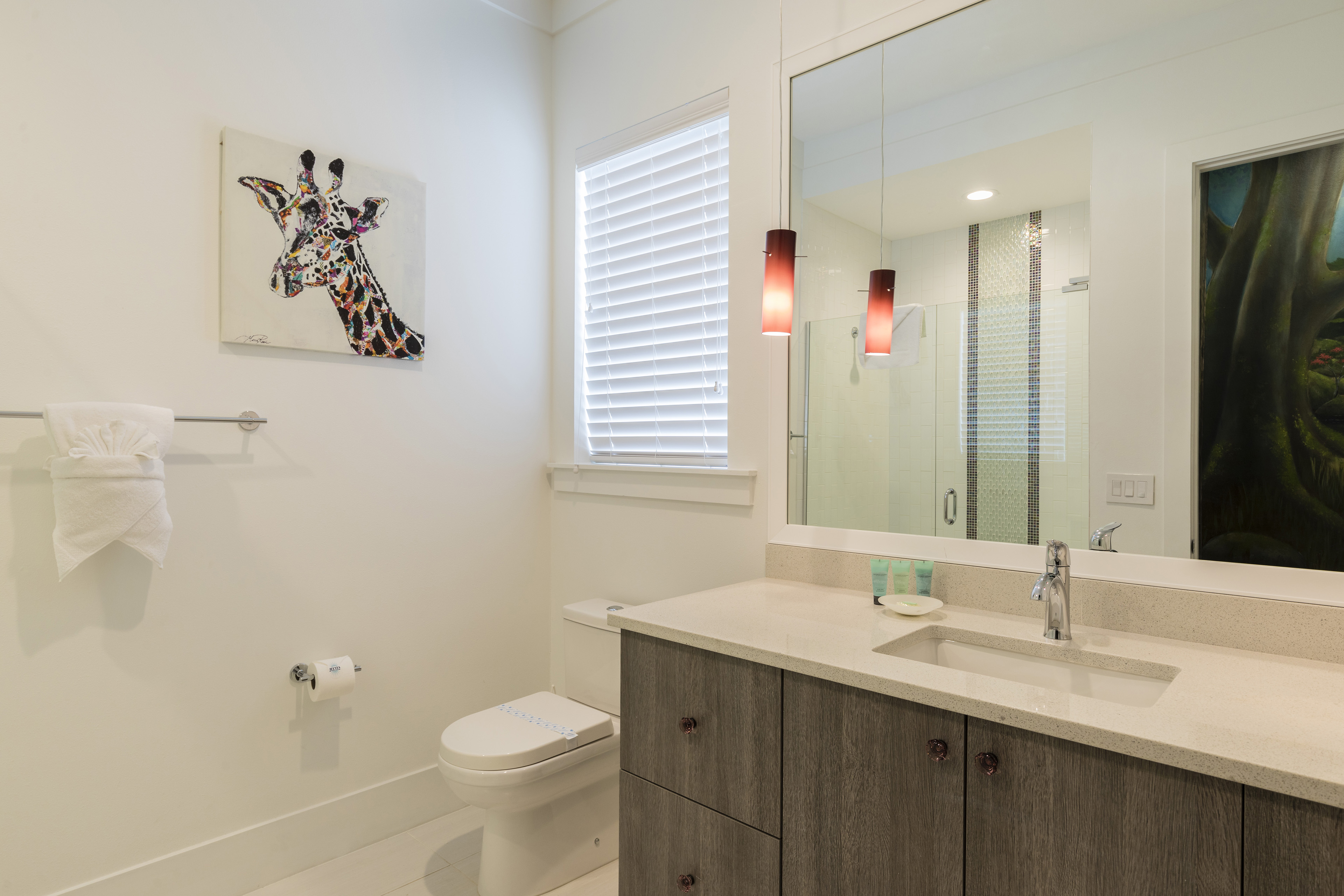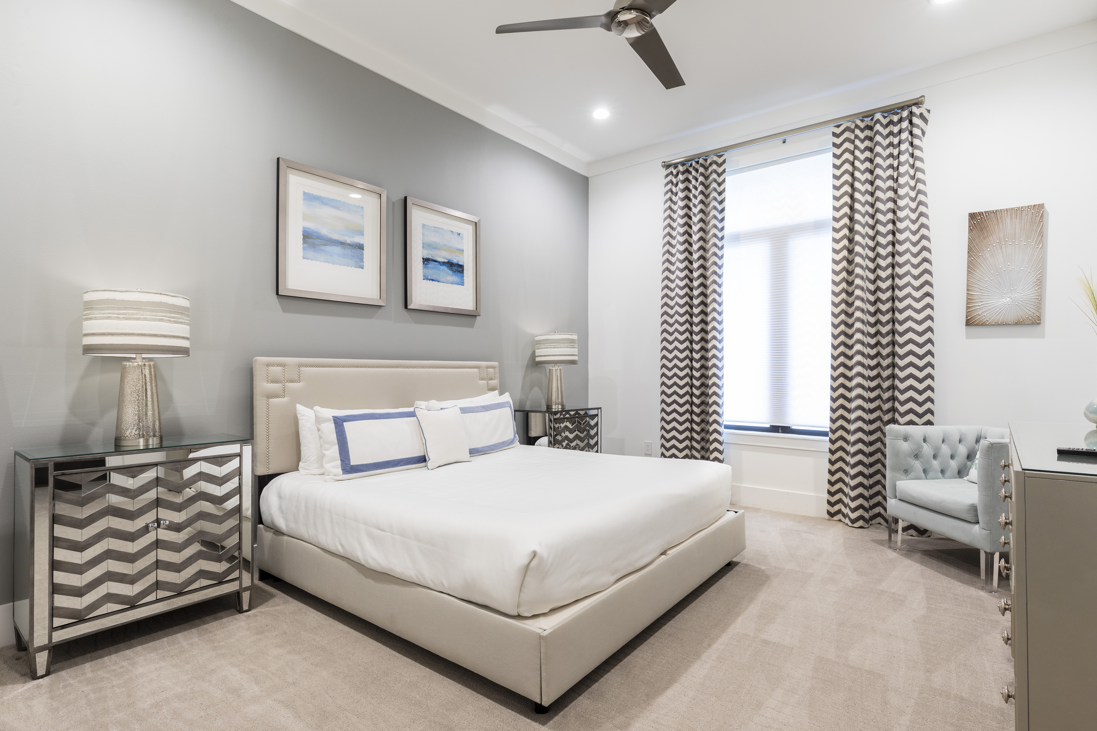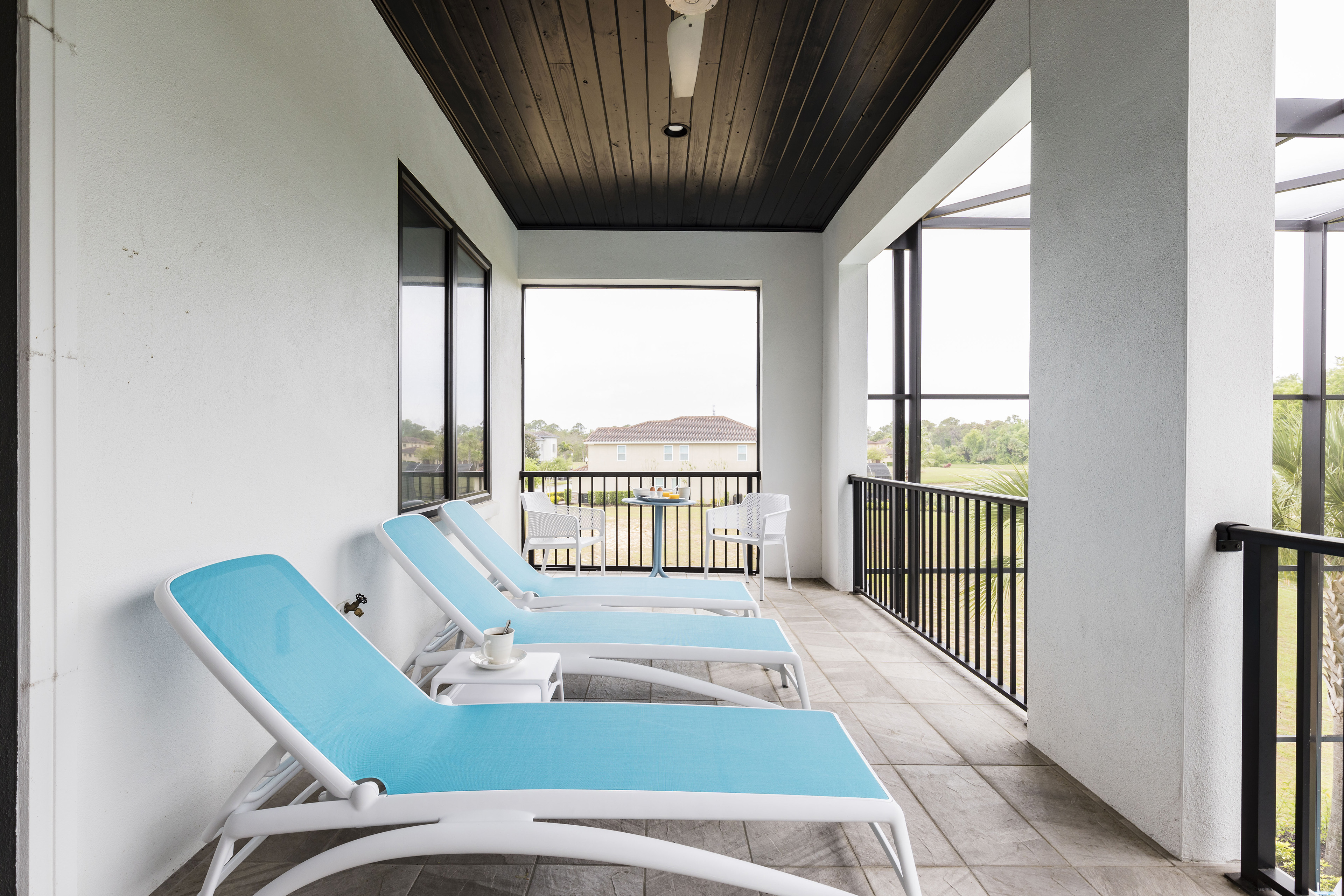 King sized Master with en suite (shower, tub, twin vanities), accent chair, balcony access over the pool deck