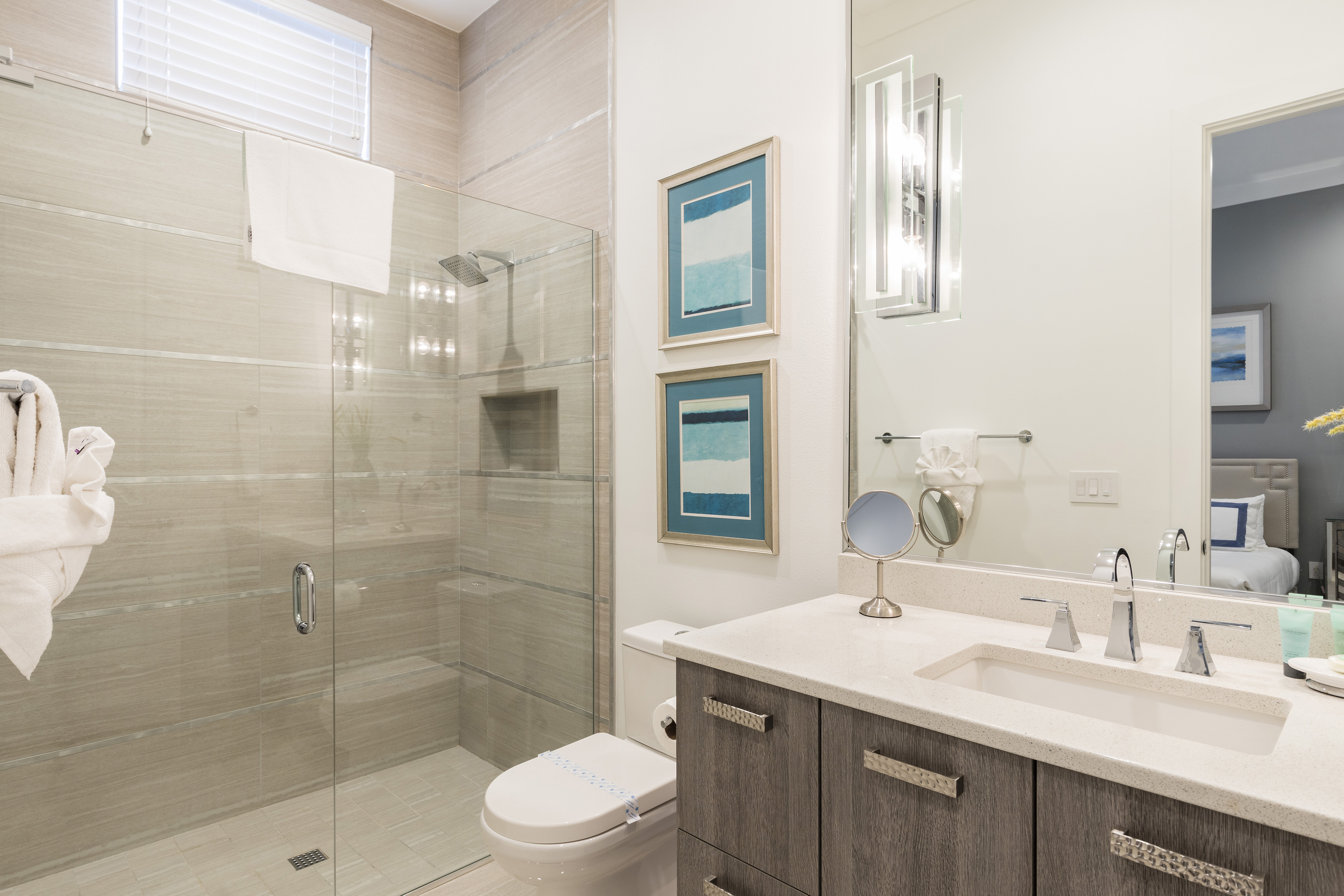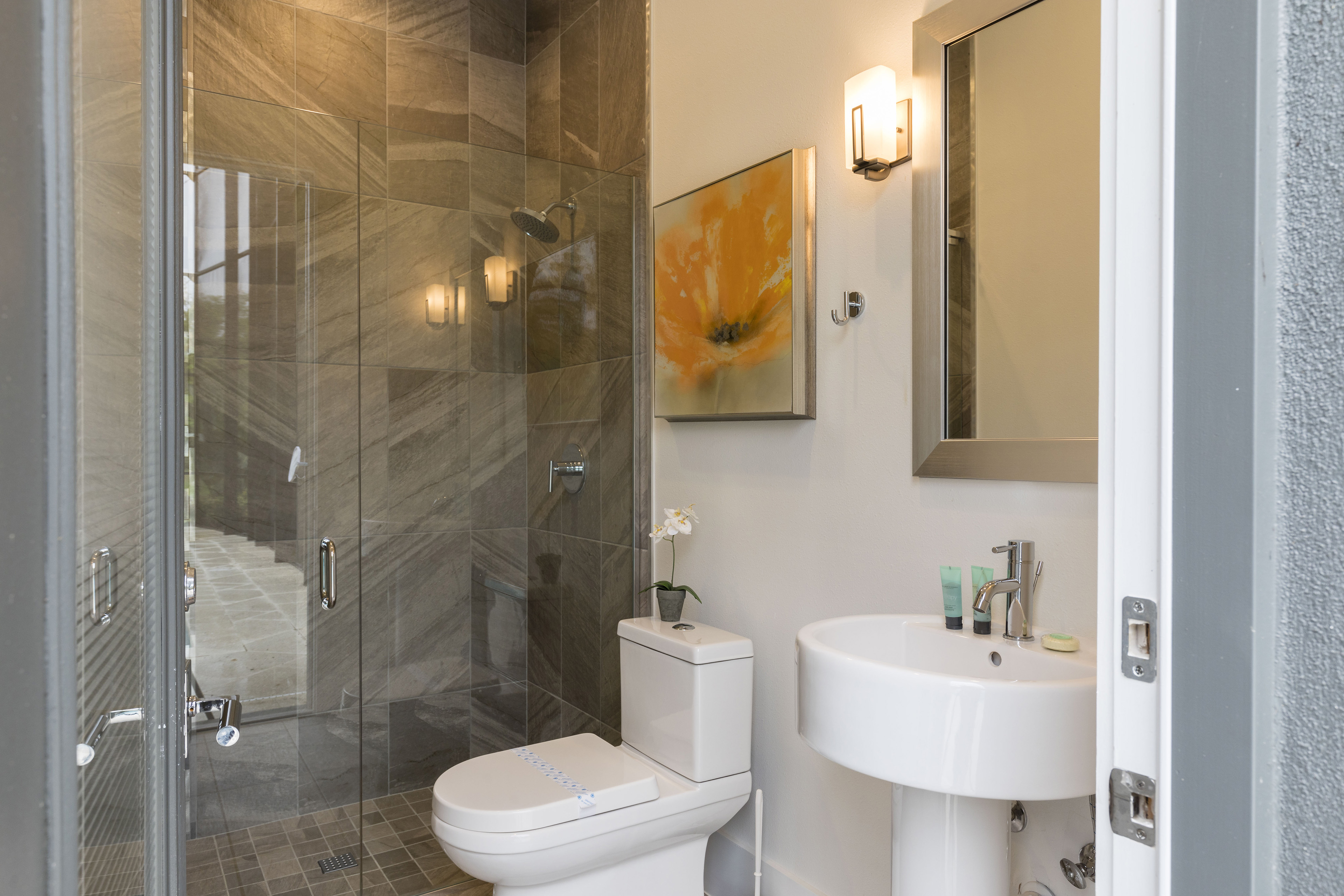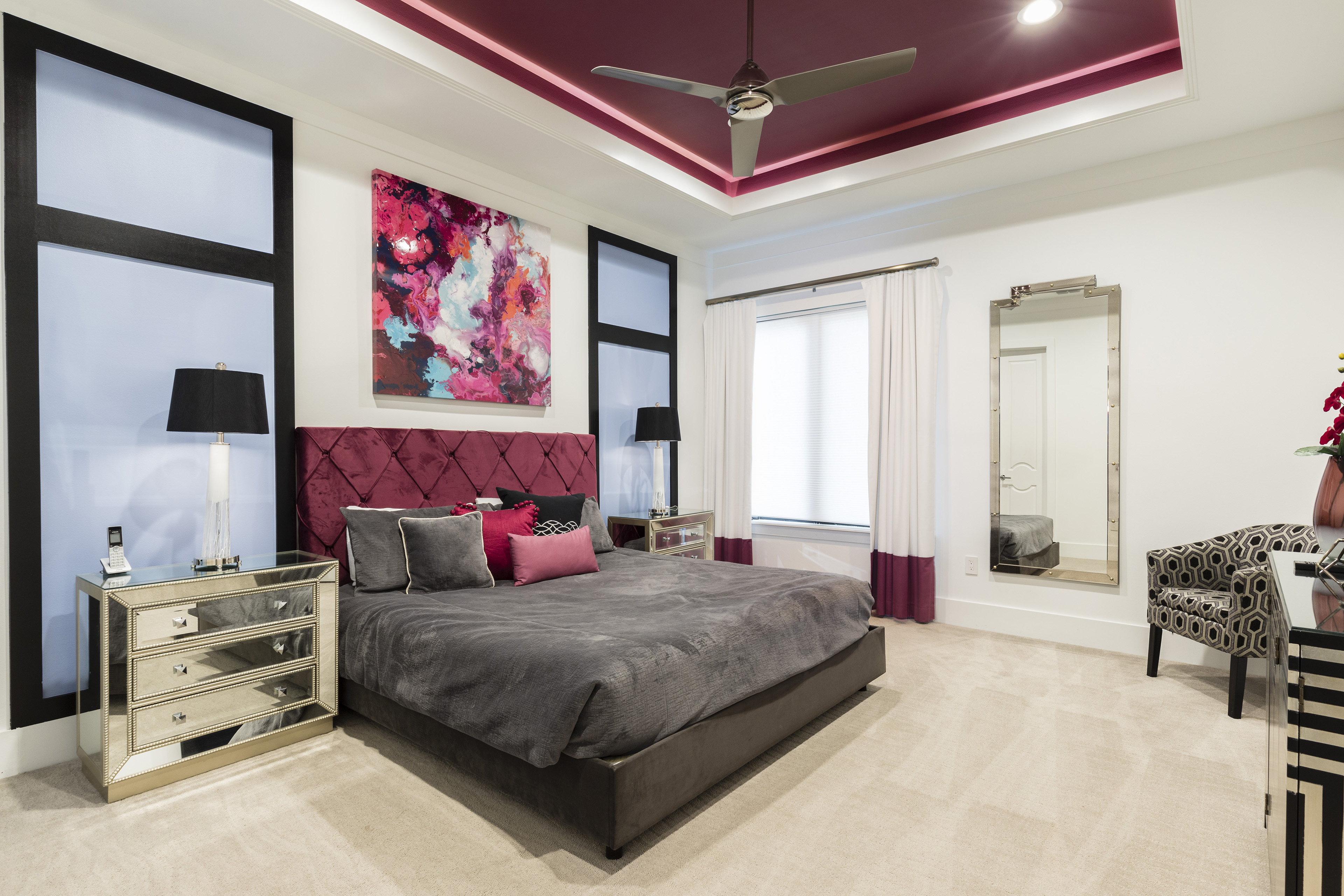 King sized Master with en suite (shower, tub, twin vanities), accent chair, balcony access over the pool deck