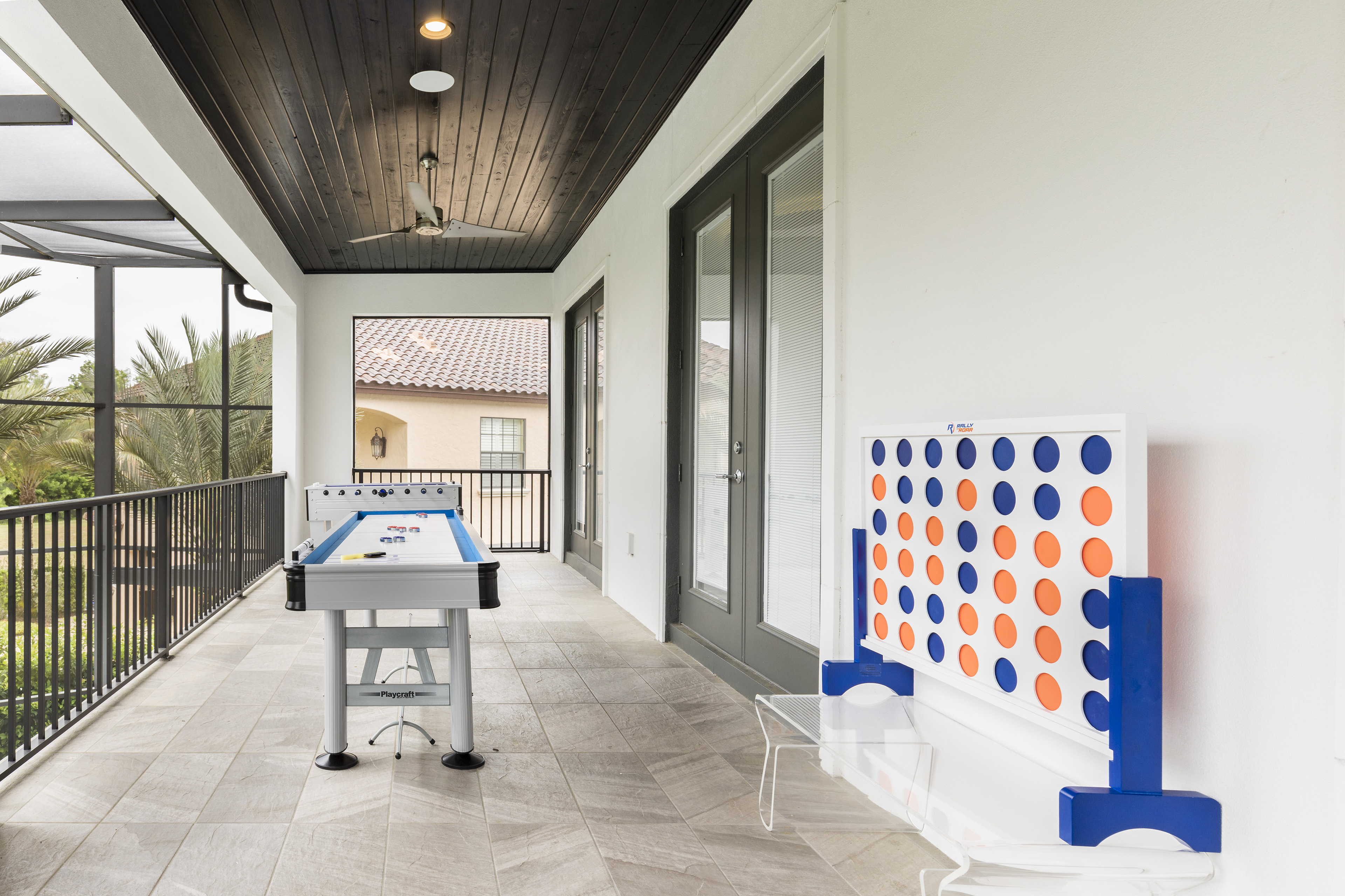 Upper floor balcony has a foosball and shuffleboard table, giant connect four, 3x sun loungers, 2 seat patio table