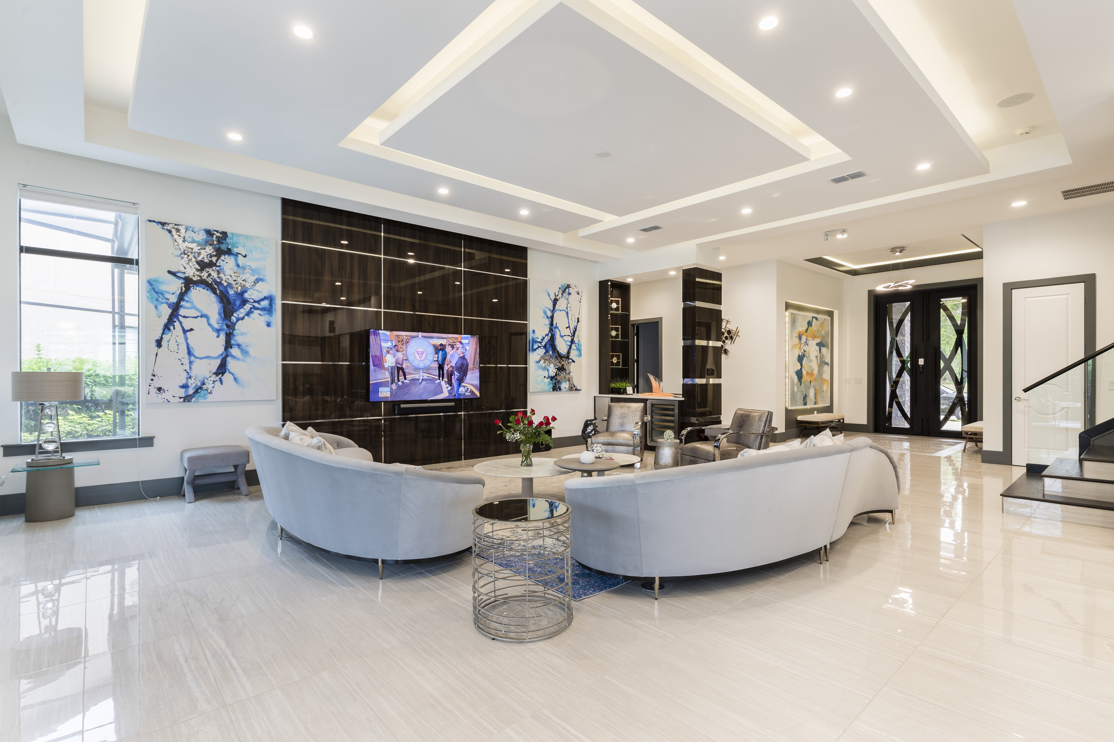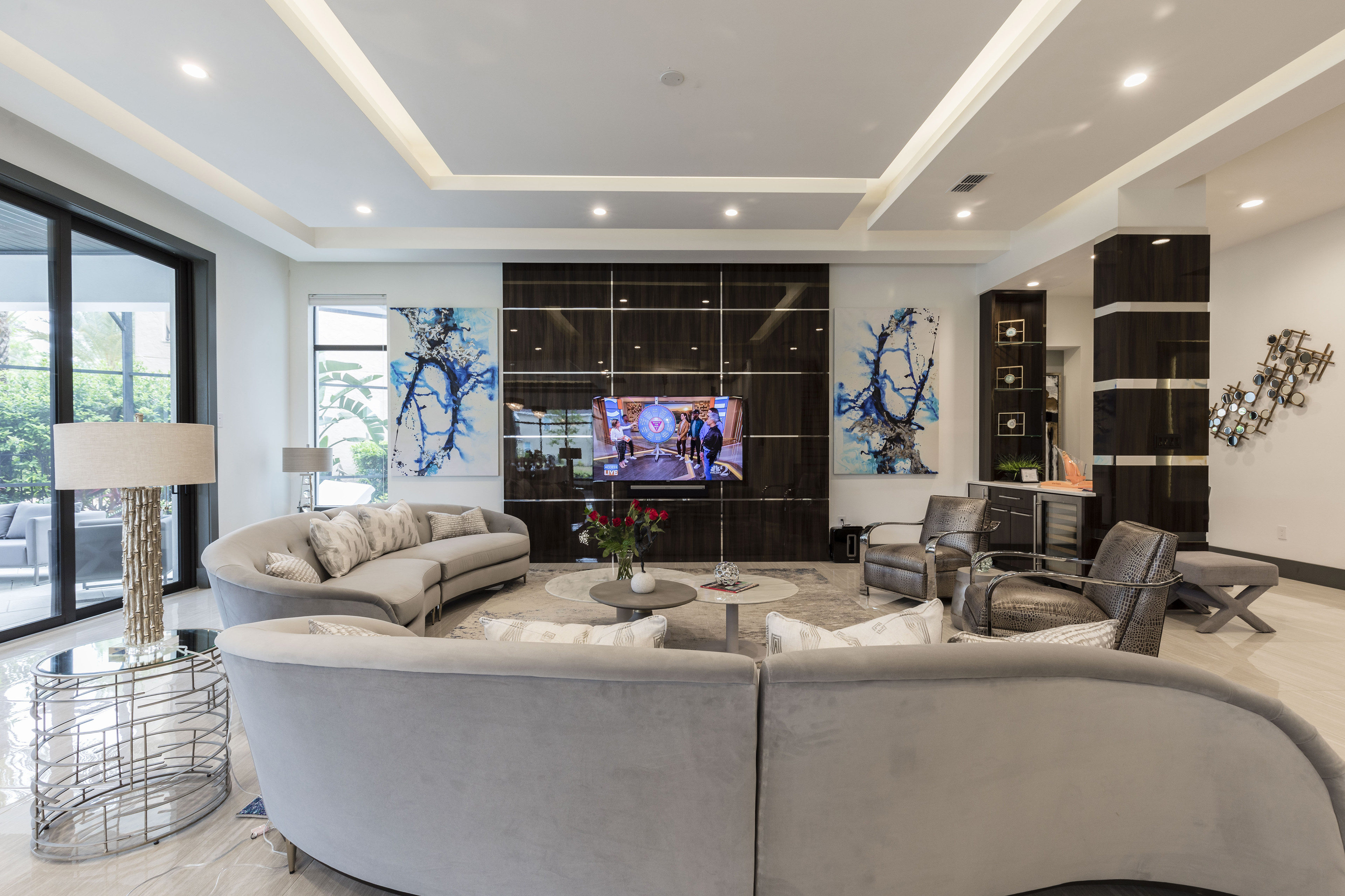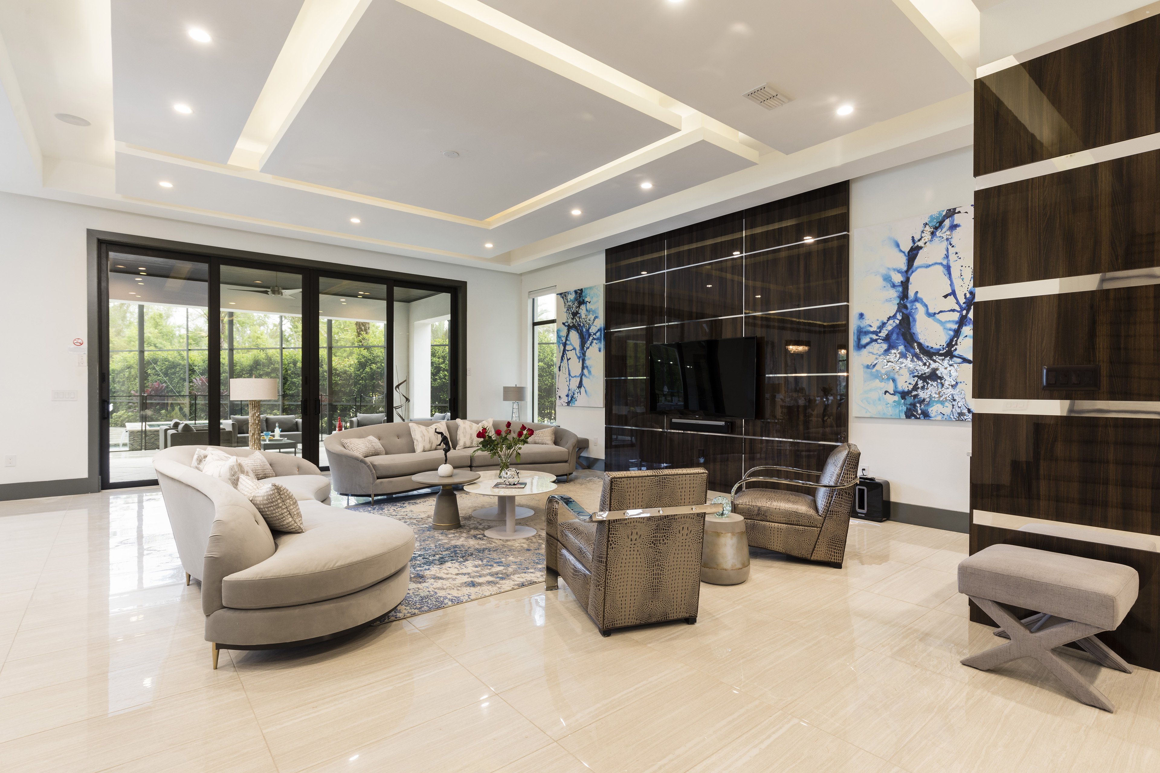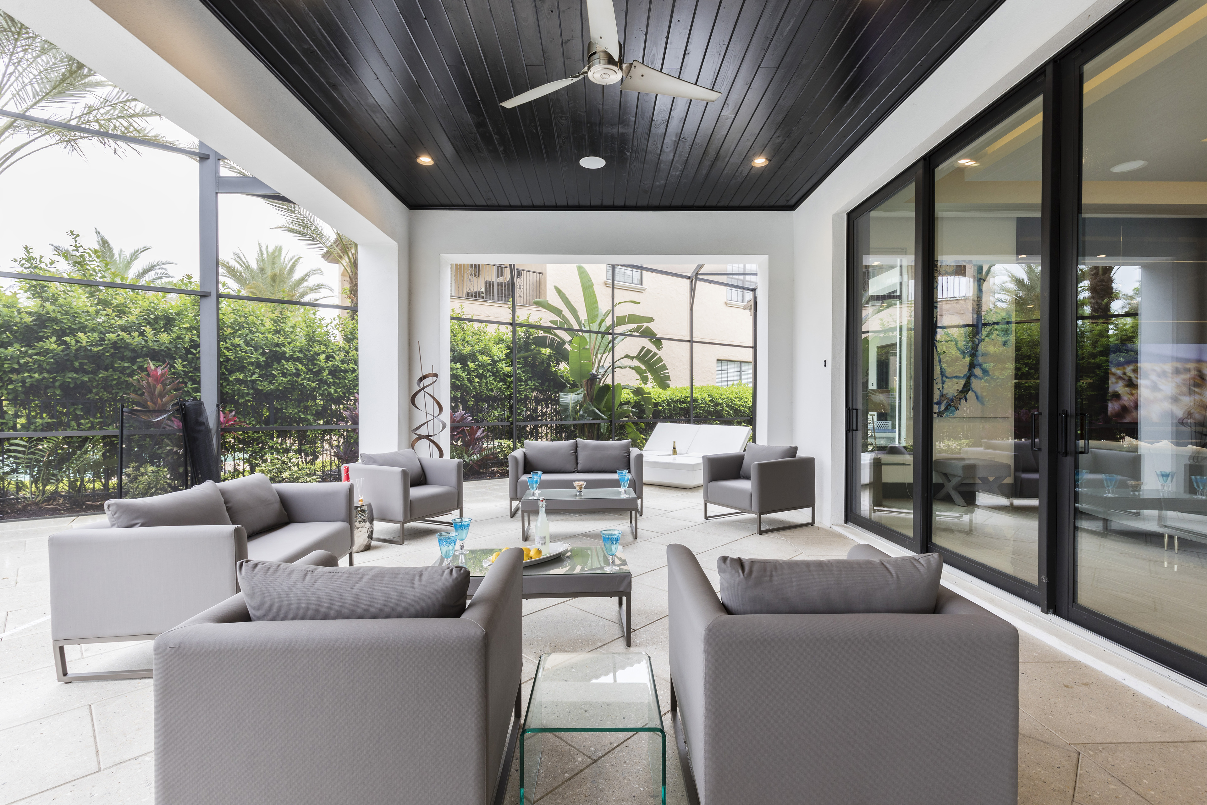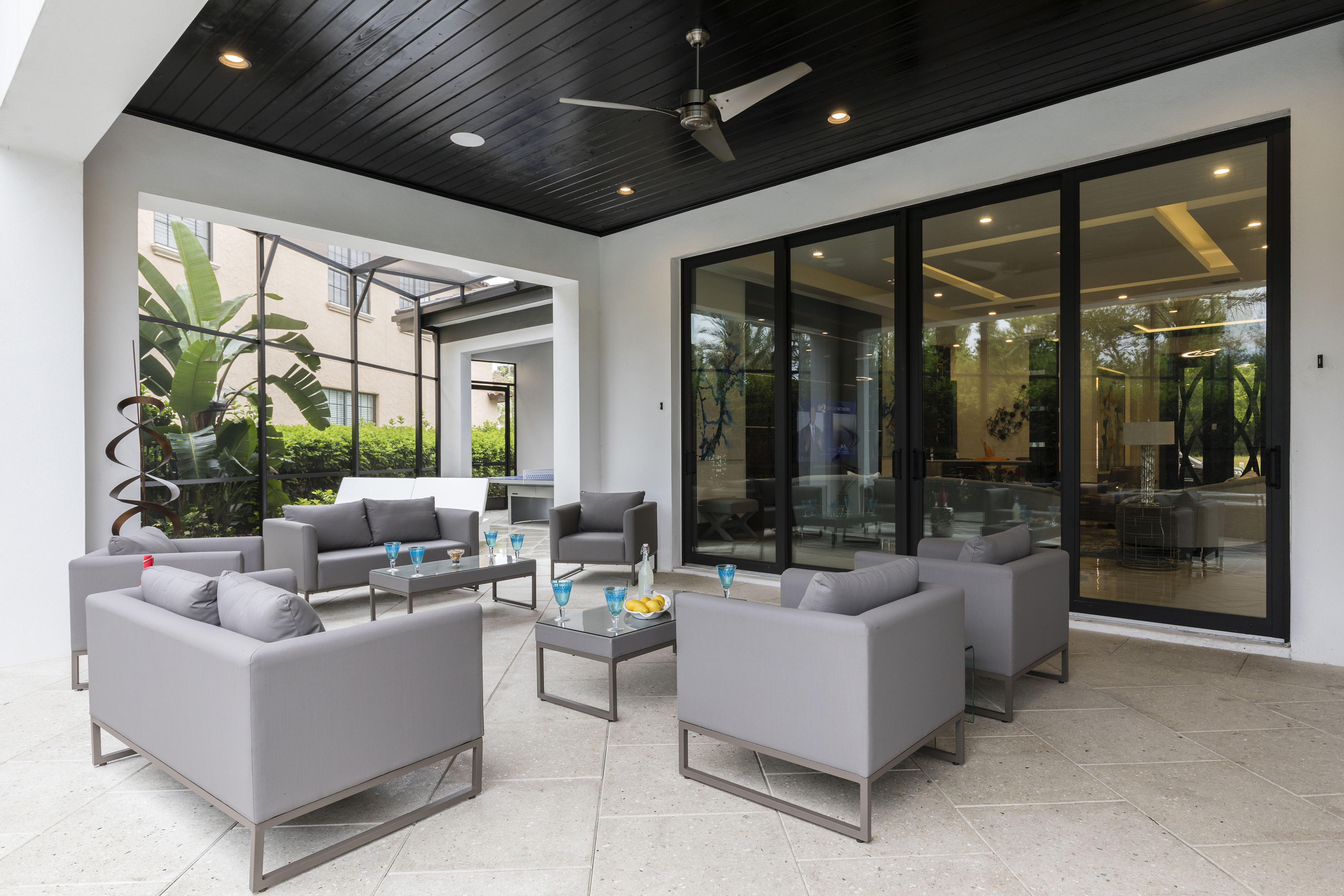 Spacious comfortable seating area with 2x sofas and 2x accent chairs overlooking the pool deck through large sliding glass doors