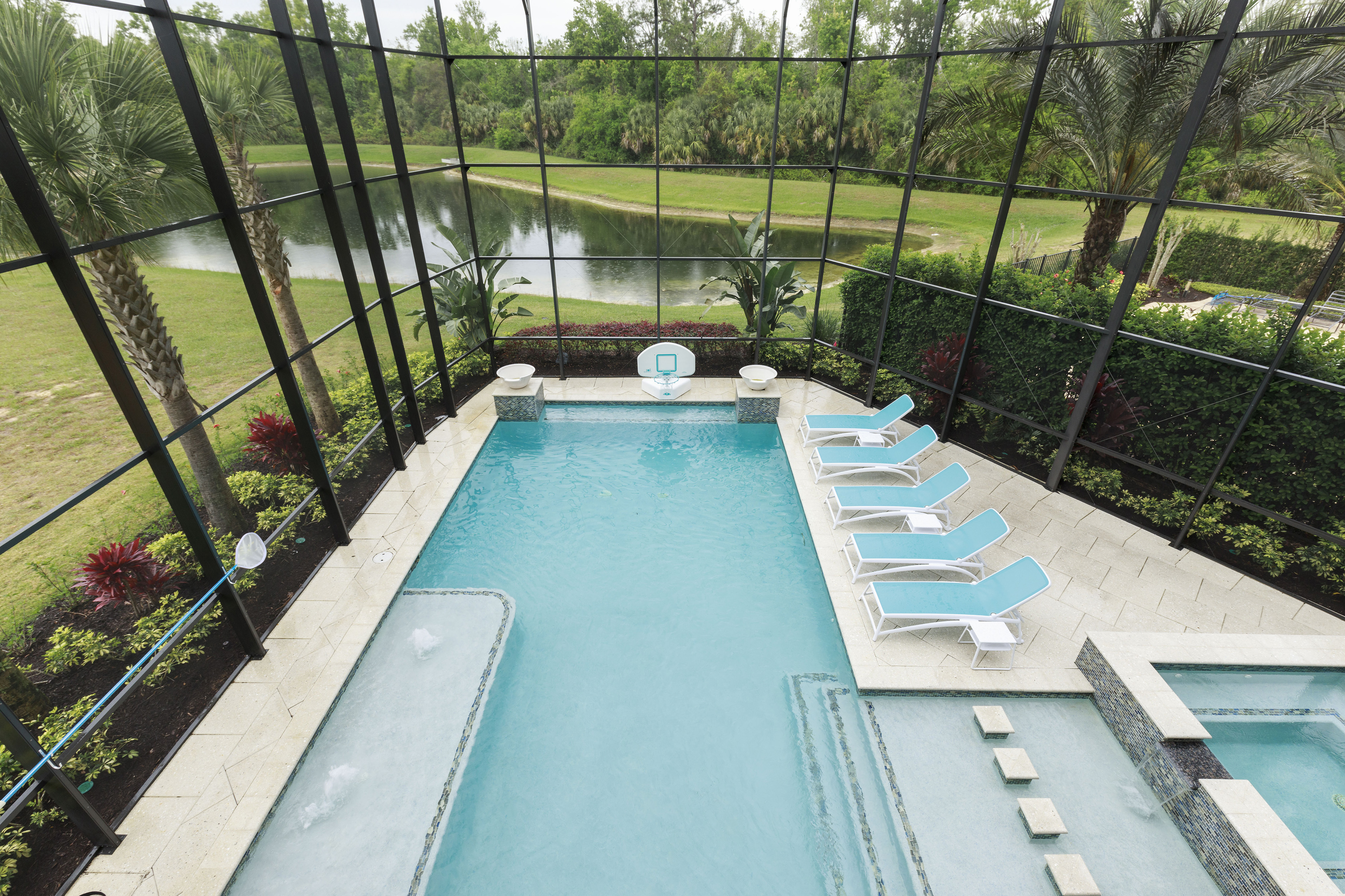 Screened in large swimming pool and spillover spa (optional heating) with water features