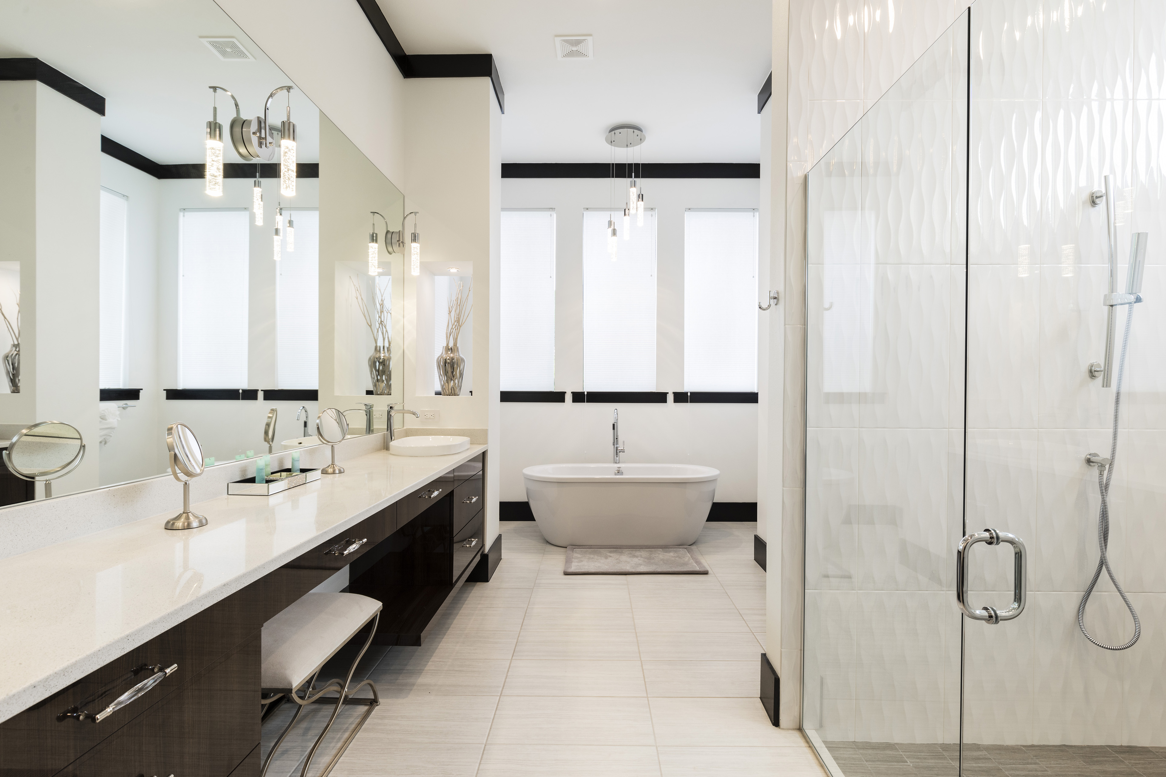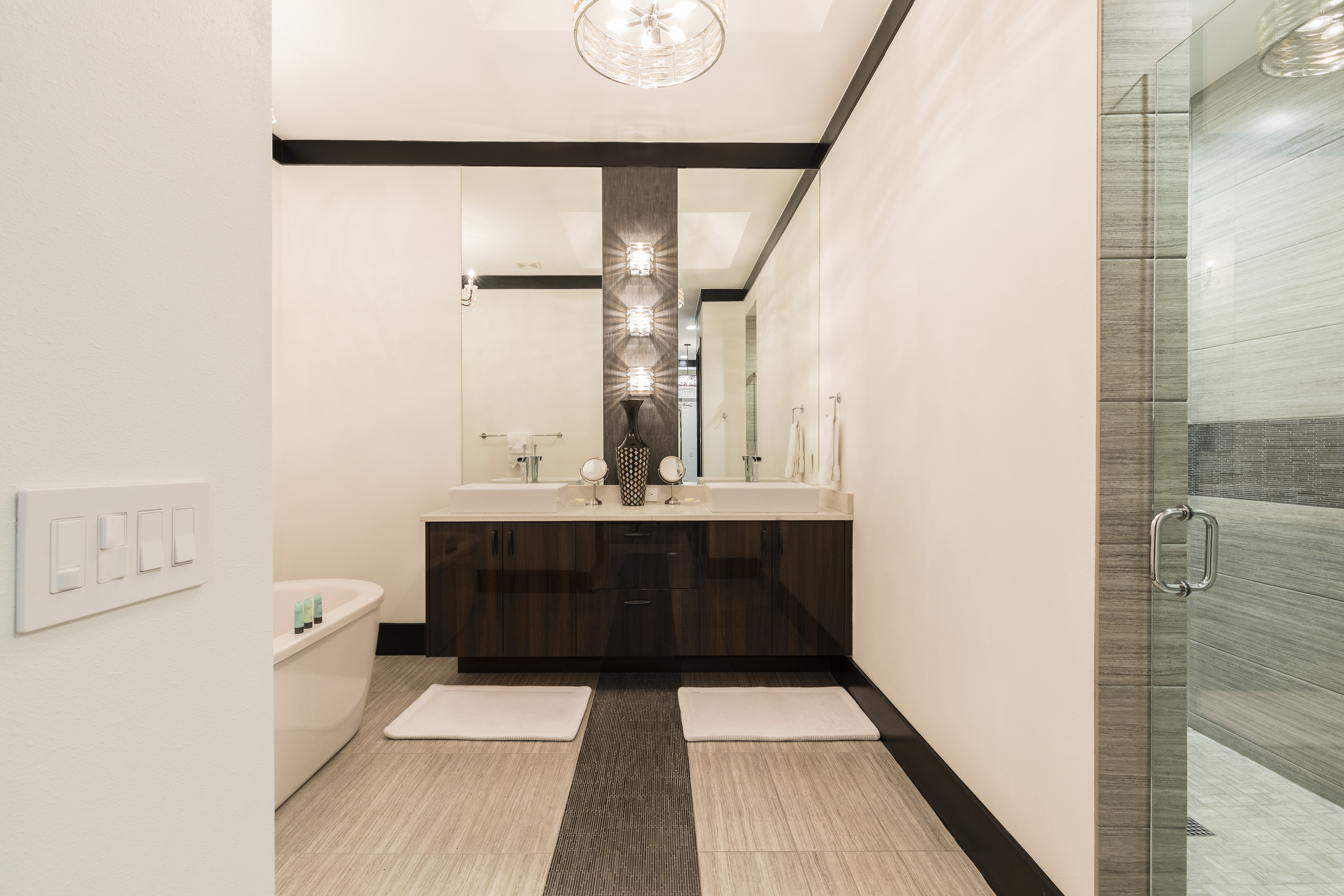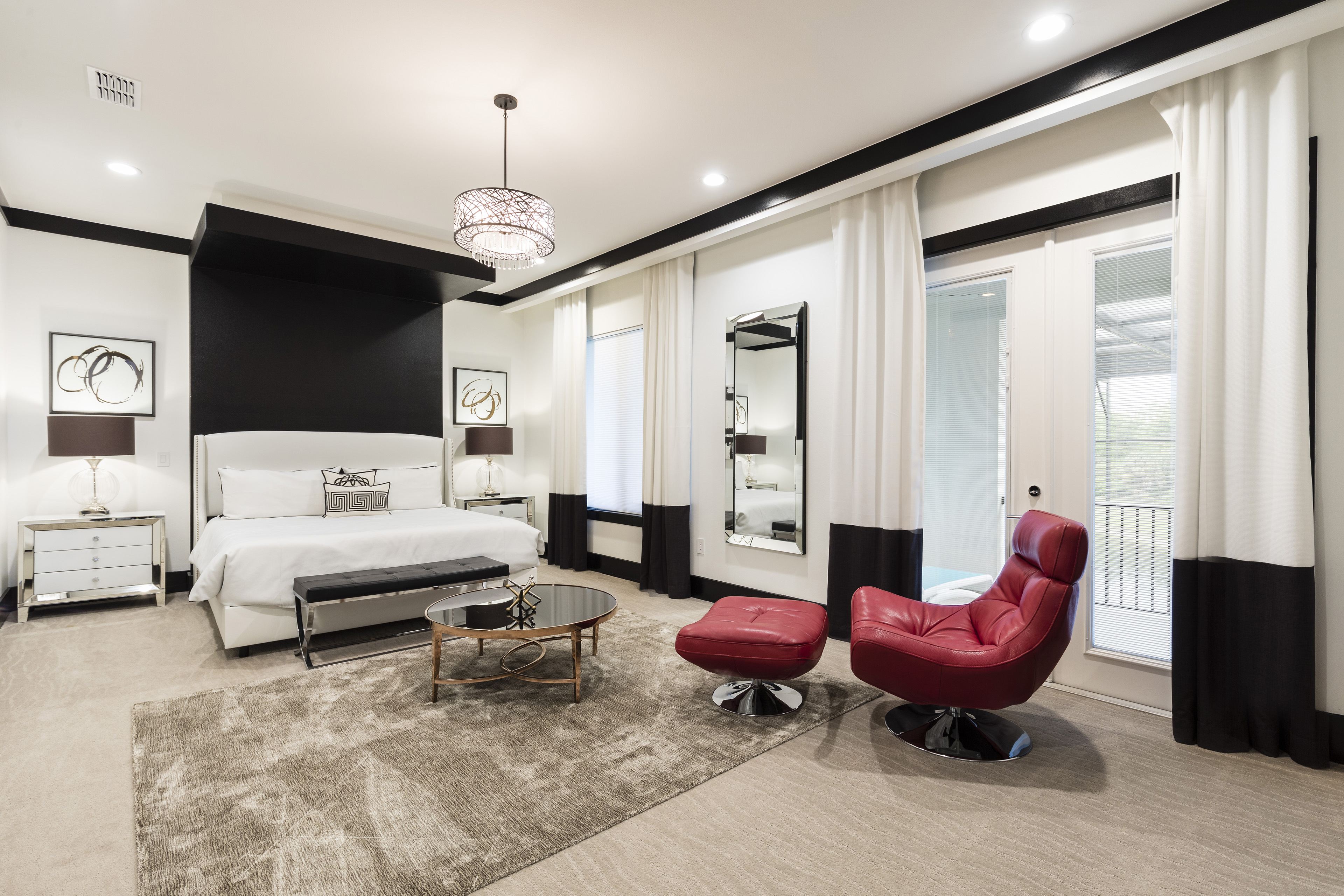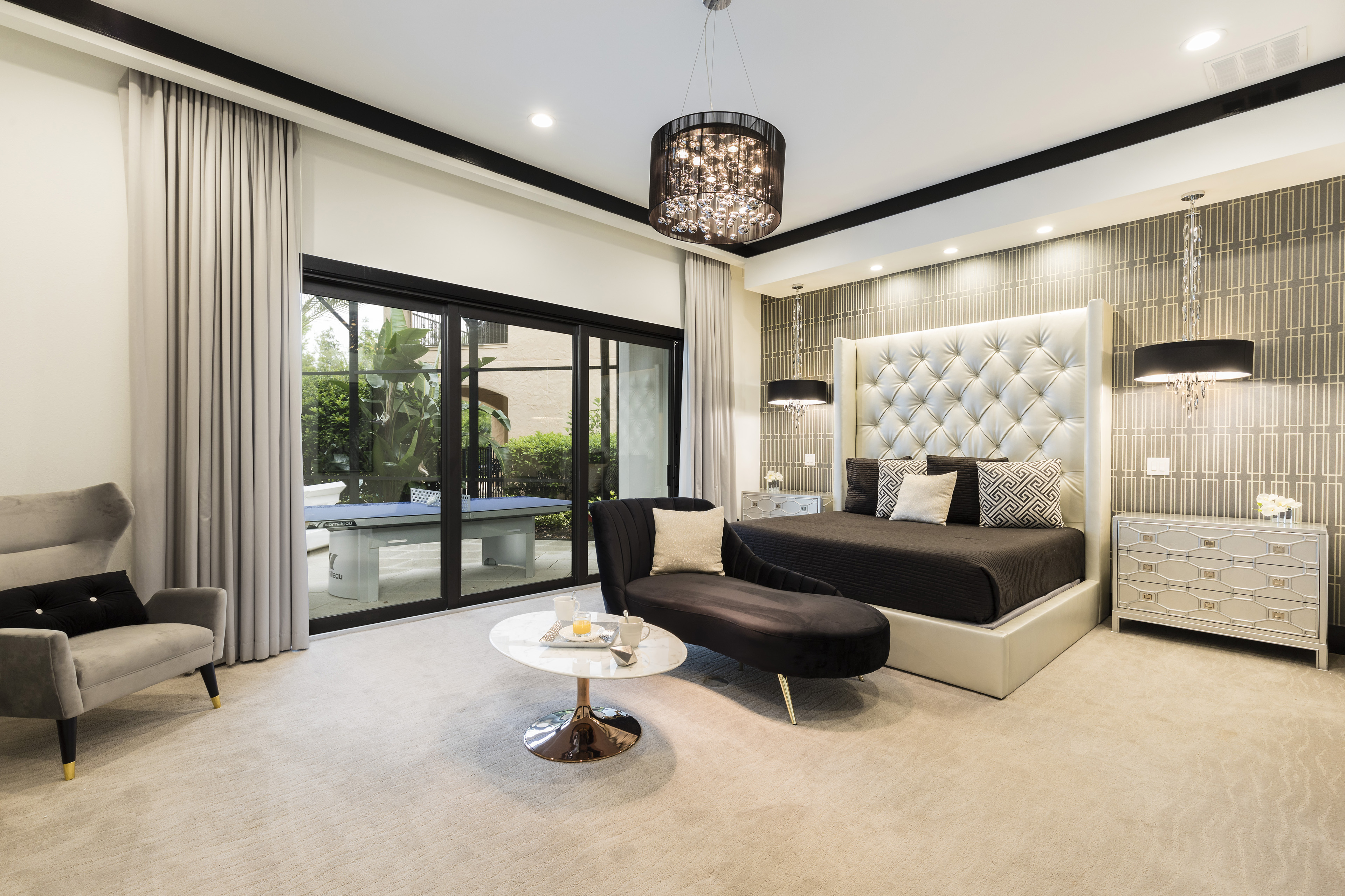 King sized master with en suite (shower, tub, 2x separate vanities), an accent chair, patio access