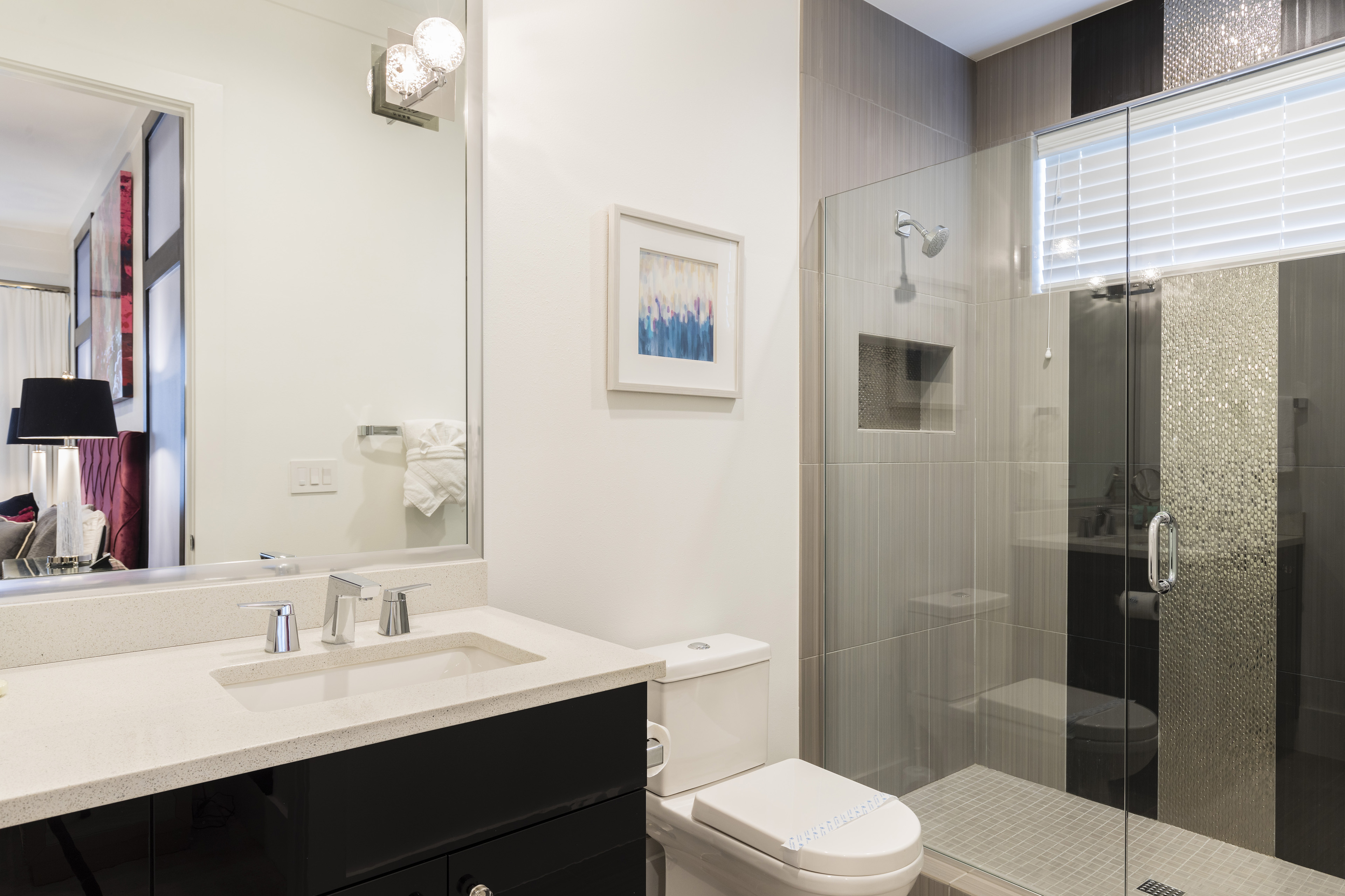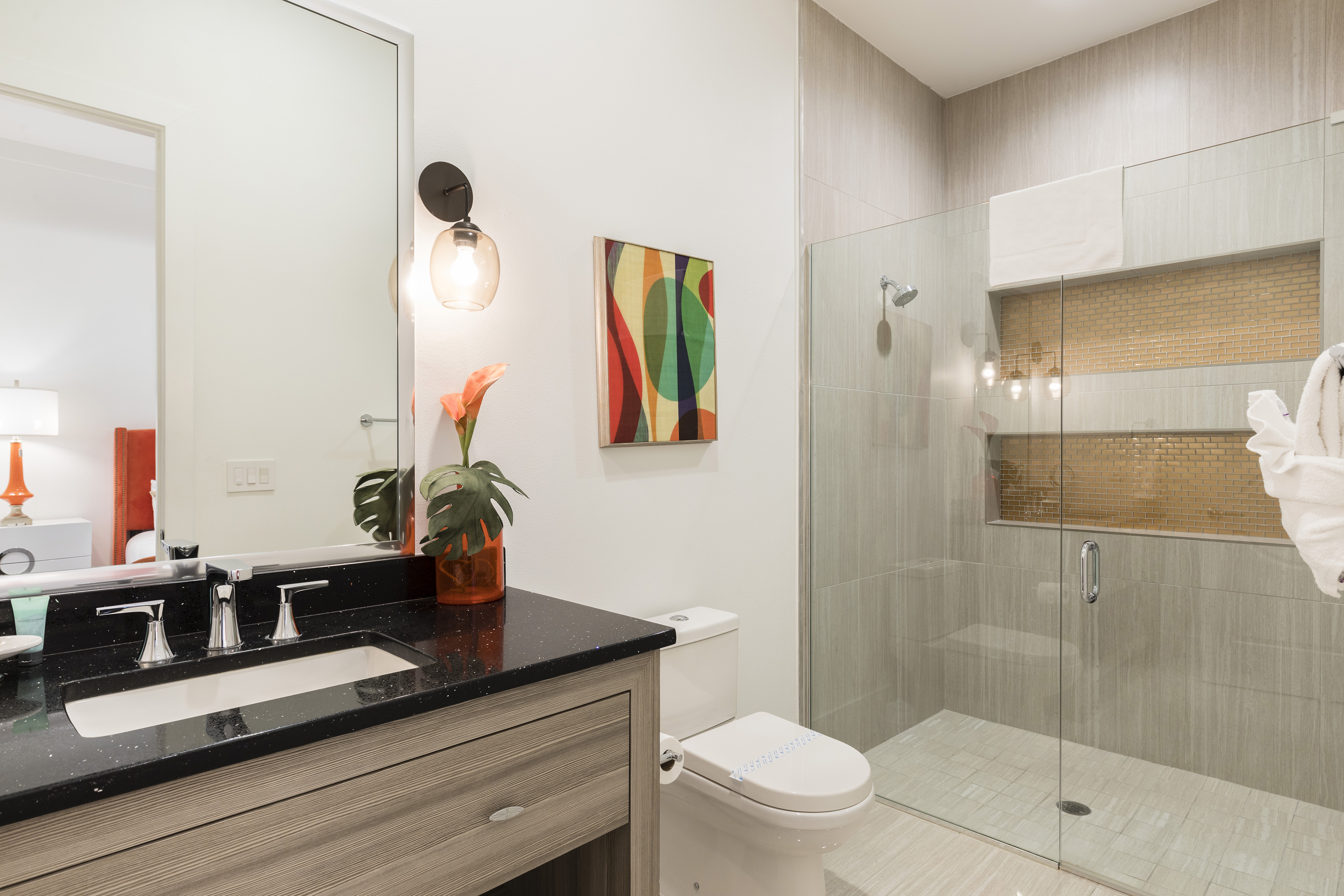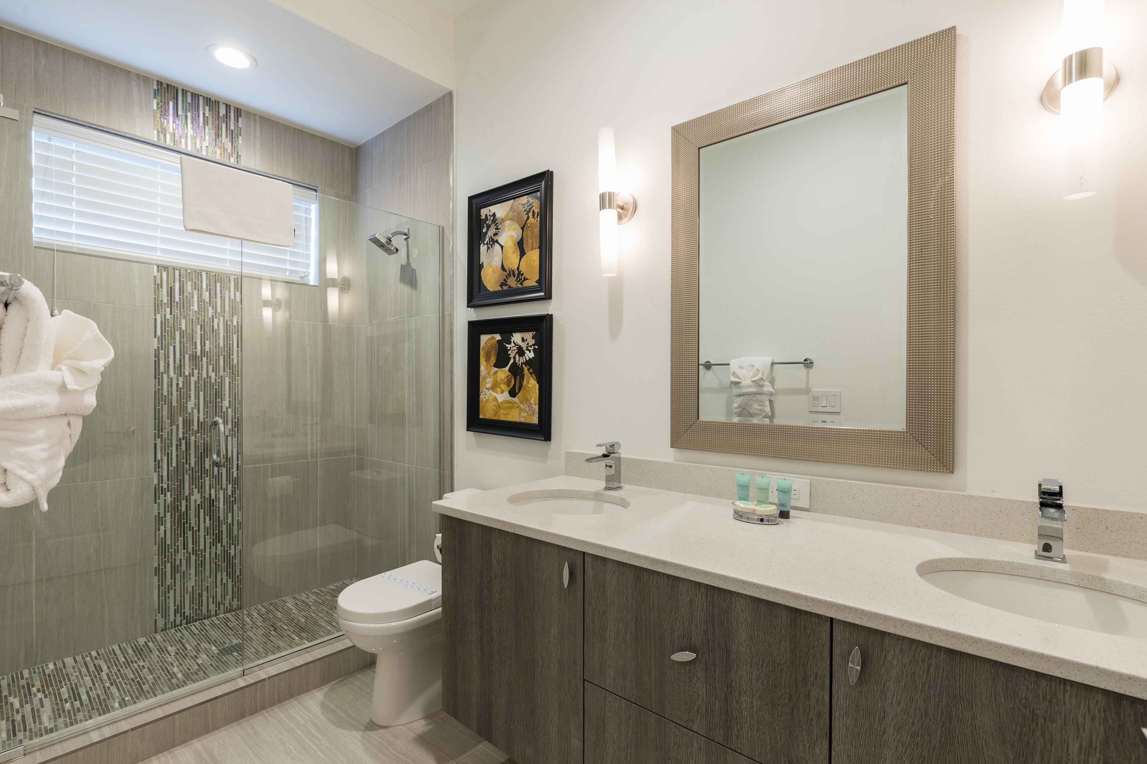 A bedroom with 2x Queen sized beds and an en suite (shower, twin vanities)