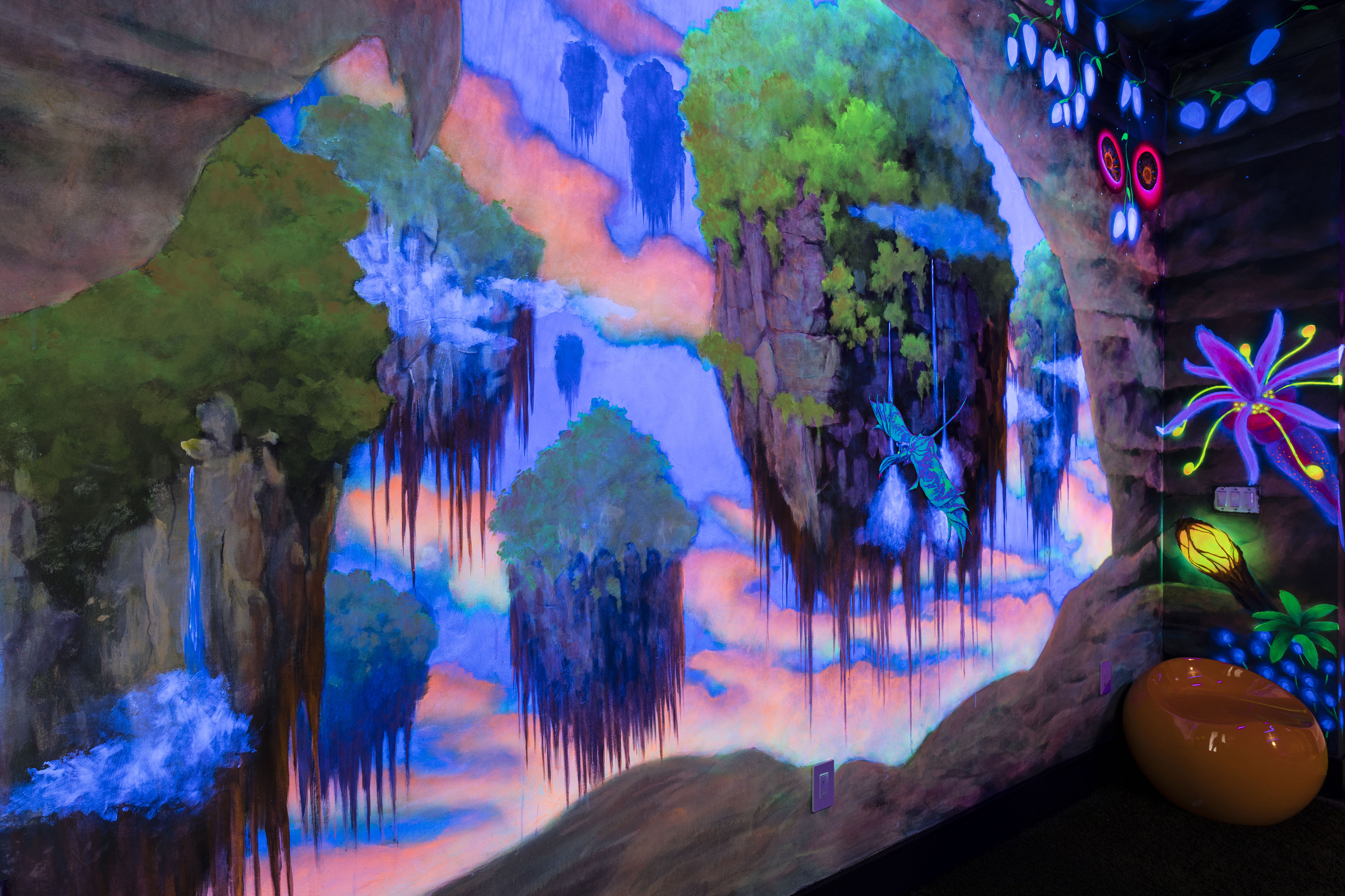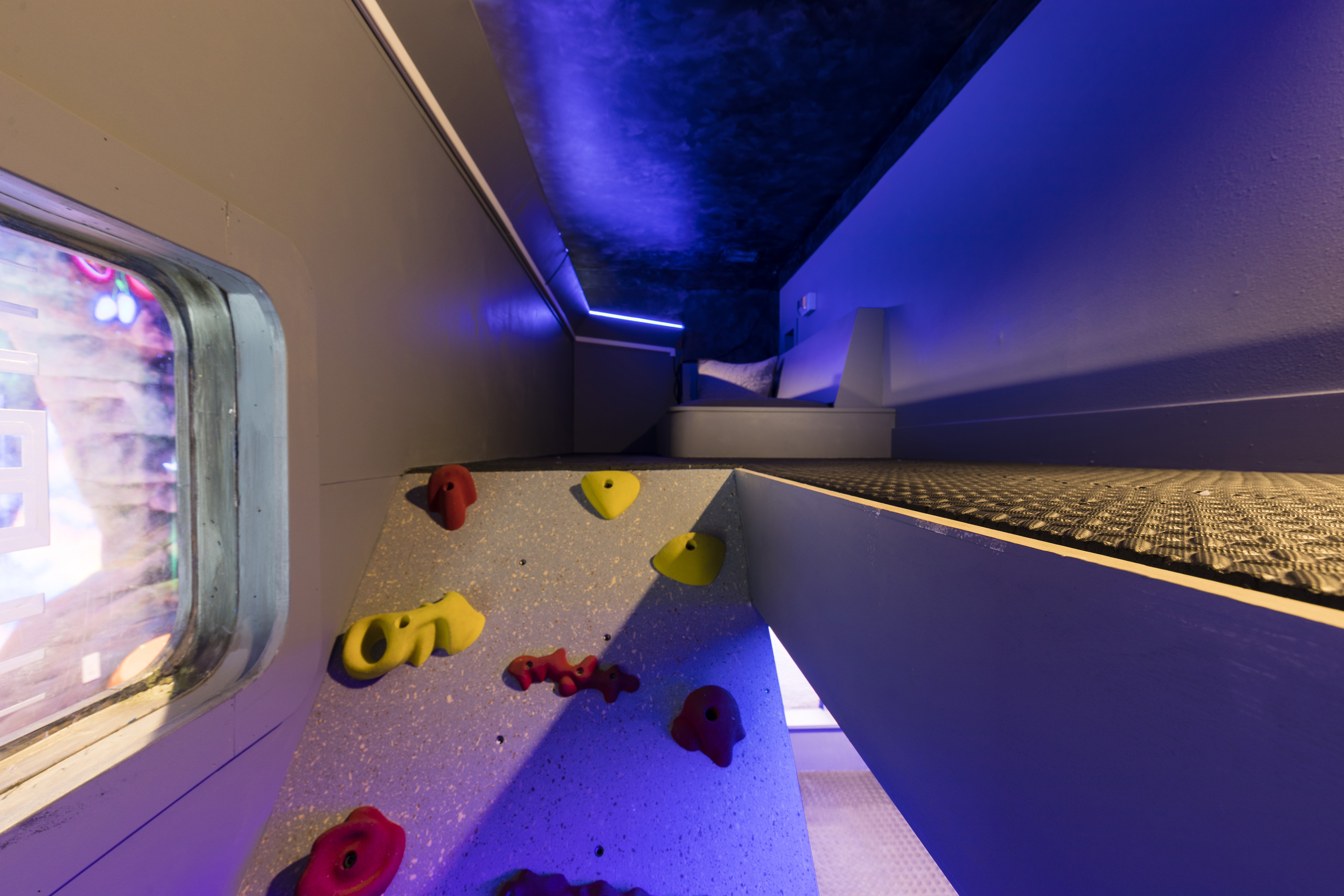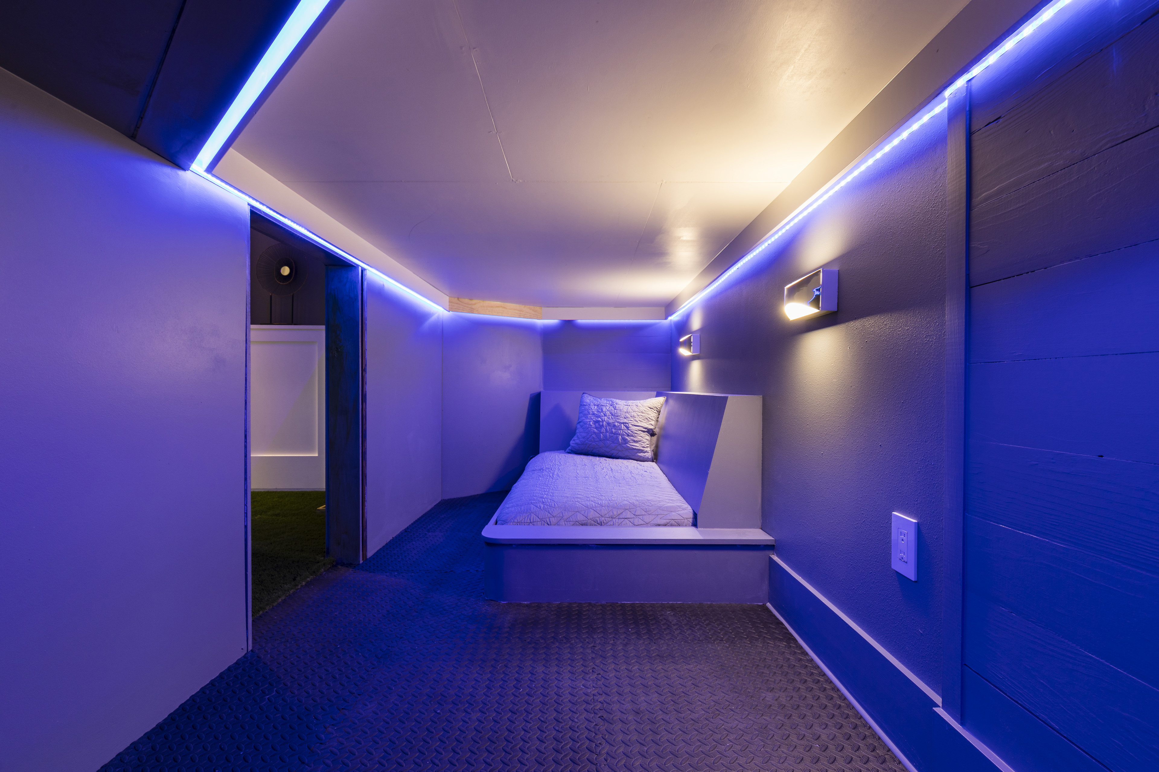 Secret bioluminescent themed bedroom (located behind a bookcase) with bunk beds (2x Twin sized beds-rock ladder separating the beds), balcony access over the front of the home, access to other themed bedrooms through secret tunnel