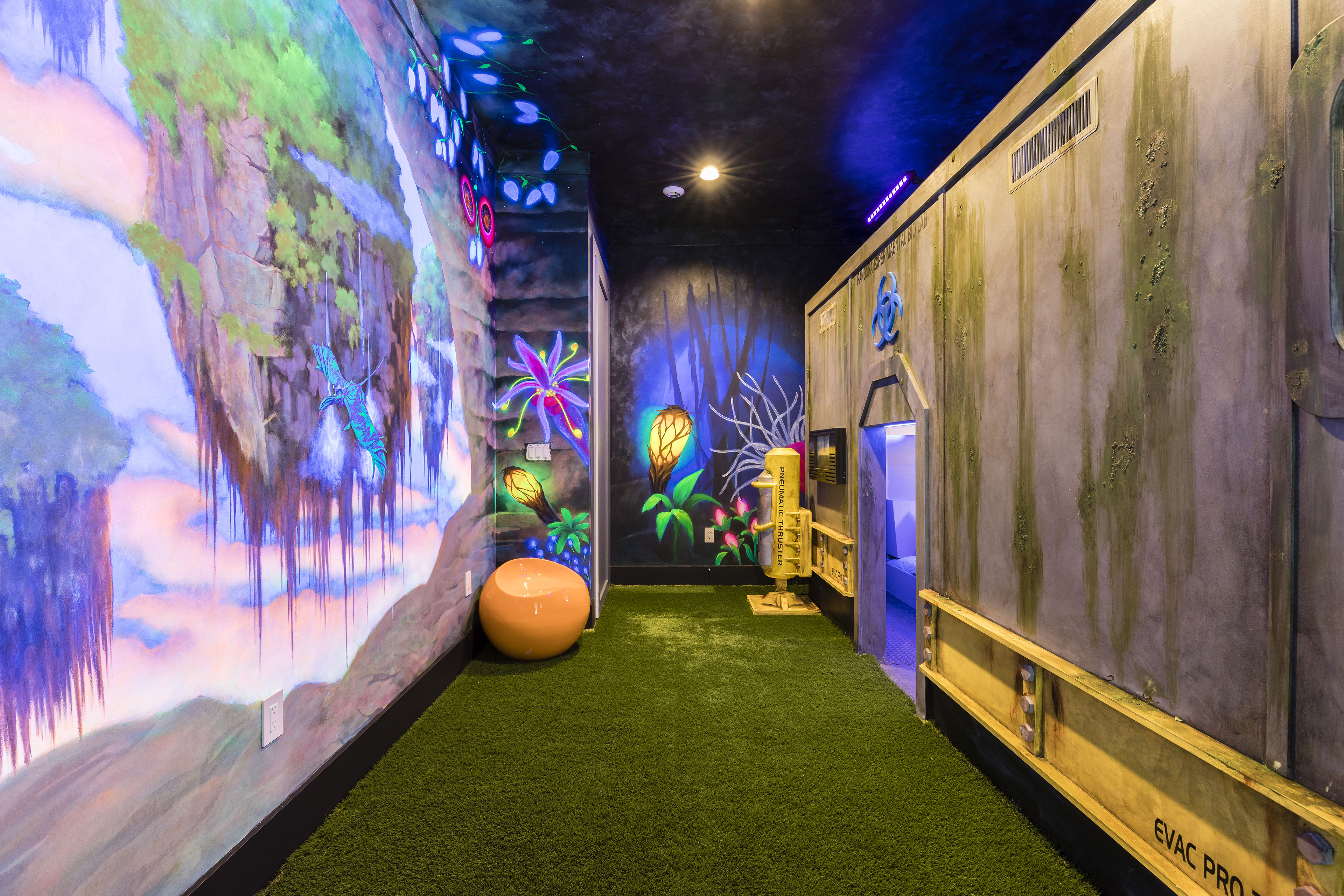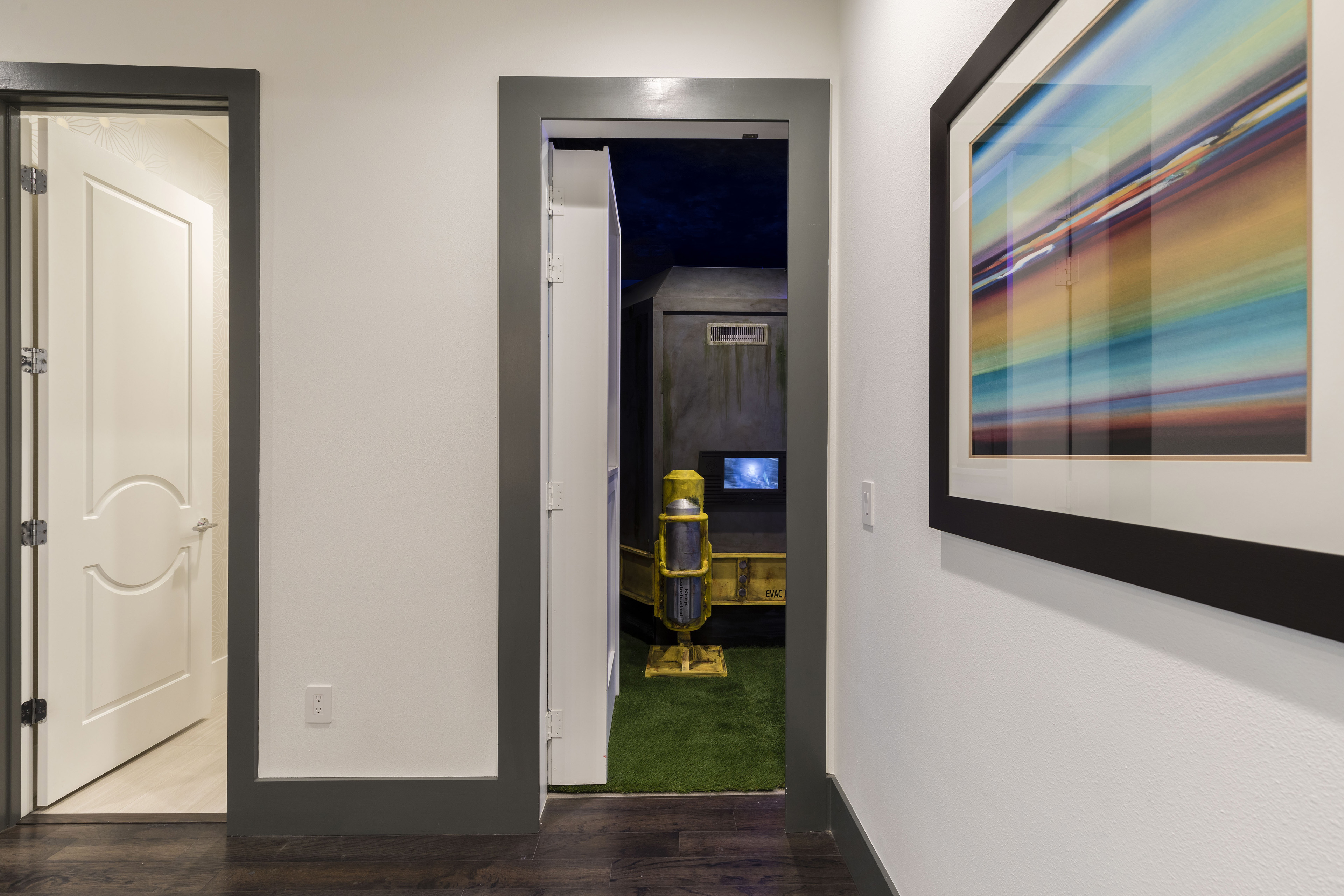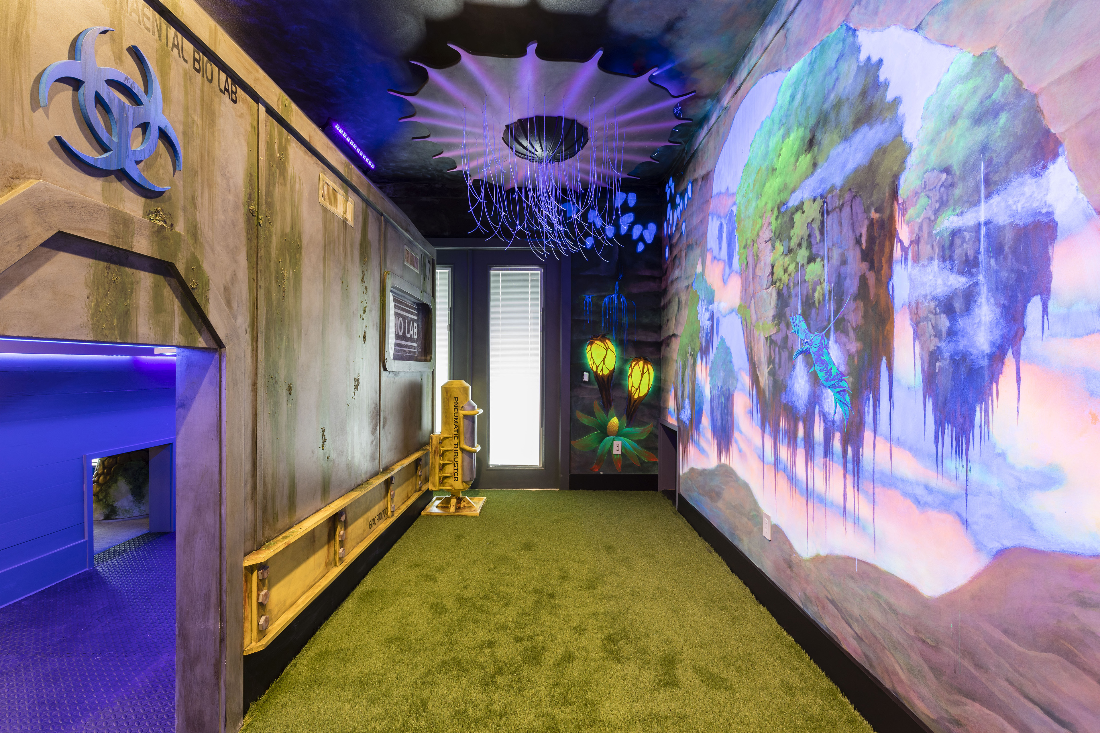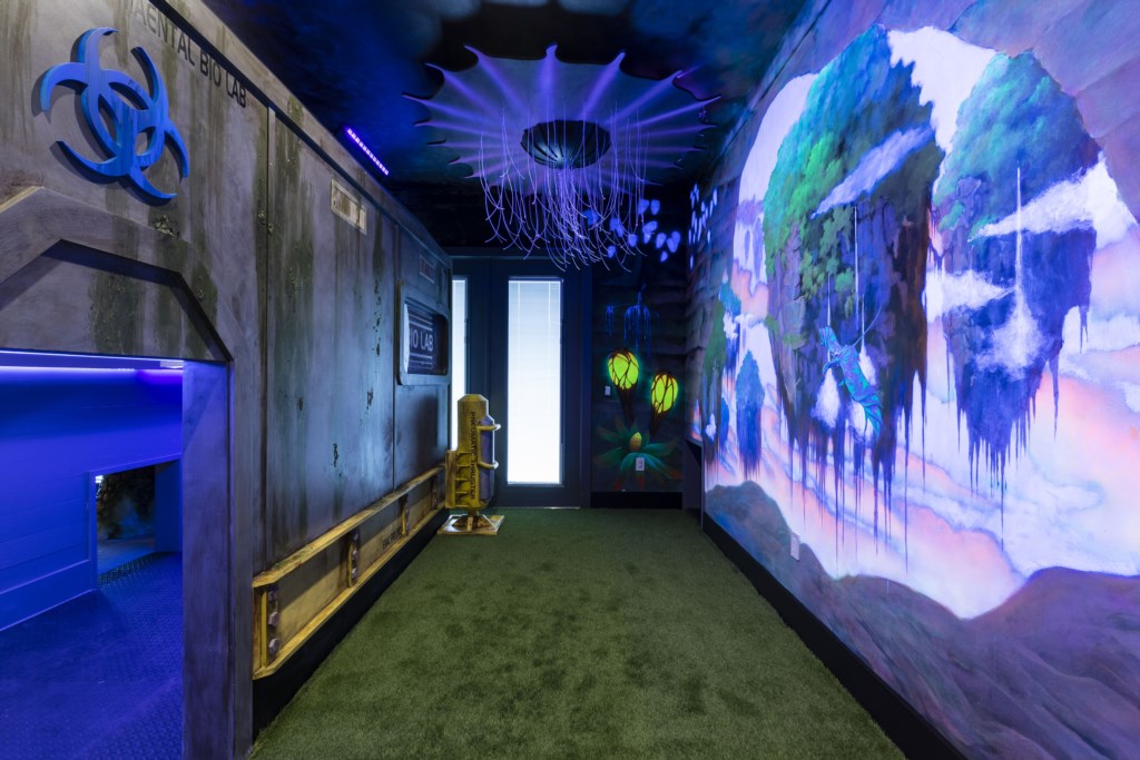 Secret bioluminescent themed bedroom (located behind a bookcase) with bunk beds (2x Twin sized beds-rock ladder separating the beds), balcony access over the front of the home, access to other themed bedrooms through secret tunnel