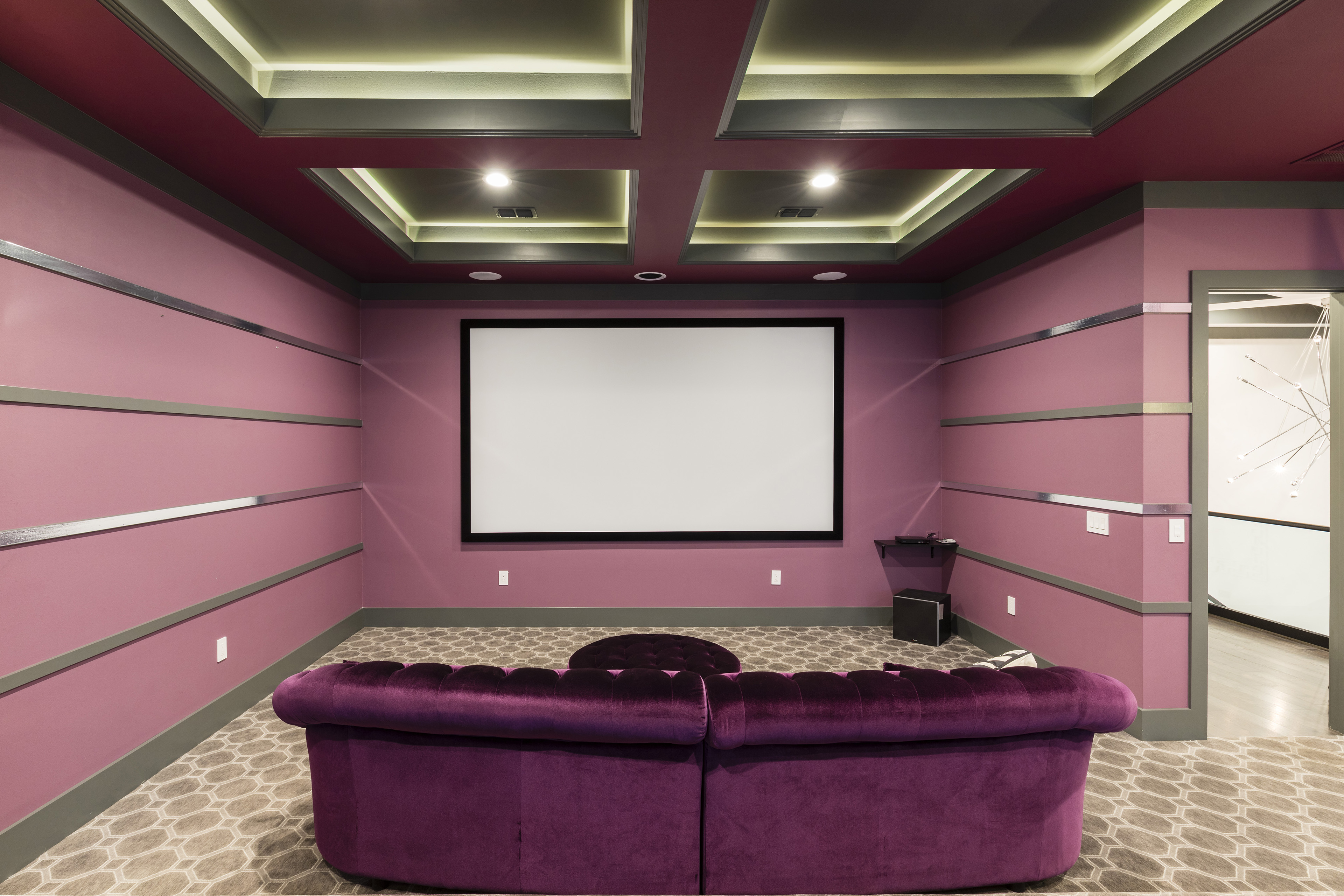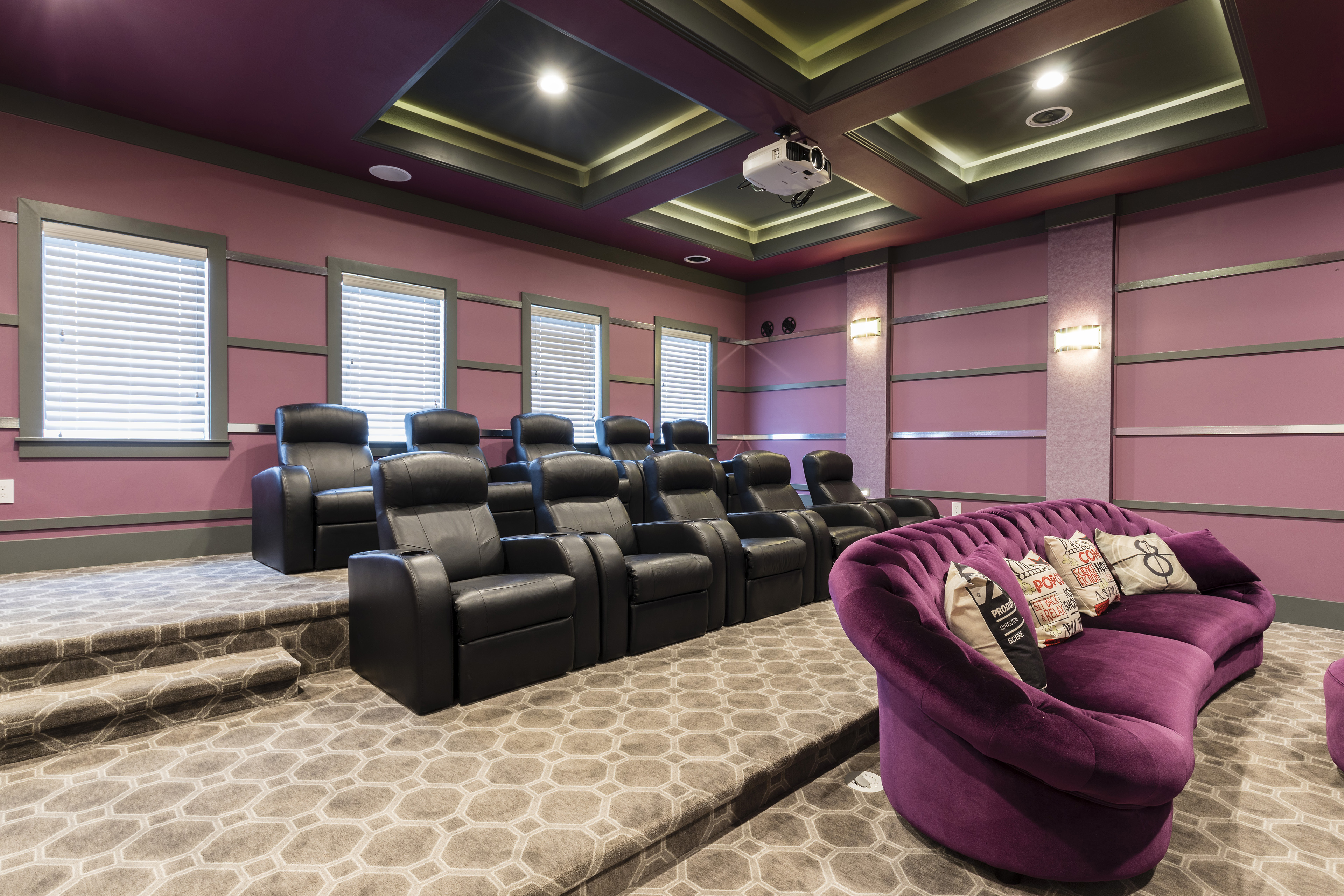 Home theater has a large projection screen, comfortable, sofa, and tiered 10x leather recliners