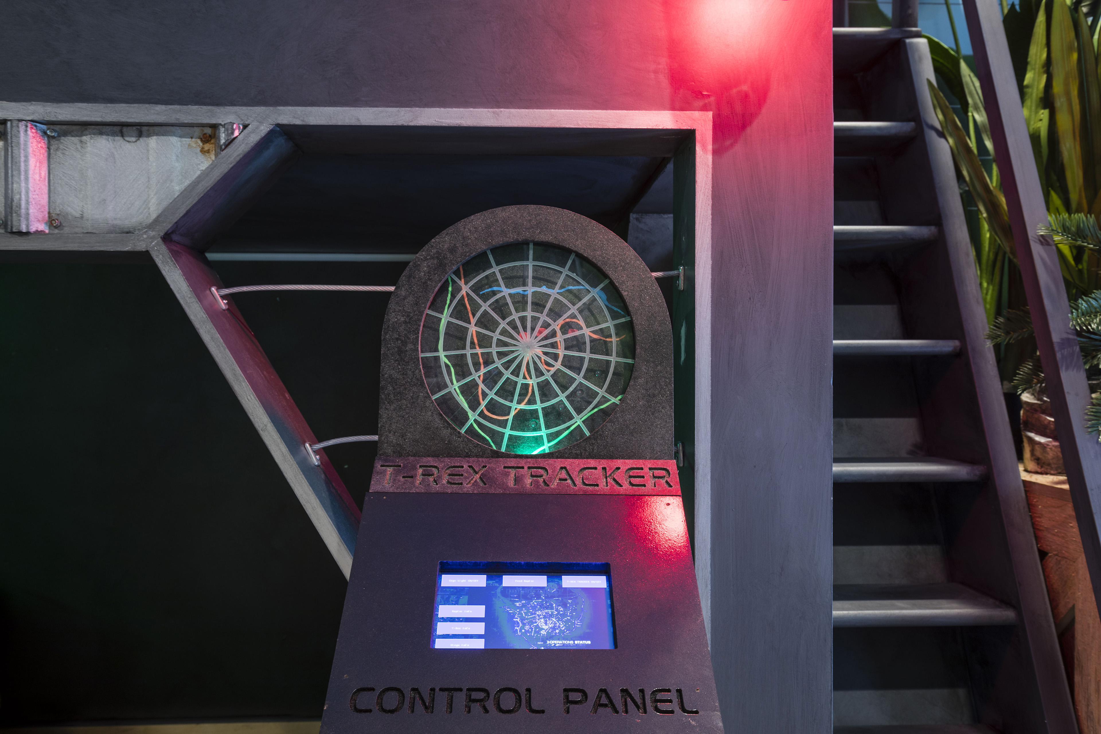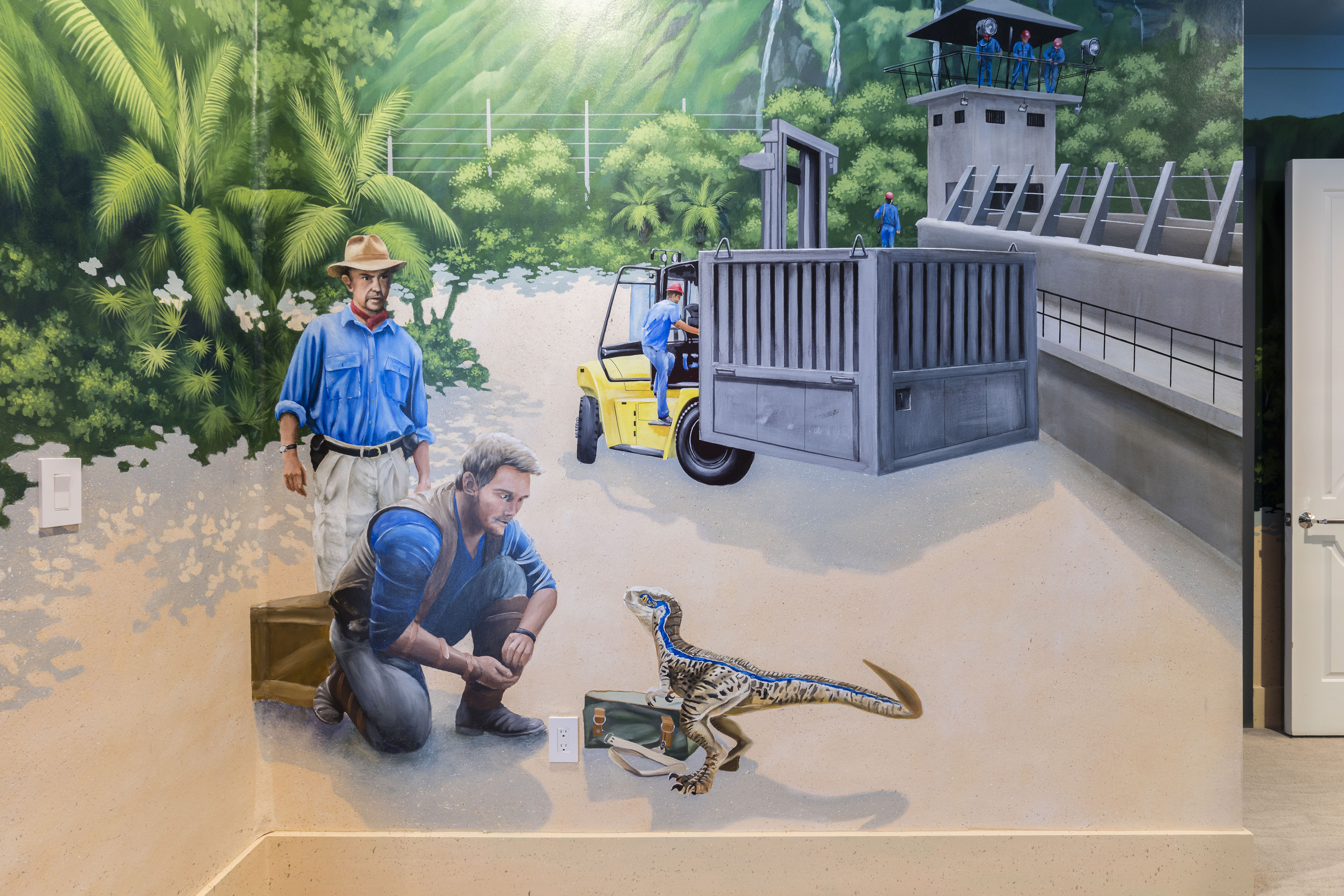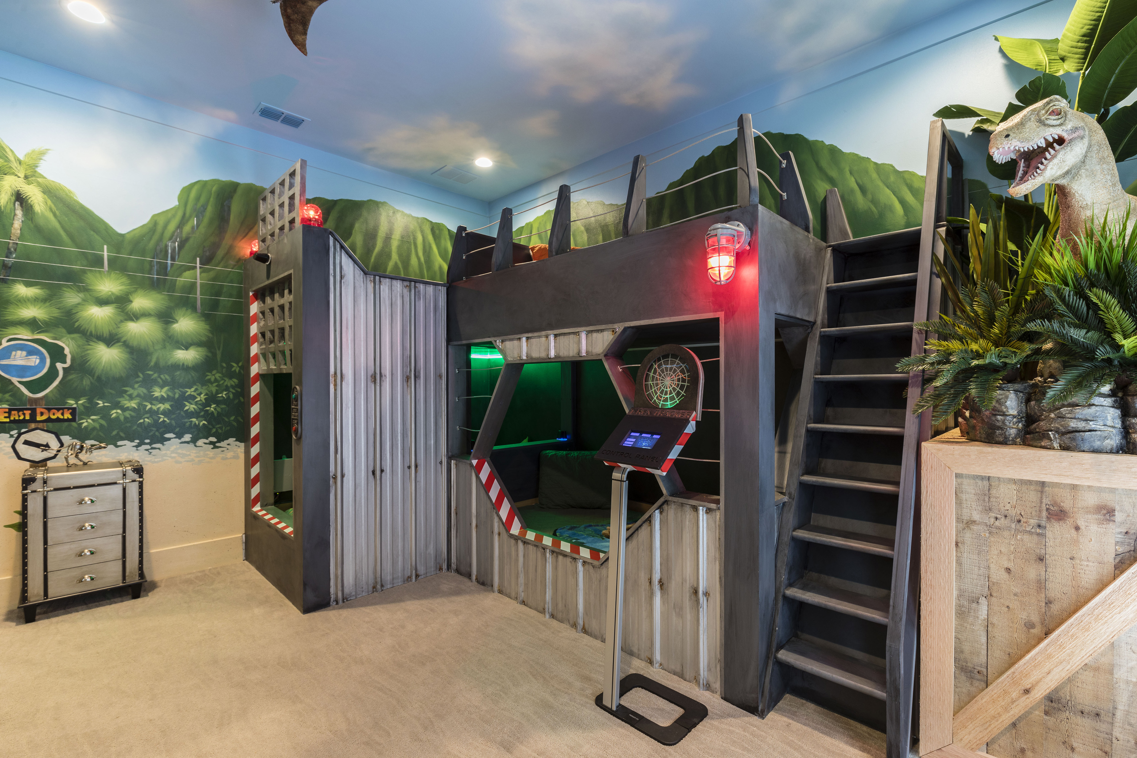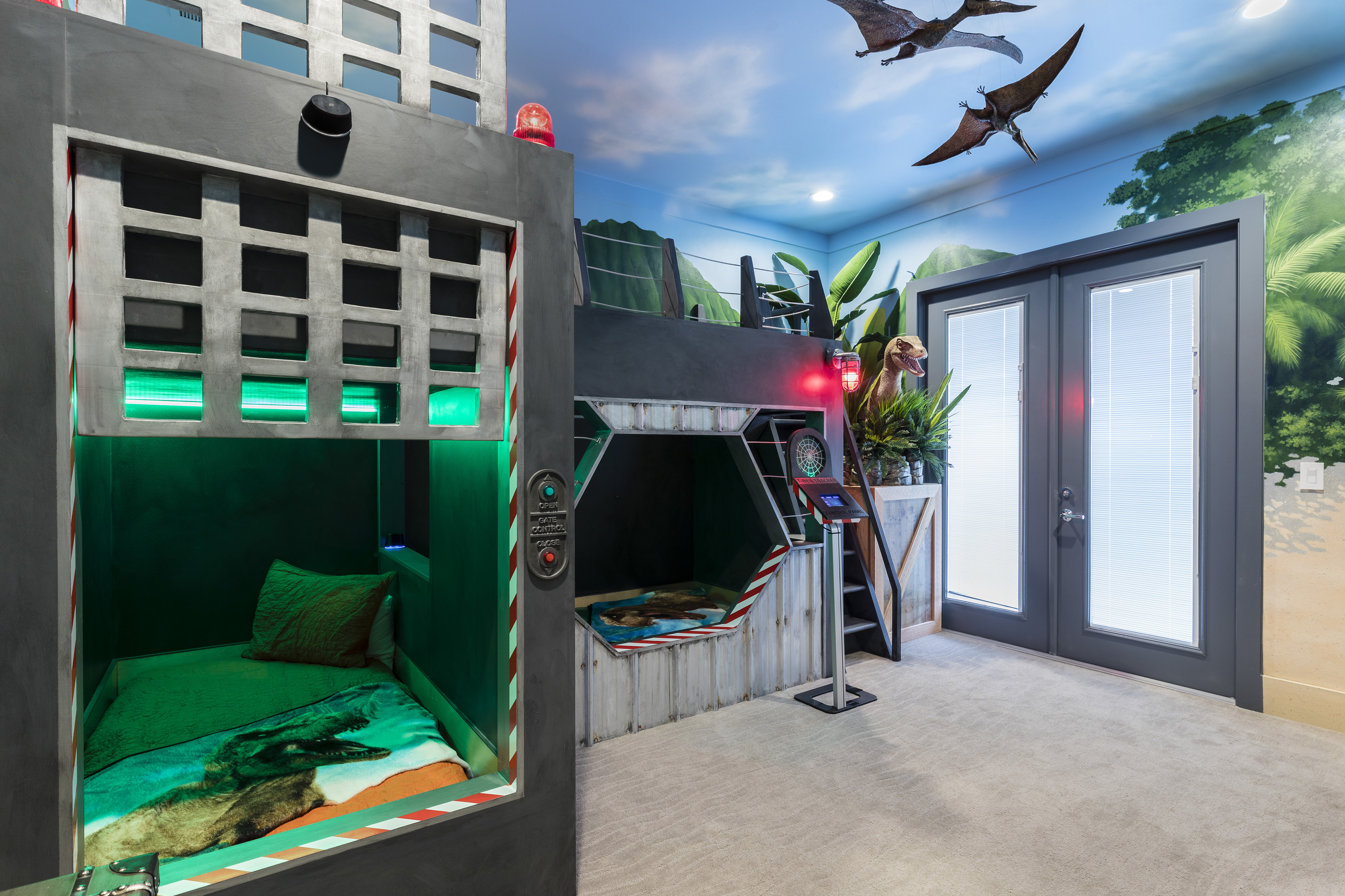 Dinosaur themed bedroom with 2x sets of bunk beds (4x Twin sized beds), en suite (shower/bath combo), balcony access toward the front of the home, access to other themed bedrooms through secret tunnel