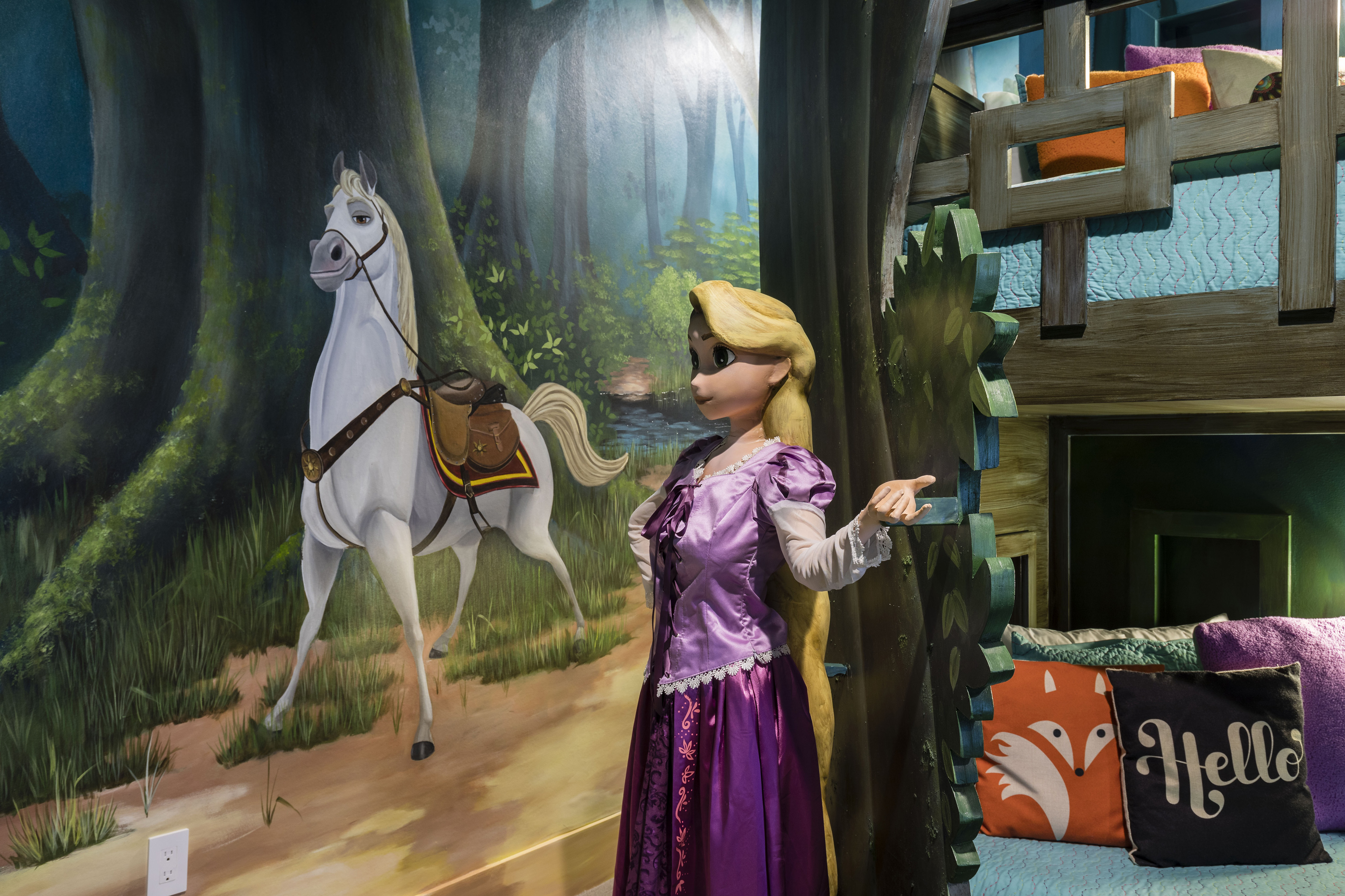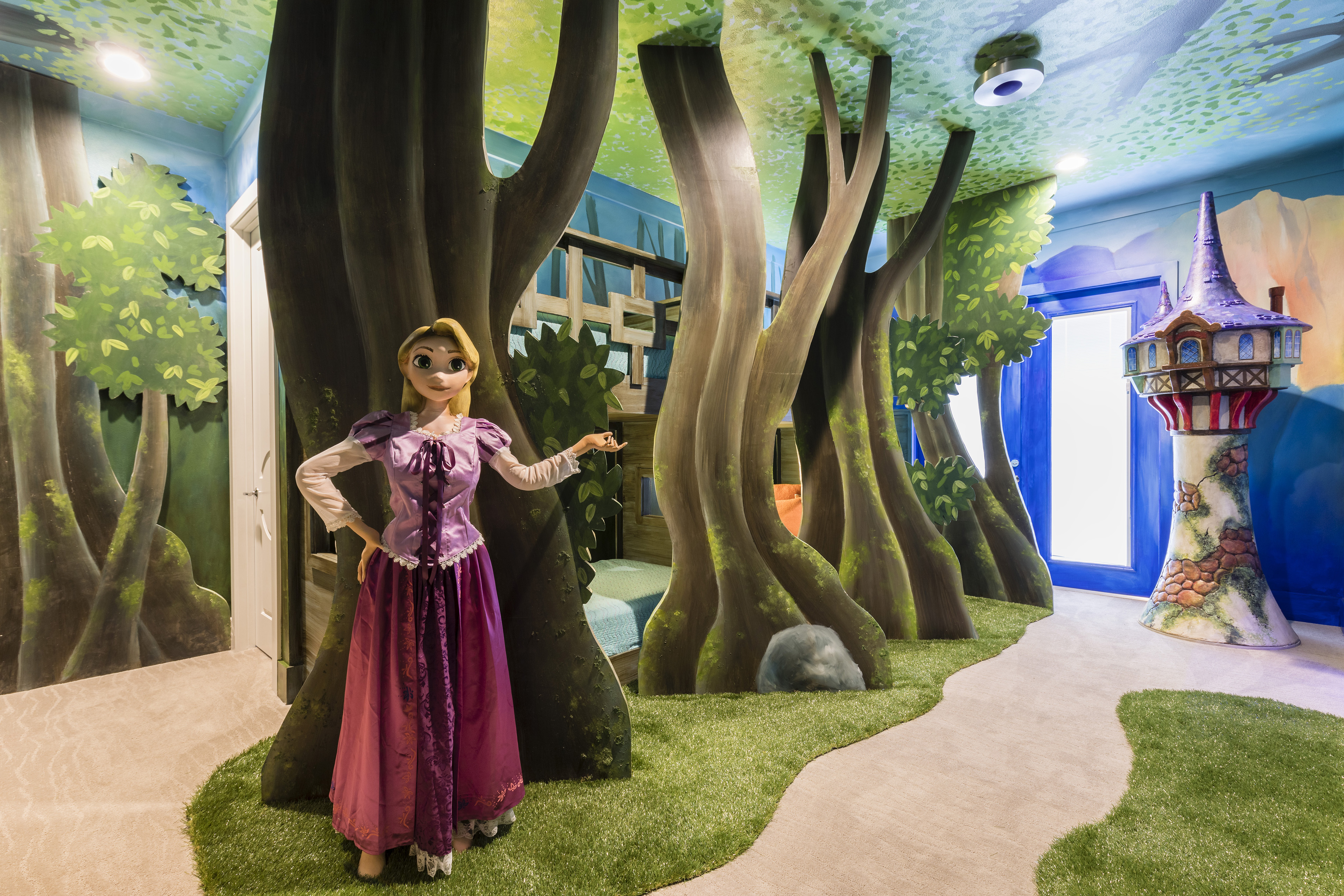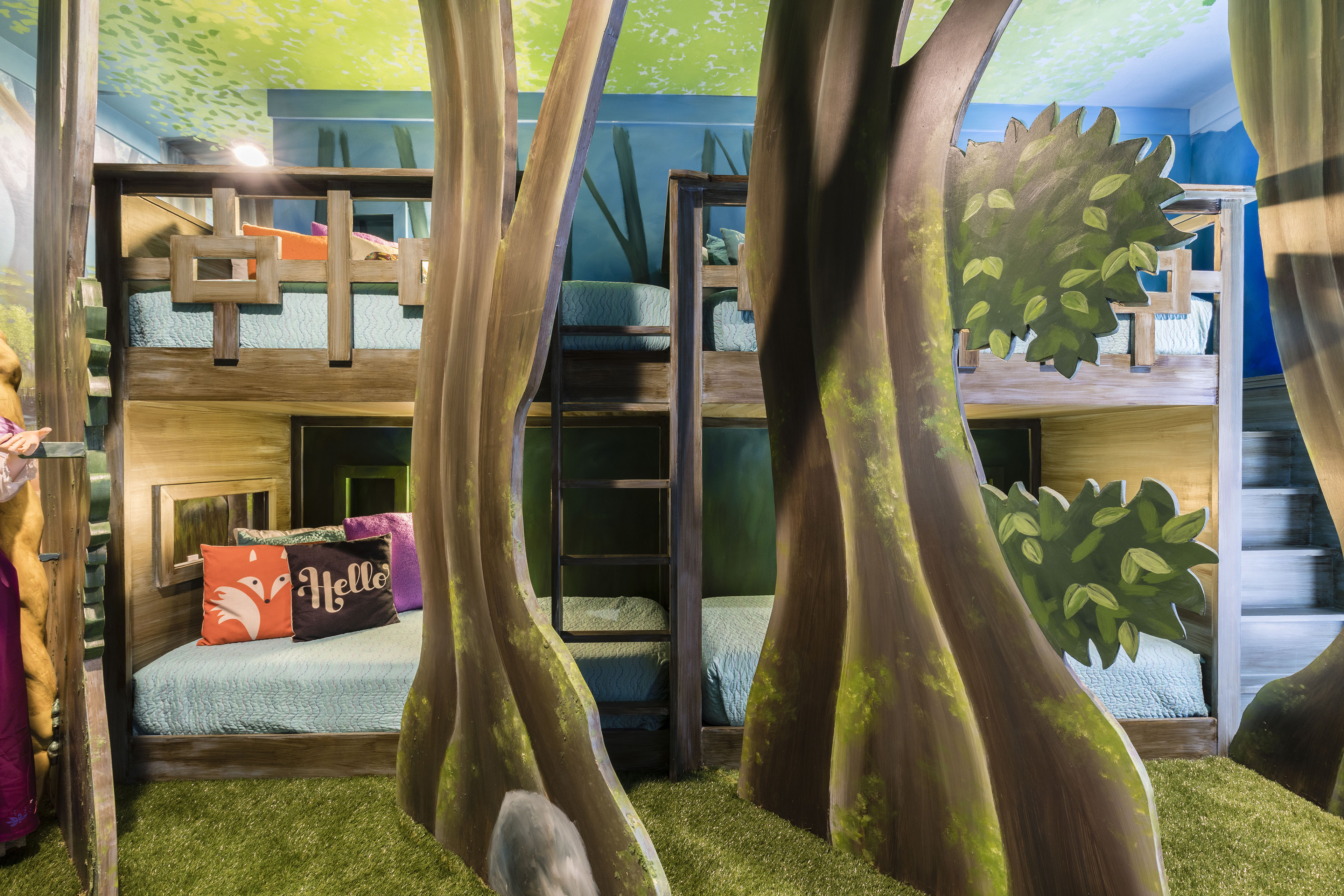 Princess themed bedroom with 2x sets of bunk beds (4x Twin sized beds), en suite (shower), balcony access over the front of the home, access to other themed bedrooms through secret tunnel