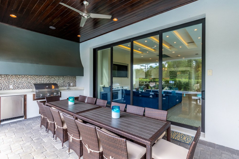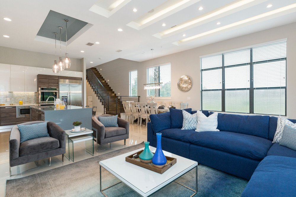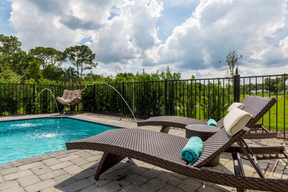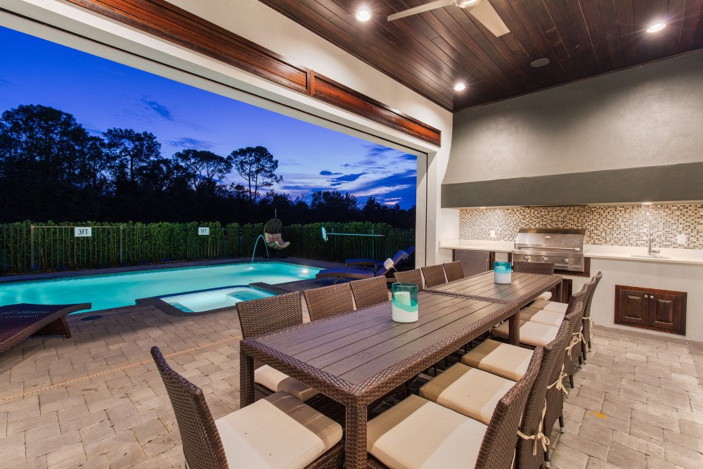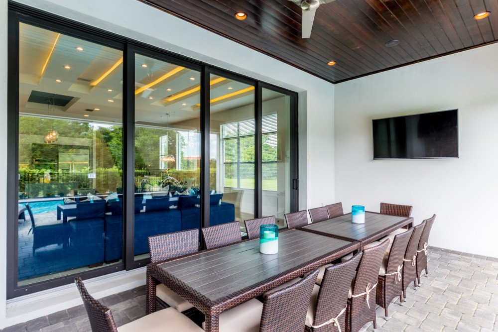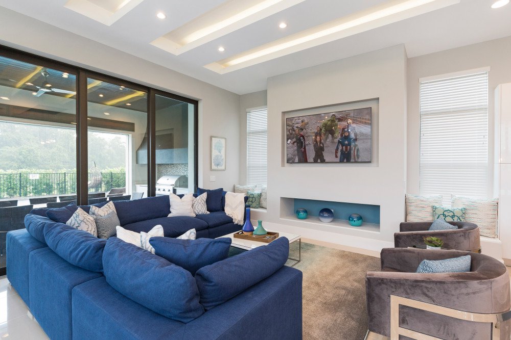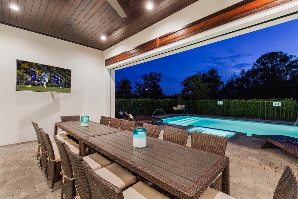 Spacious comfortable seating area with a large sectional and 2x accent chairs overlooking the private pool deck through sliding glass doors