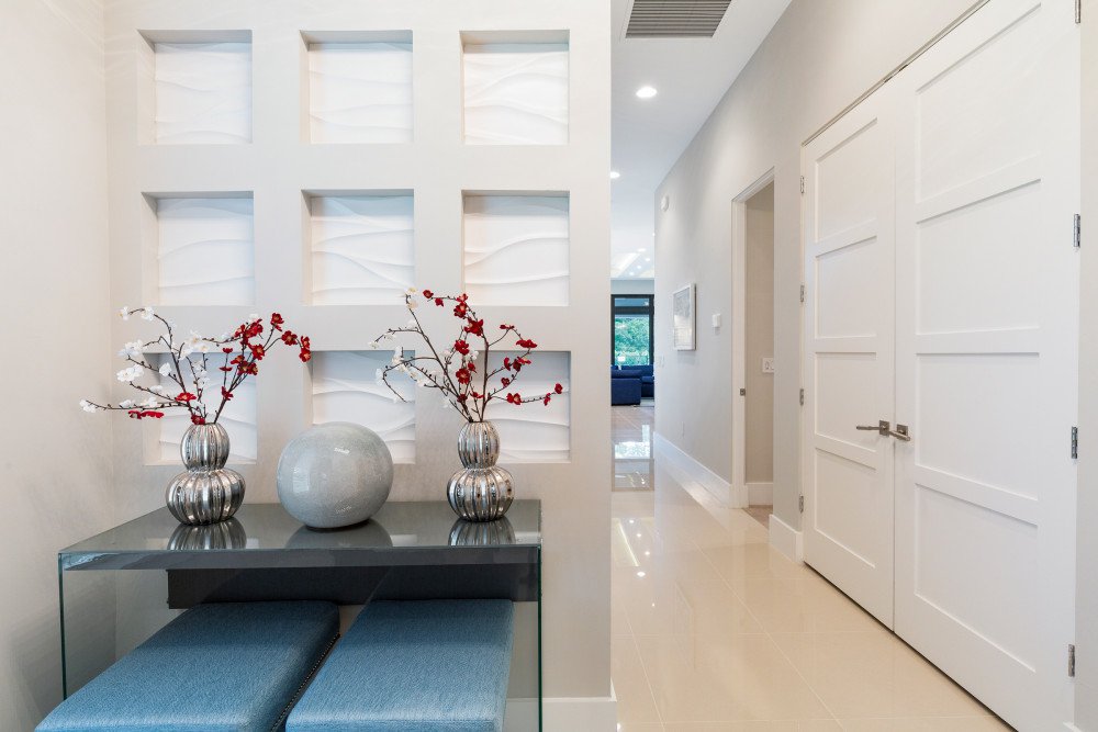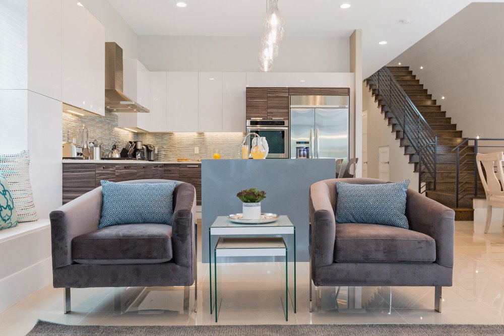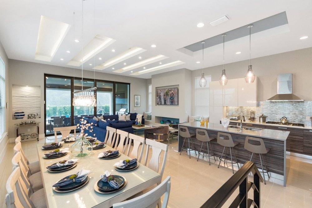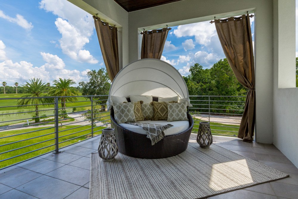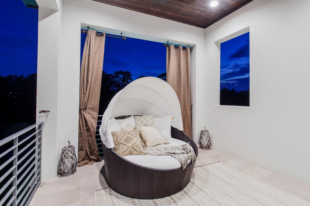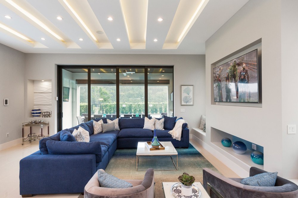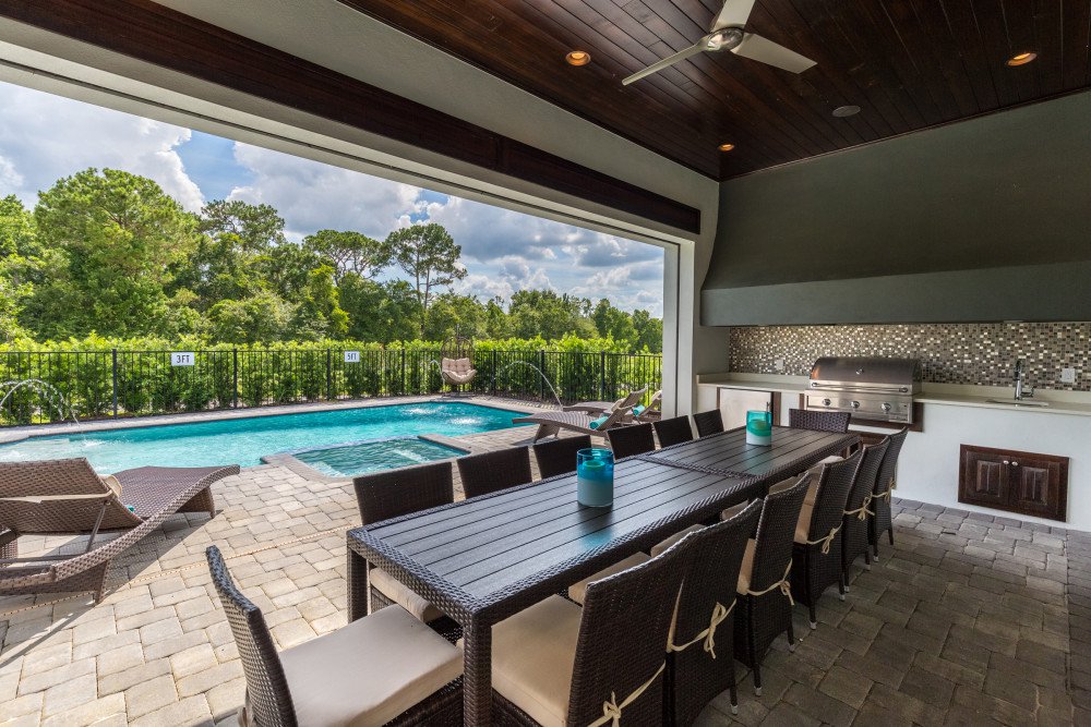 Spacious comfortable seating area with a large sectional and 2x accent chairs overlooking the private pool deck through sliding glass doors