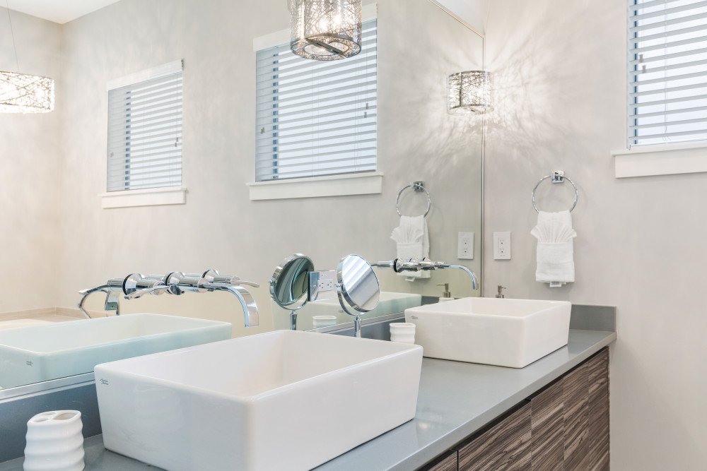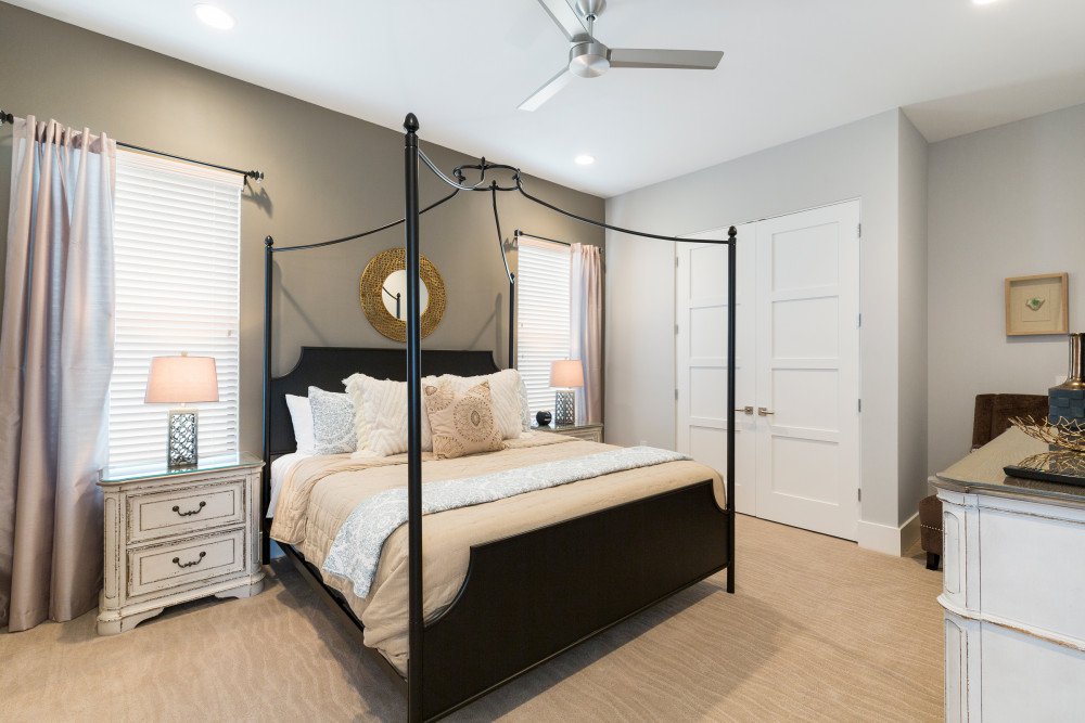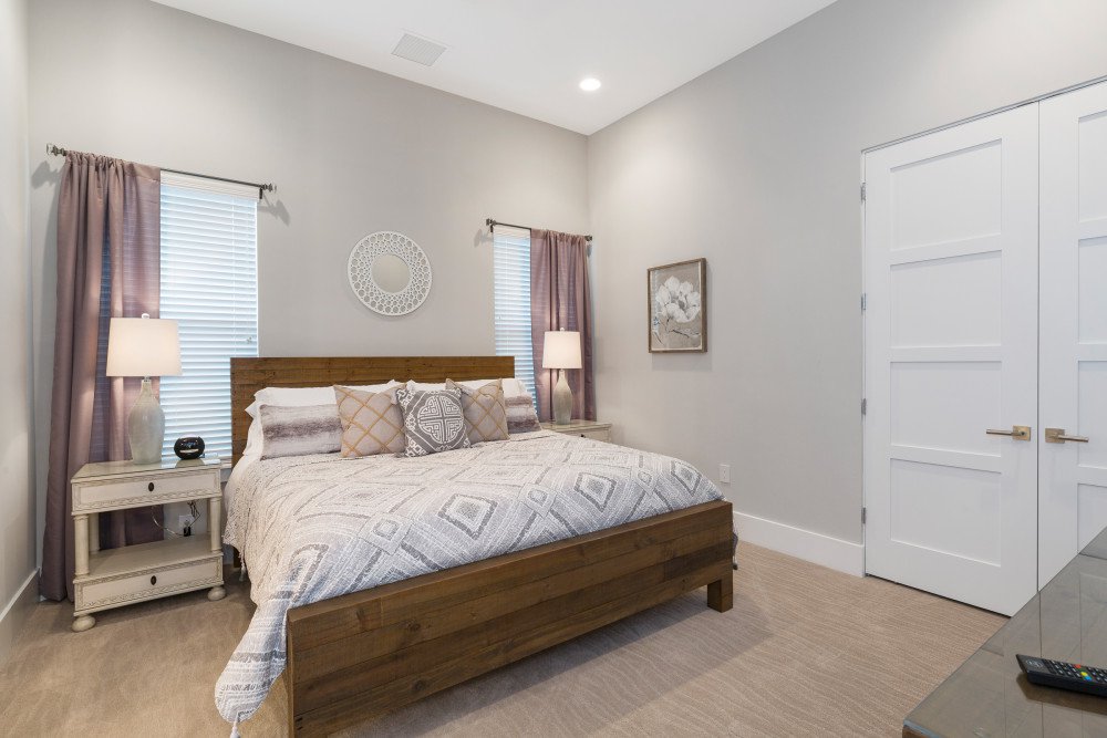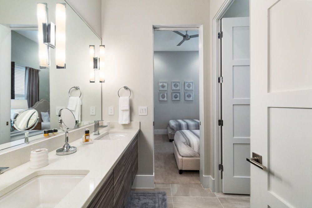 Queen sized bedroom with en suite (Jack/Jill style-shower, twin vanities) connecting to a bedroom with 2x Twin sized beds