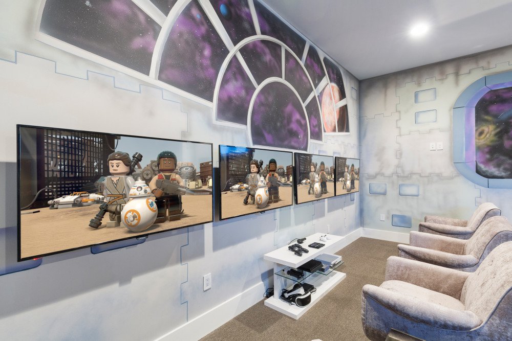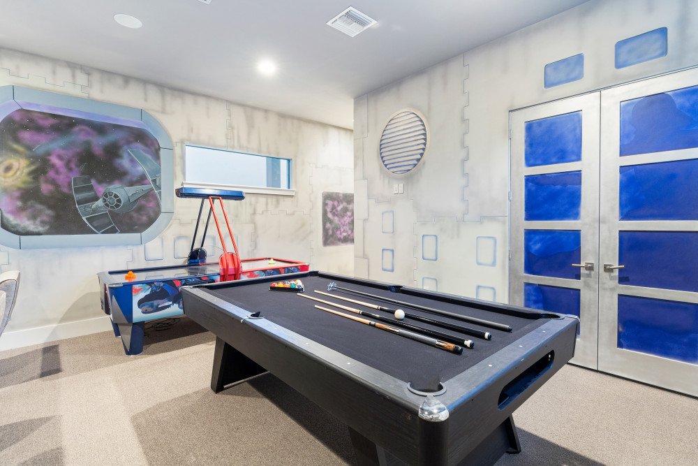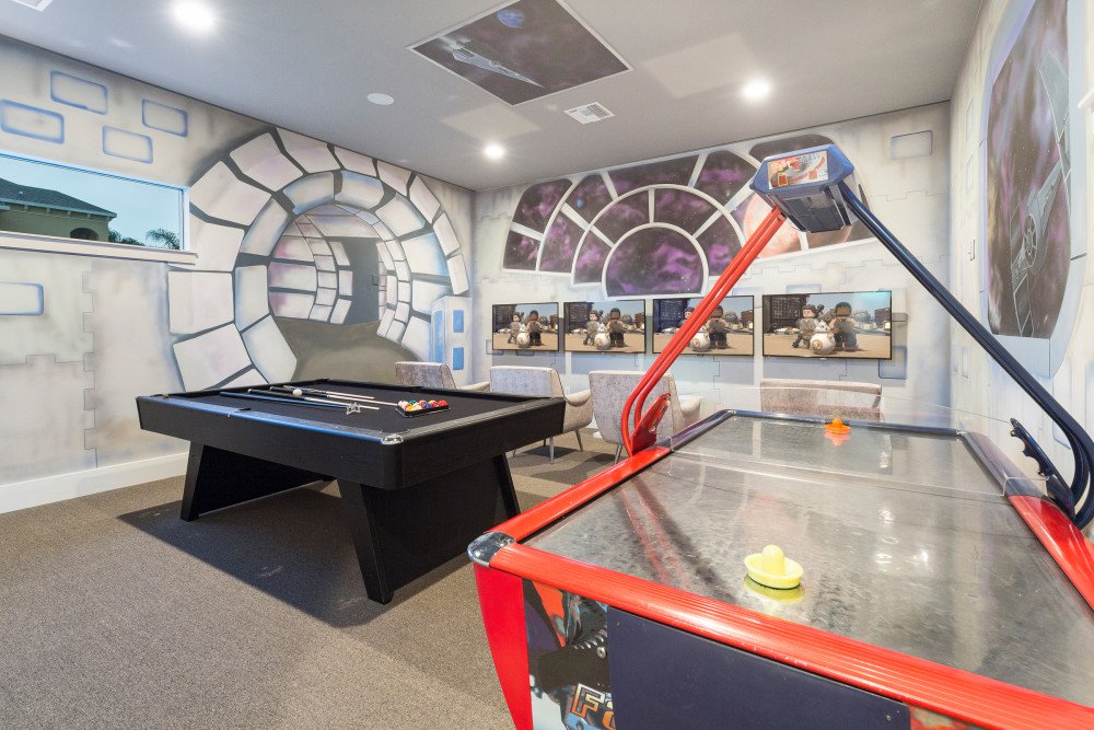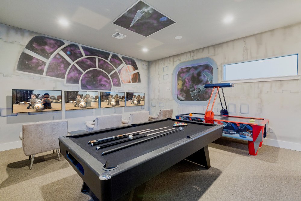 Themed games room has a pool and air hockey table, 4x flat screen TVs with an X-Box One and PS4 video game consoles, 4x accent chairs