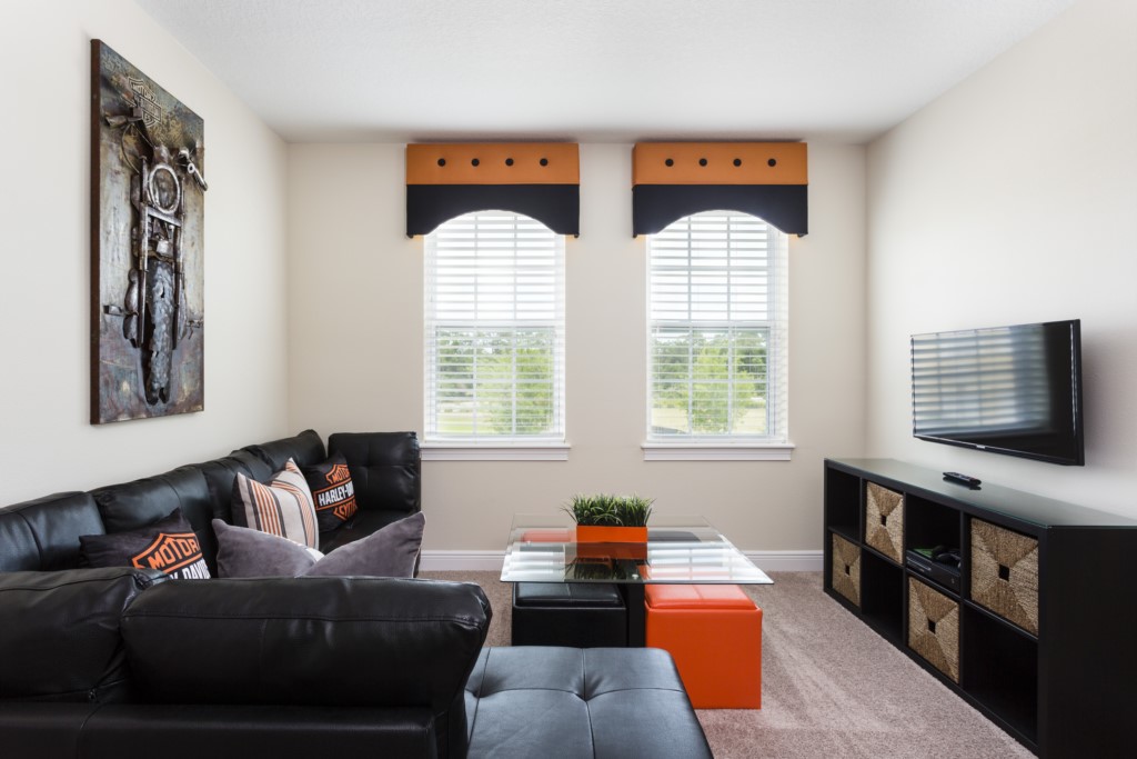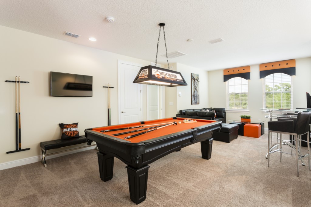 The family loft area includes a pool table, XBOX One and two TVs, in a Harley Davidson themed setting.