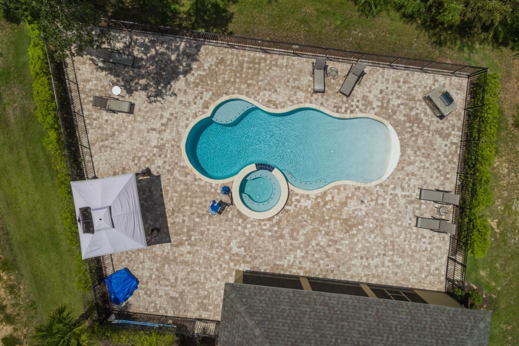 The oversized west facing pool deck includes a covered lanai, complete with screen and six seat dining table under the lanai.
