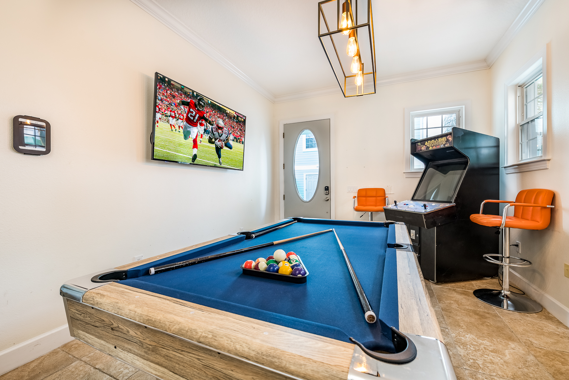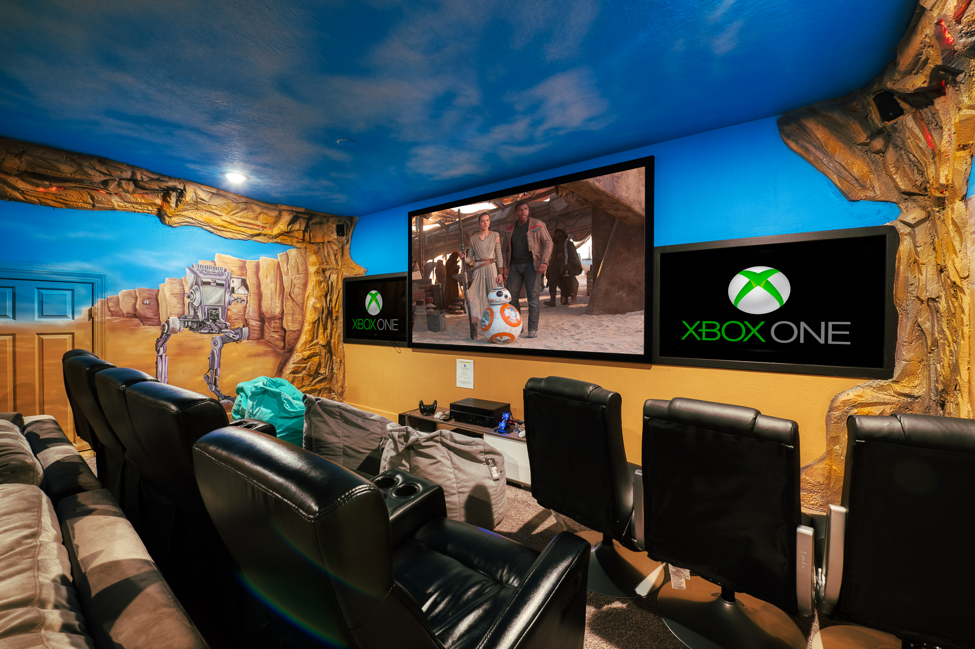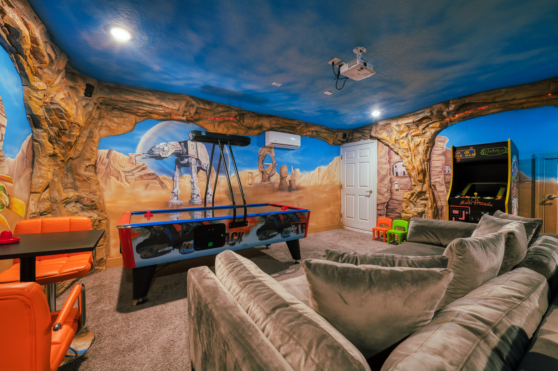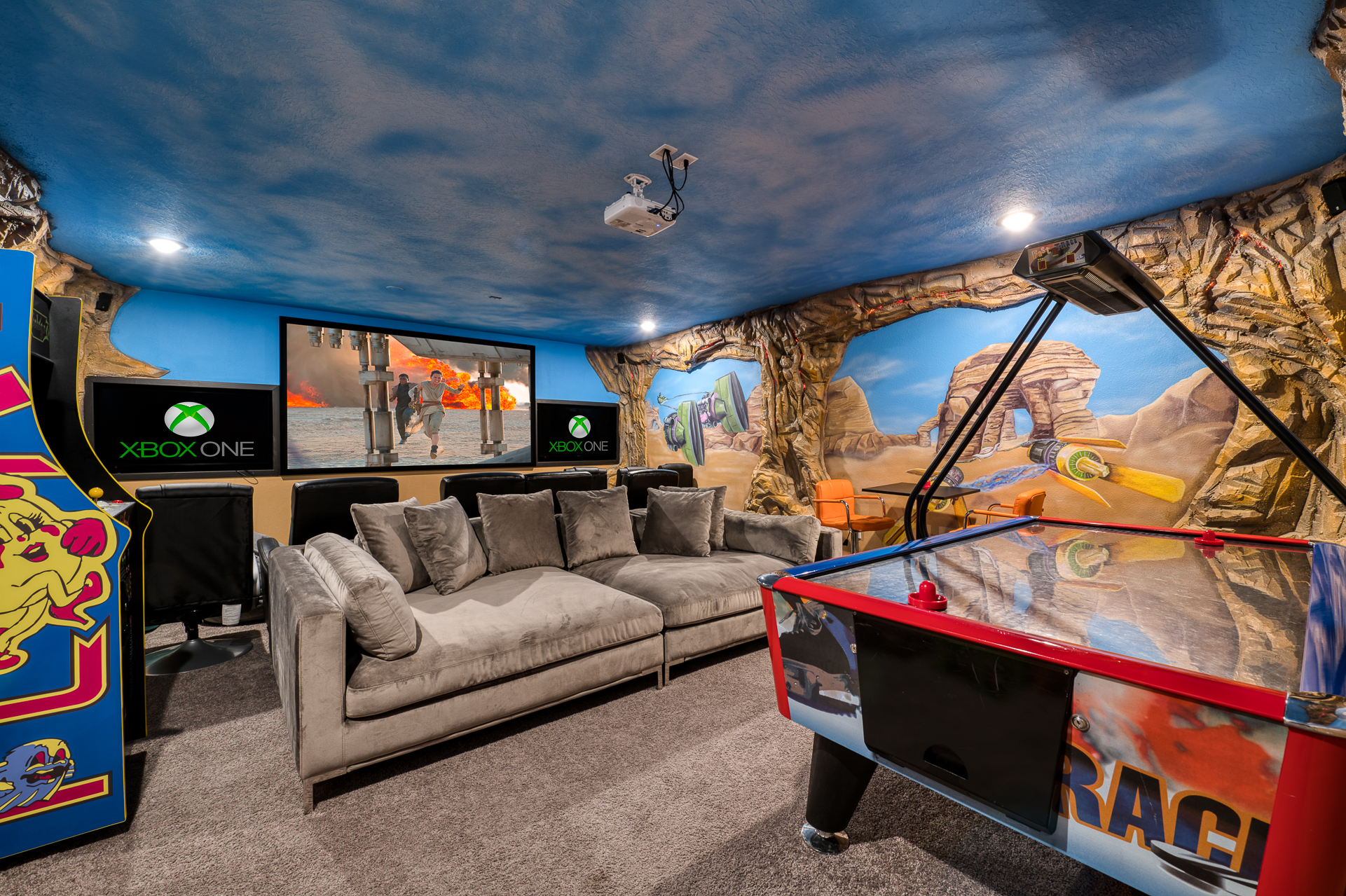 Galatactic themed games room has a large projection screen, comfortable sectional, theater seats and video gaming chairs, air hockey table, multi-arcade video game, 2x seat hight top table