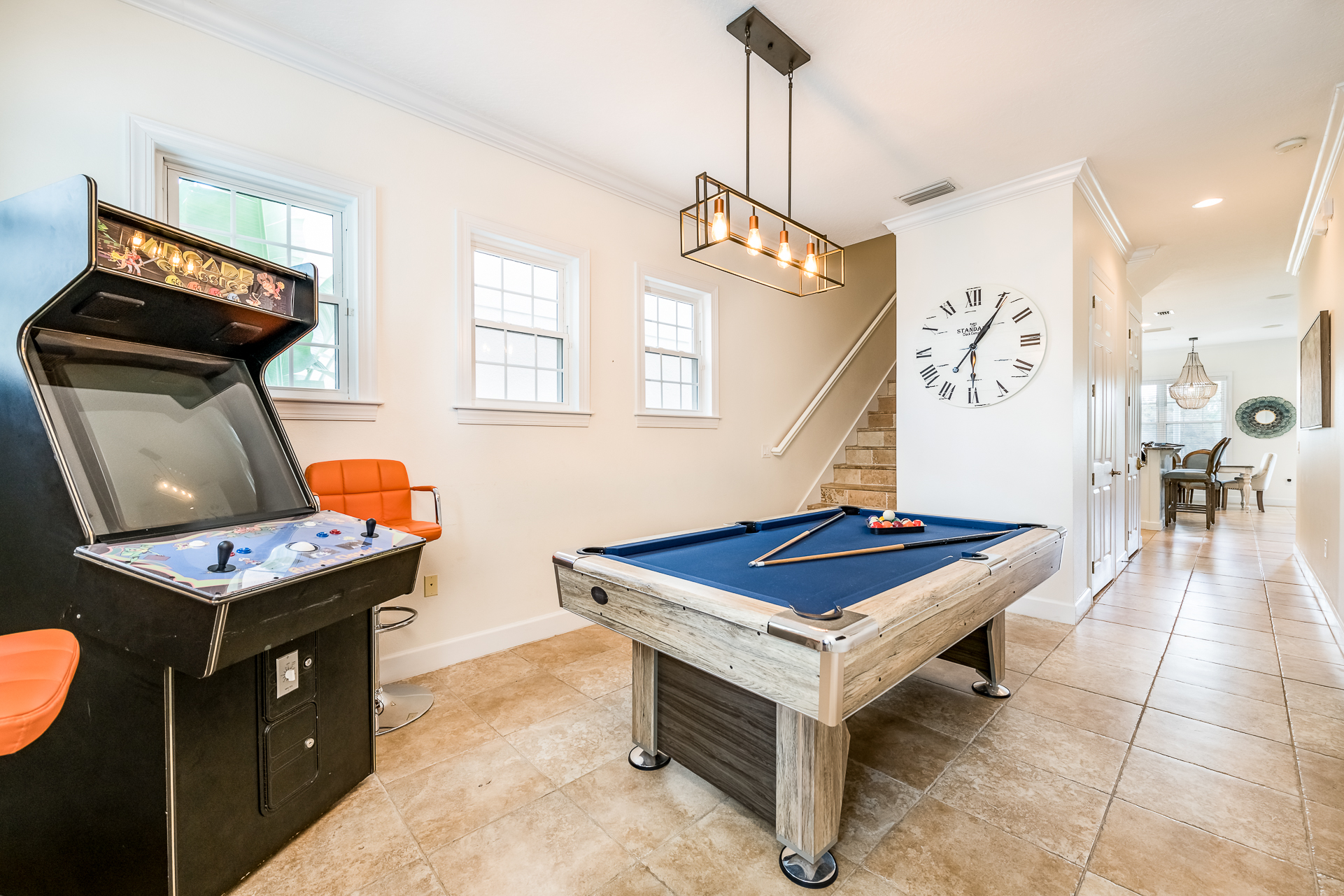Themed upper floor loft area has 2x flat screen TVs with an X-Box One video game console, 4x children's bean bag chairs, giant connect 4 and kid's toys, balcony access over the pool deck (2x patio chairs)