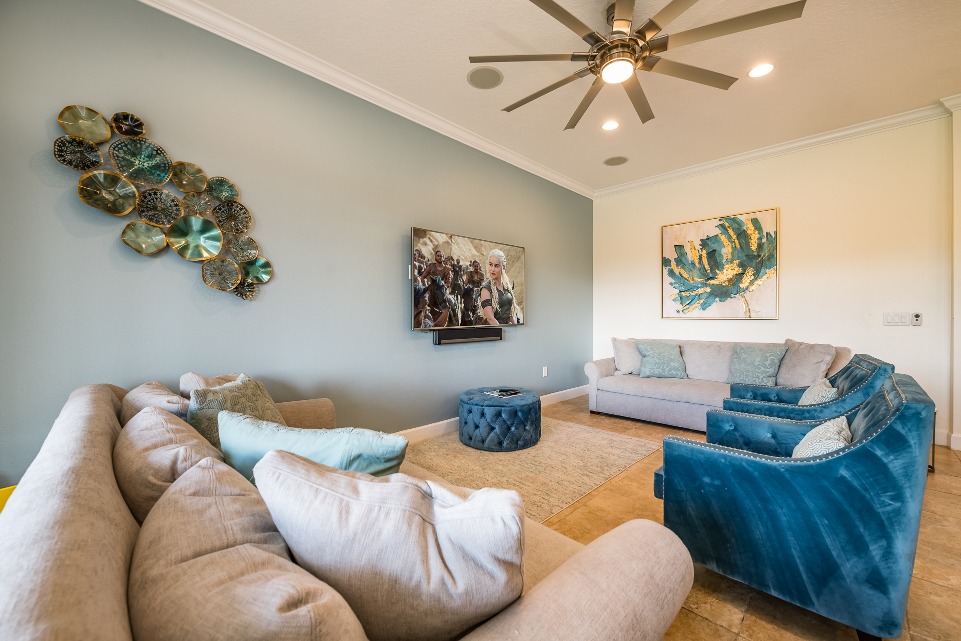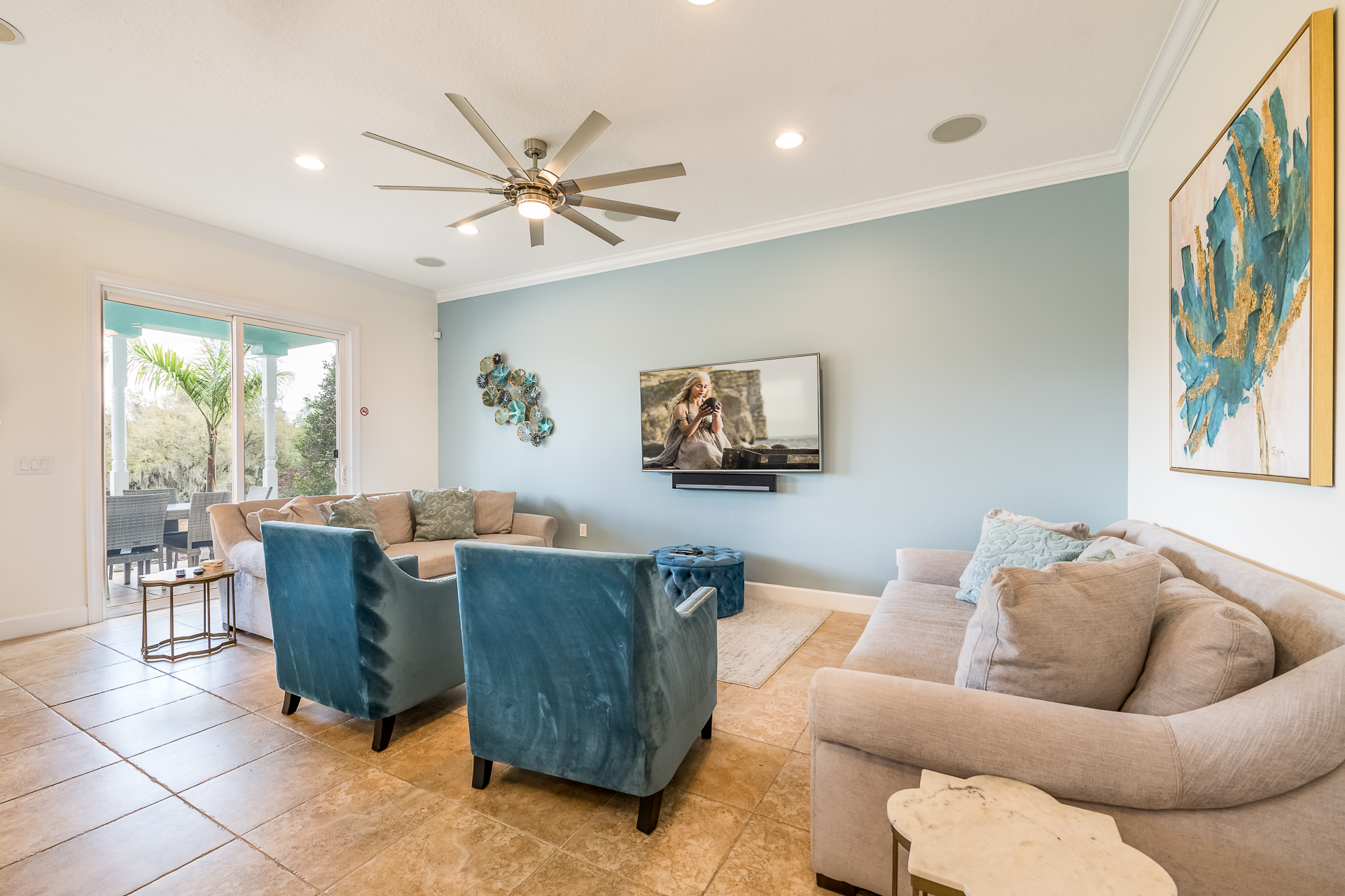 Spacious comfortable seating area with 2x sofas and 2x accent chairs overlooking the private pool deck through sliding glass doors