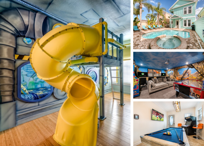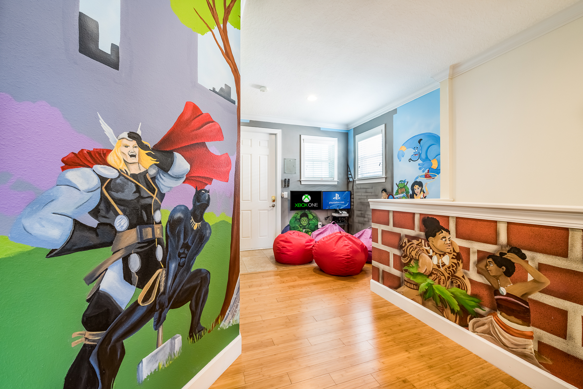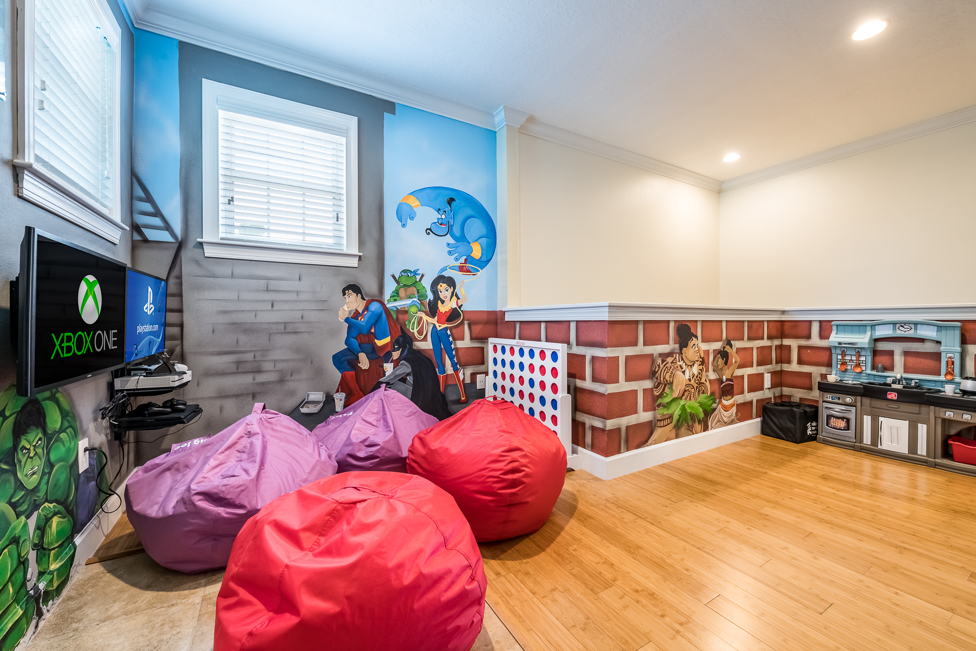 W341 offers sleeping space for up to 16 people with bedrooms across both floors including a private family suite across the courtyard and a children's themed bedroom with a slide! The entertainment does not end at the theme parks with a themed games room equipped with an air hockey table, themed upper floor loft area with an X-Box One video game console, and a pool table in the foyer!