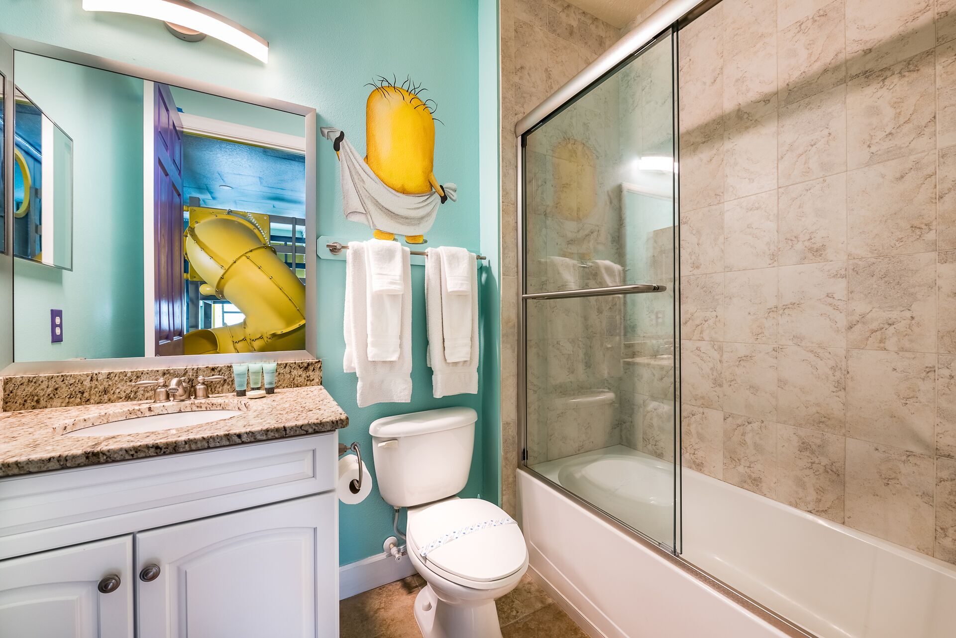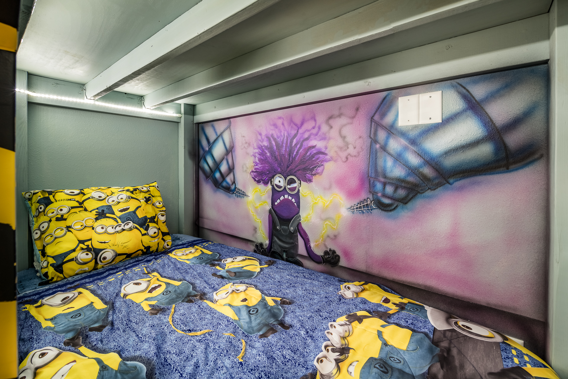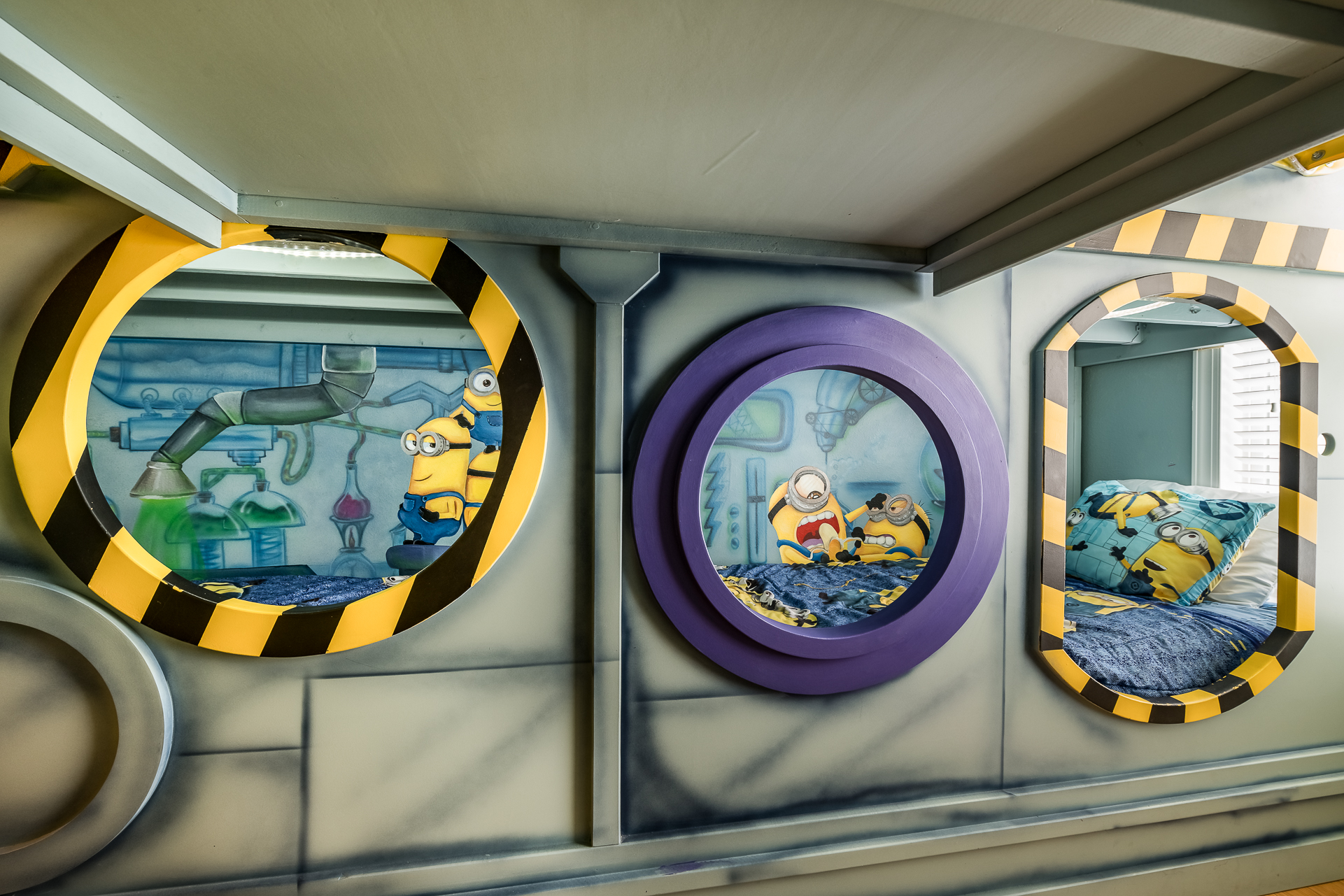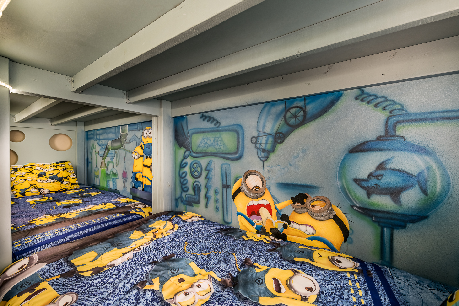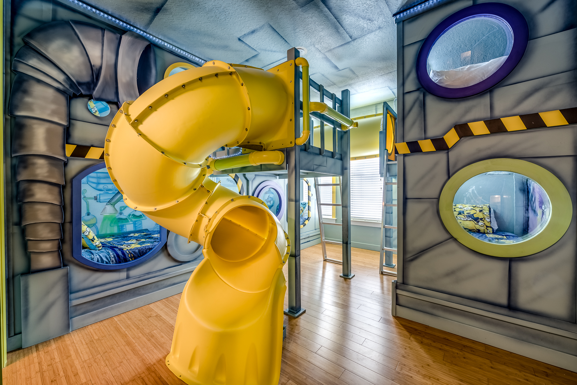 Themed bedroom with 3x sets of bunk beds (6x Twin sized beds total), en suite (shower/bath combo), children's slide
