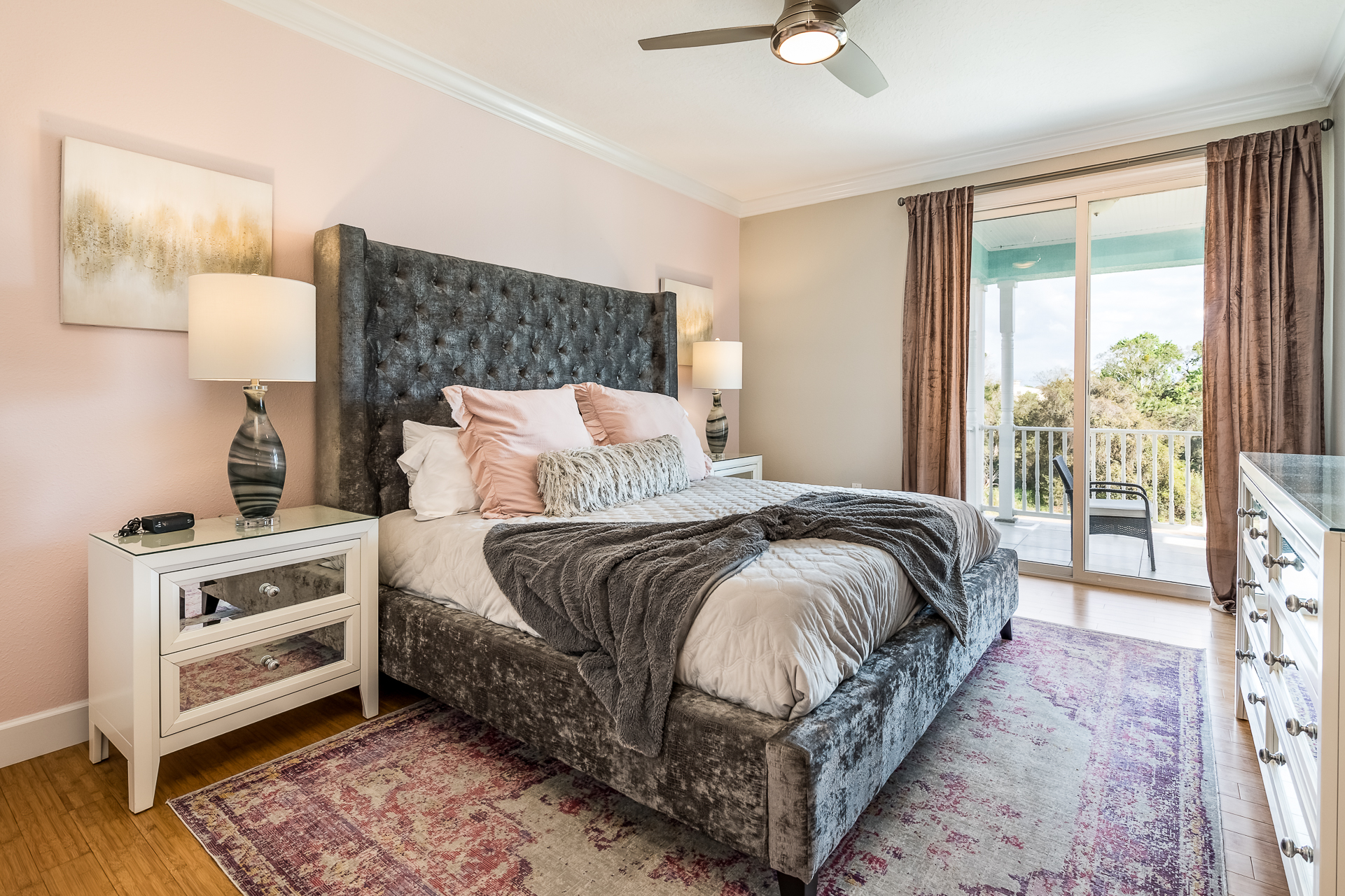 King sized bedroom with en suite (shower/bath combo), balcony access over the golf course