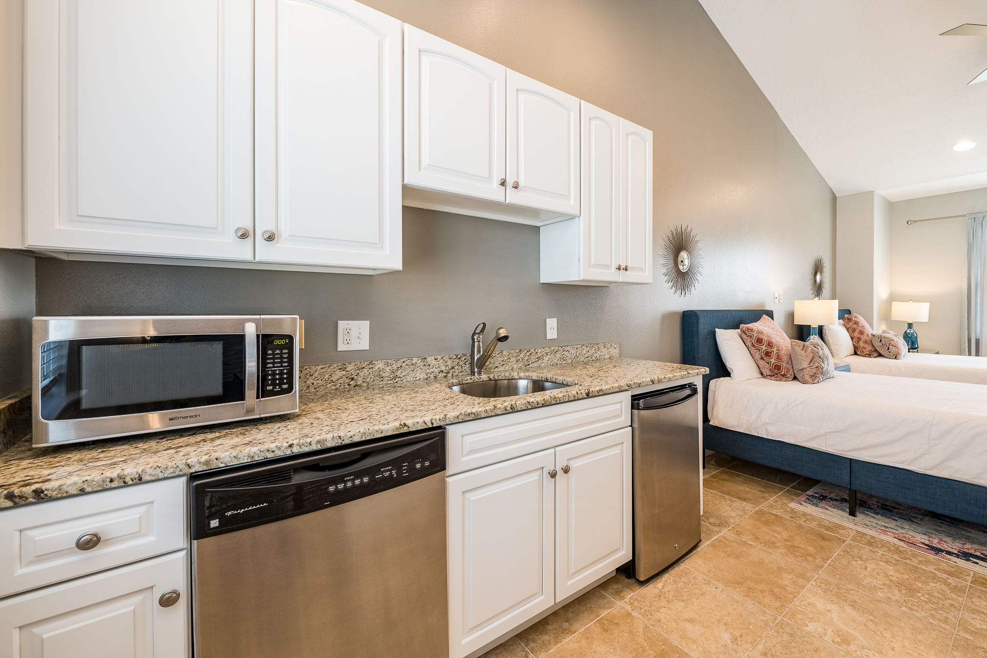 Private family suite (located across the courtyard) has a King sized bedroom with en suite (shower/bath combo), accent chair, and a living area with a small kitchen (dishwasher, microwave, mini fridge). 2 Full sized beds are located in the living area with no private entrance and shares the bathroom through the King sized bedroom