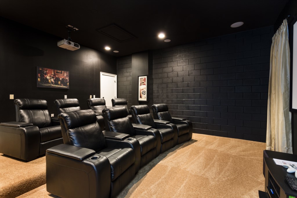 Home theater has tiered 8 seat leather recliners and a large projection screen