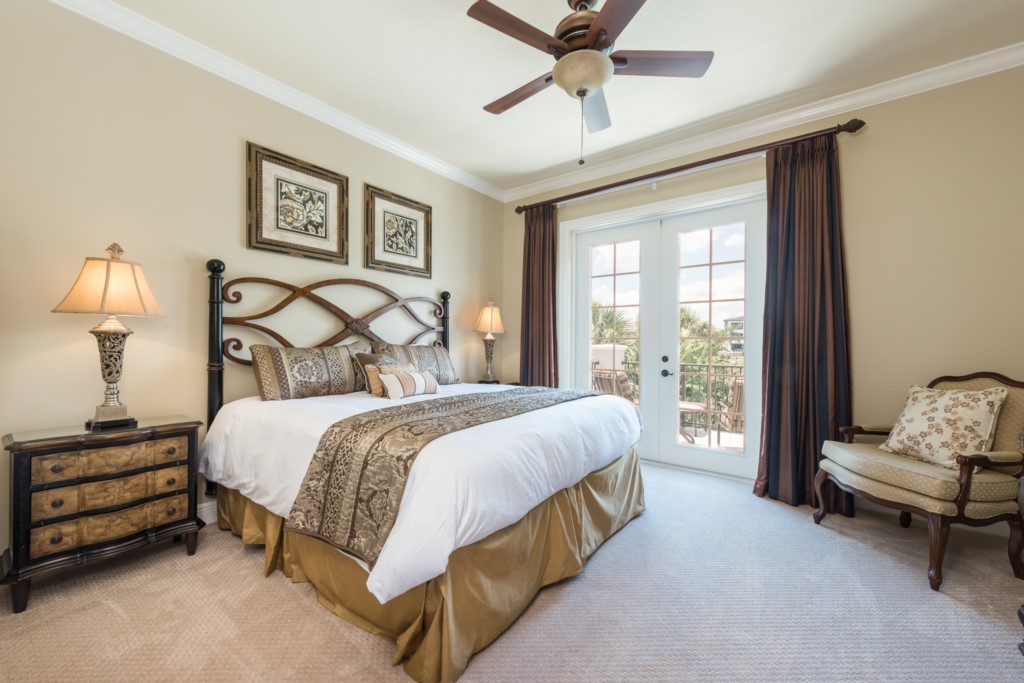 King sized master with en suite (shower, bath, two separate vanities), a large private balcony overlooking the fairway of the Jack Nicklaus golf course and an accent chair