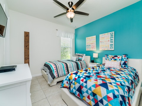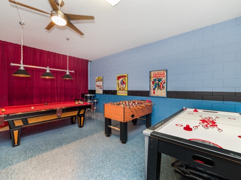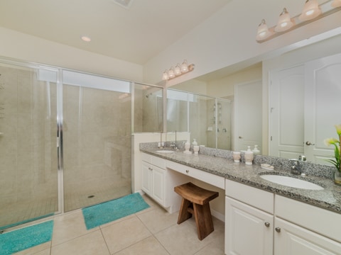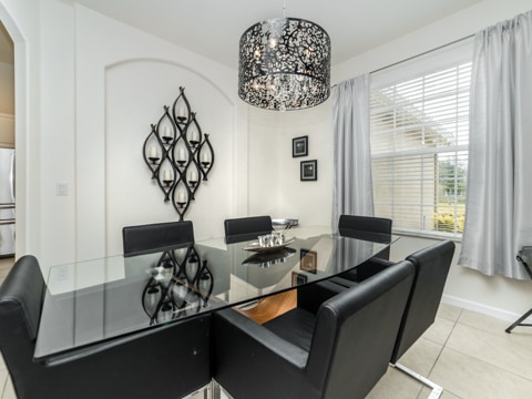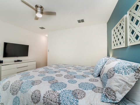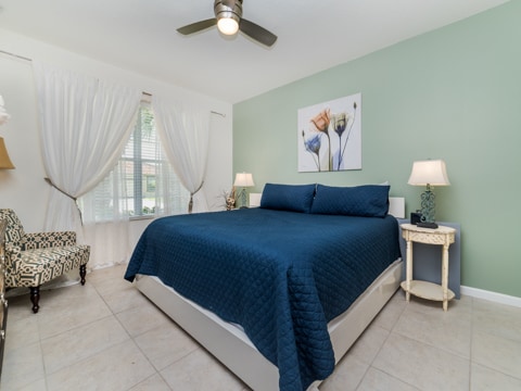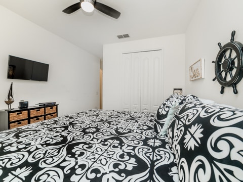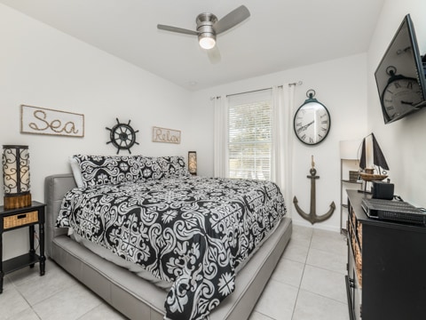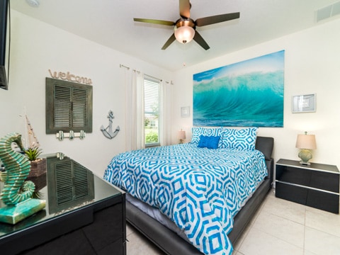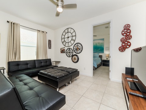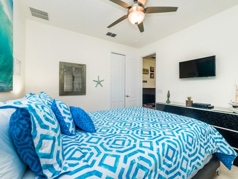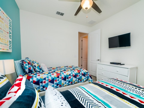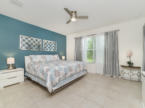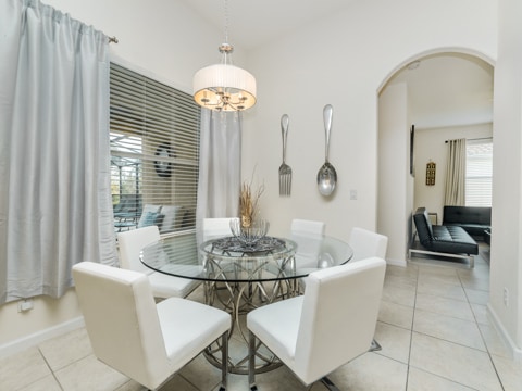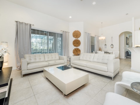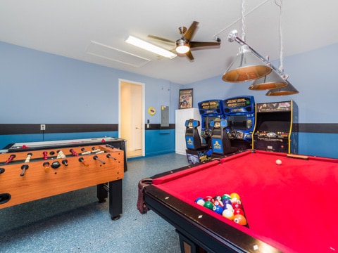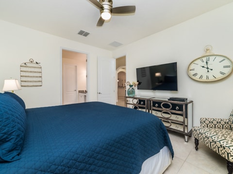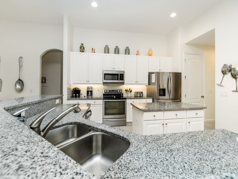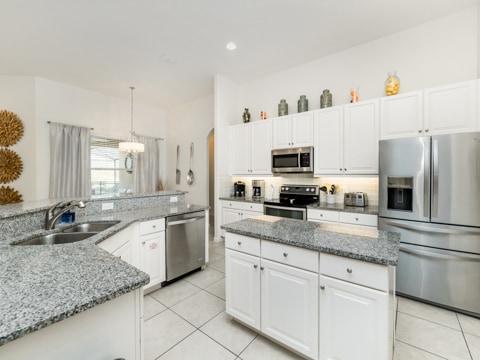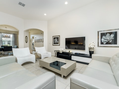 An expansive 5-bedroom, 4-bathroom home located in the resort community of Solterra awaits you. This one-story home is bright and airy with its white accents and colorful details. The living room is open with tall ceilings and plenty of seating for all your guests. Centered around a 60” flat screen TV, the white leather couches are cozy and stylish. The full kitchen is nearby with granite countertops, upgraded appliances and white cabinetry. The heart of the home is always the kitchen and that is no exception here. Plenty of space allows room for meals together, where you can share them at the adjacent dining room. This home has a second entertaining space with another 60” TV, perfect for the times when everyone wants their own space. With 5 bedrooms, everyone has a comfortable place to sleep on your vacation. Three king bedrooms, 1 queen bedroom and 1 room with 2 twins sleeps a total of 10 guests. Each bedroom is filled with warm neutral colors designed for maximum relaxation. Do not forget that there is a full washer and dryer as well as free WiFi for you to use for your convenience. Last but not least, the private pool in this home is made for vacation. Lined with pool chairs, you have the option to swim and splash or relax in the sun all day. When you’re all sunned out, head inside and play some games in the gameroom. Foosball, billiards and a few more classics fill the room where you can compete all day. The Solterra clubhouse is also just a short walk away with a huge pool, lazy river and clubhouse. Book your stay today in this gorgeous home!