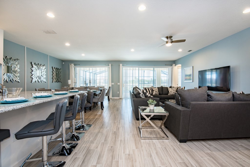 With views over the pool deck, the family living area includes comfortable seating, sectional sofa and a large flat screen TV.